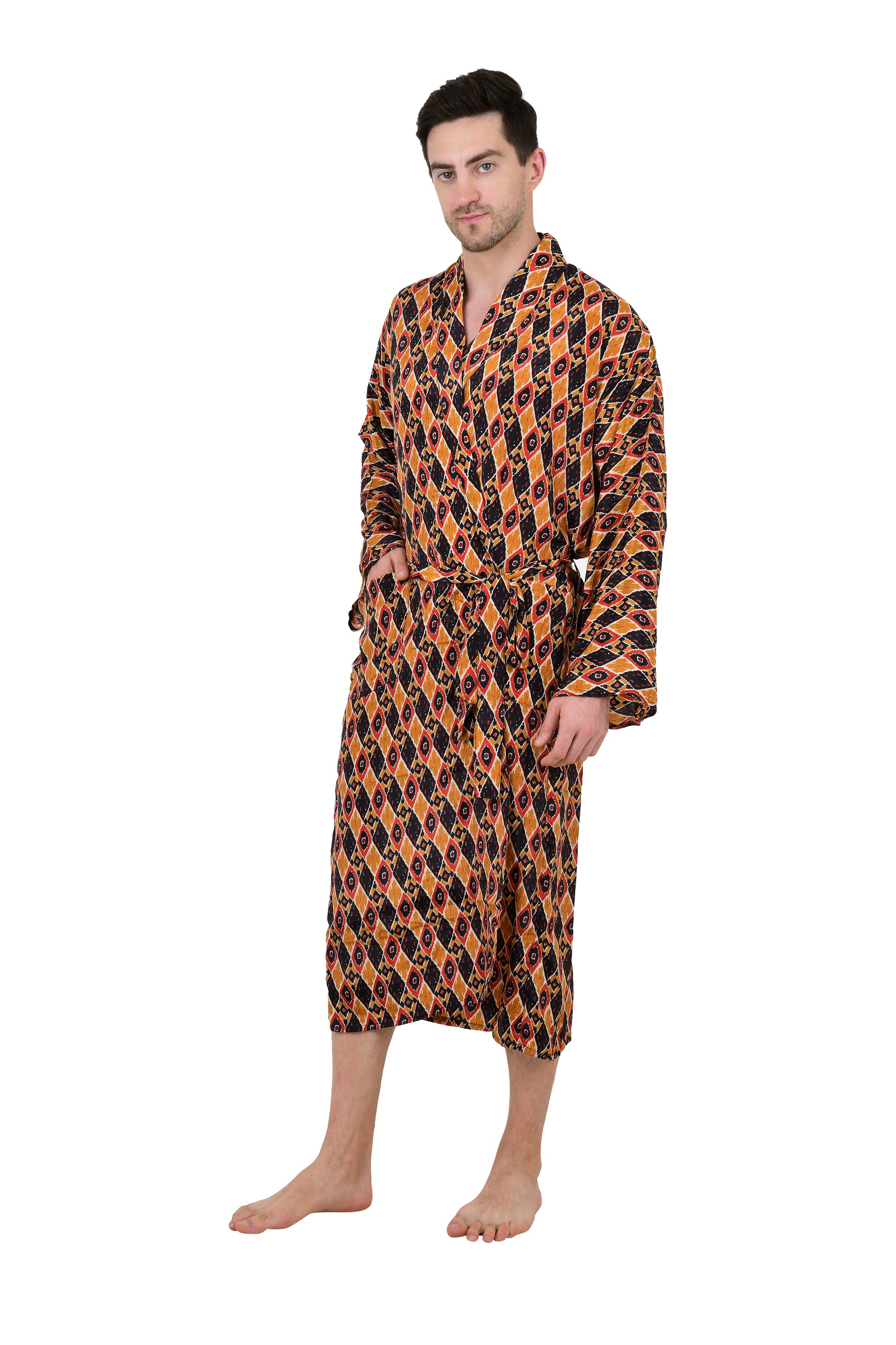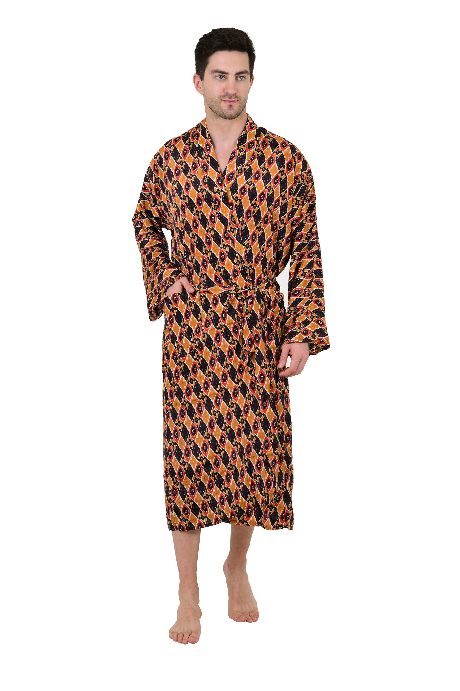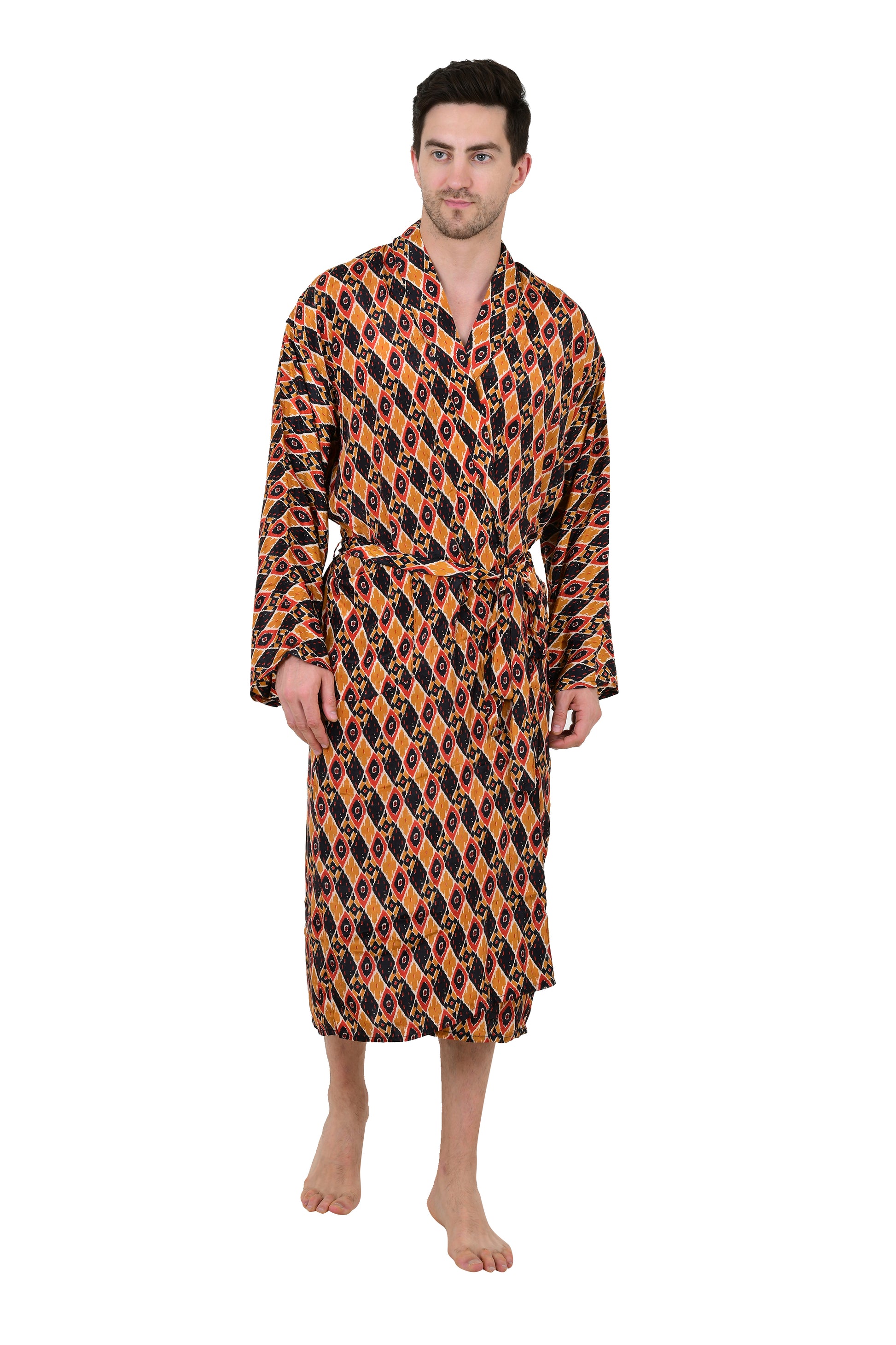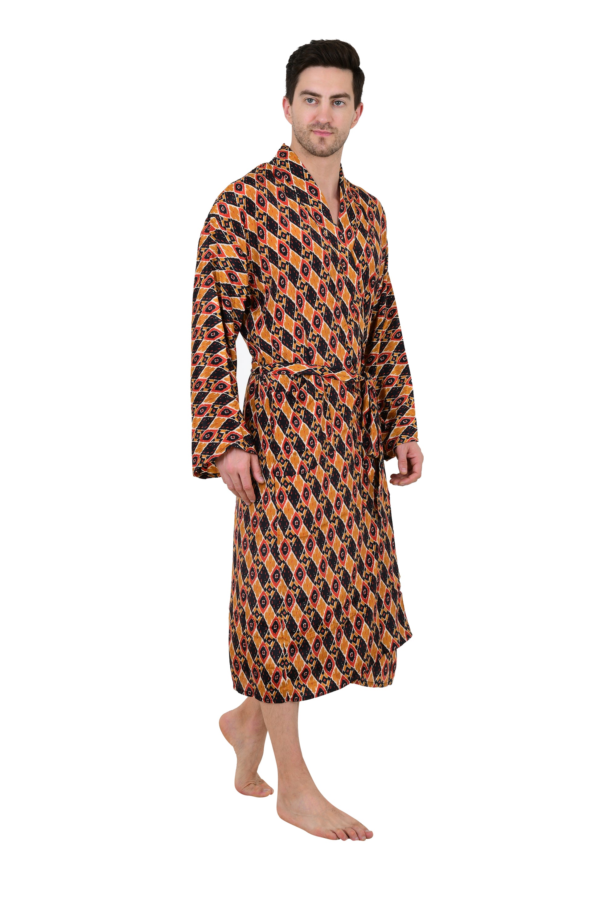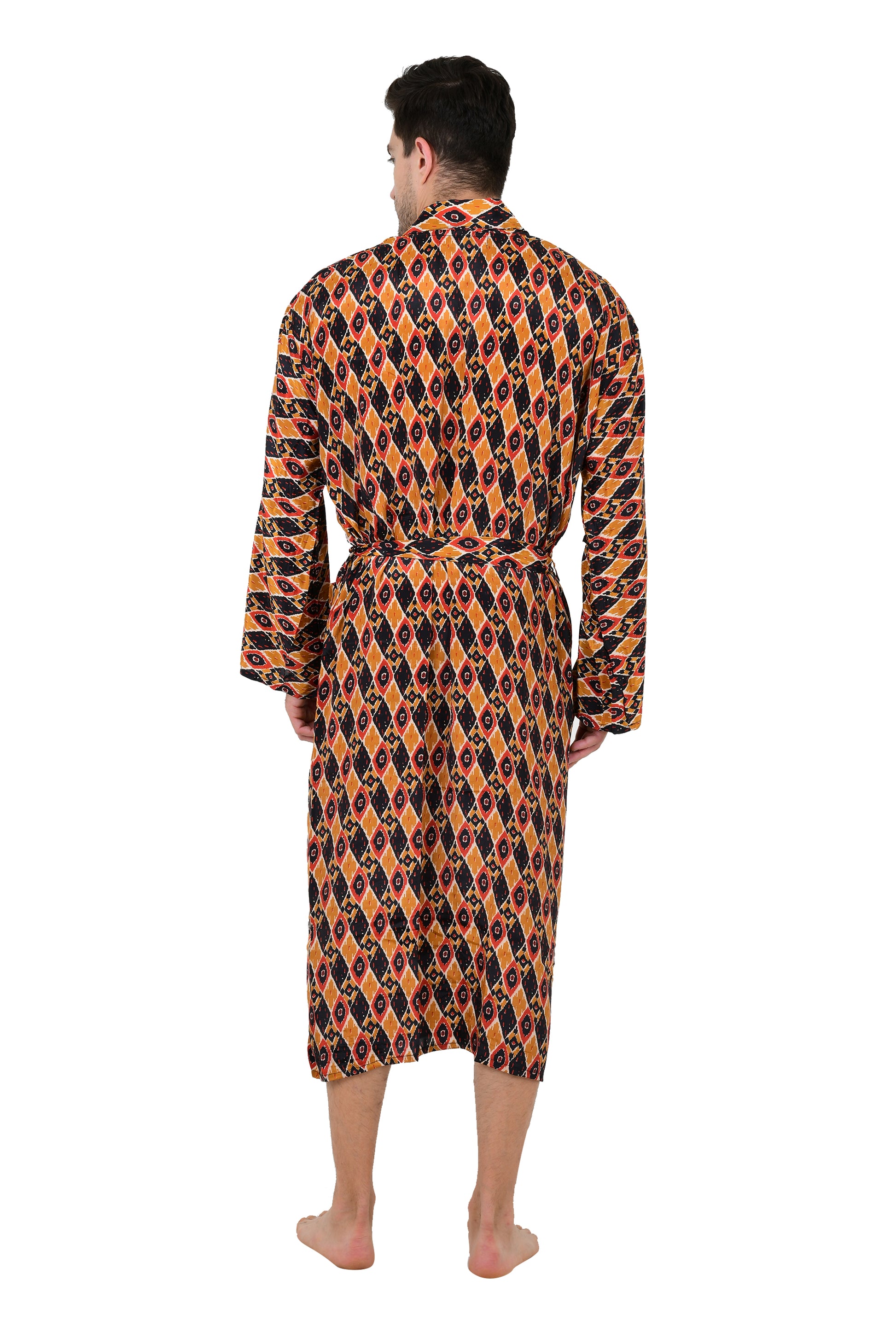Boho Men's Soft Silk Kimono, Man Regal House Beach Robe, Persian King Ikat Elegant Yellow Black Hues