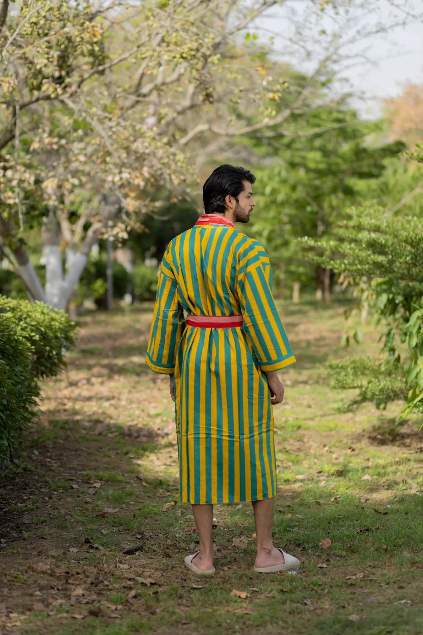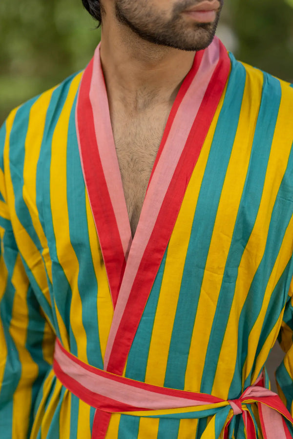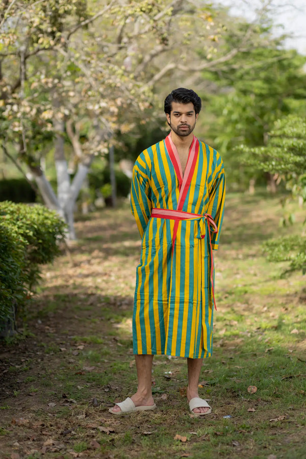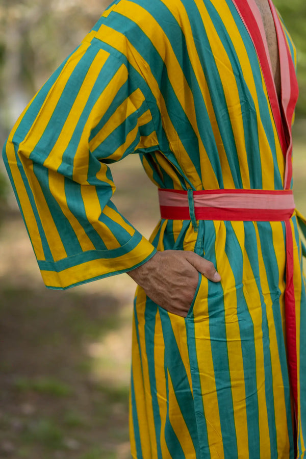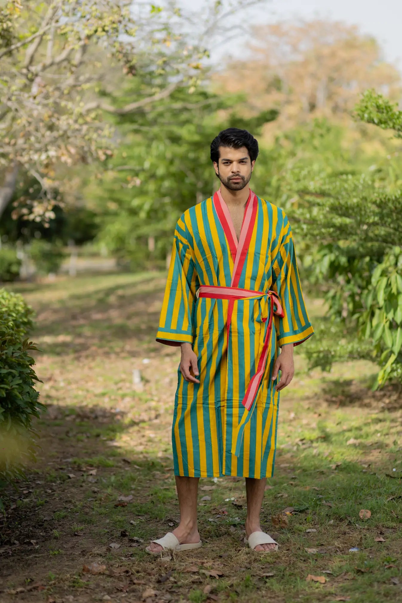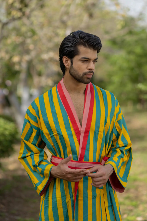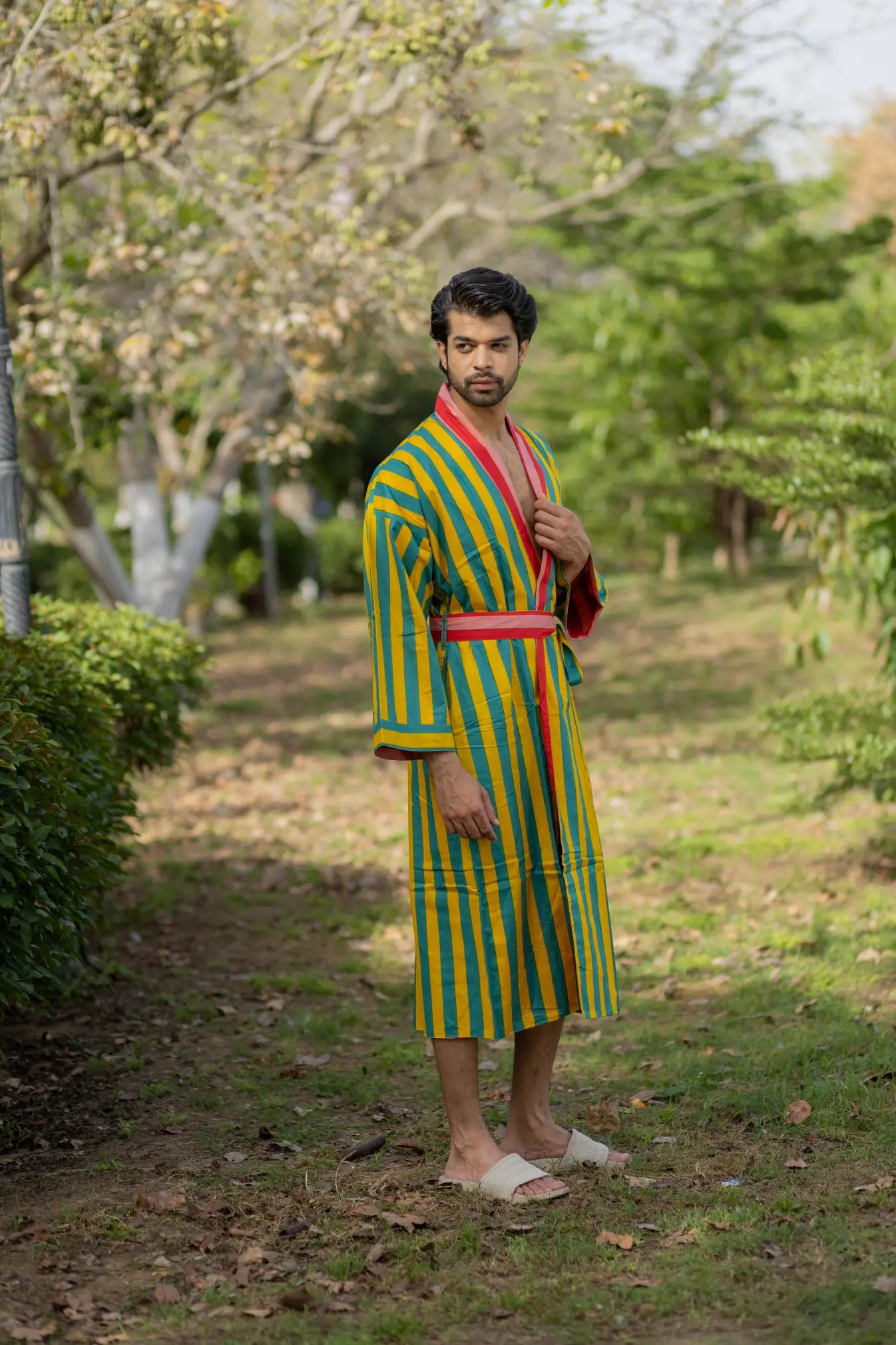 Pure Cotton Boho Men Kimono Robe | Geometric Luxury Dressing Gown Summer Loungewear, Reversible Unisex Bathrobe Relaxed Fit Beach Outfit