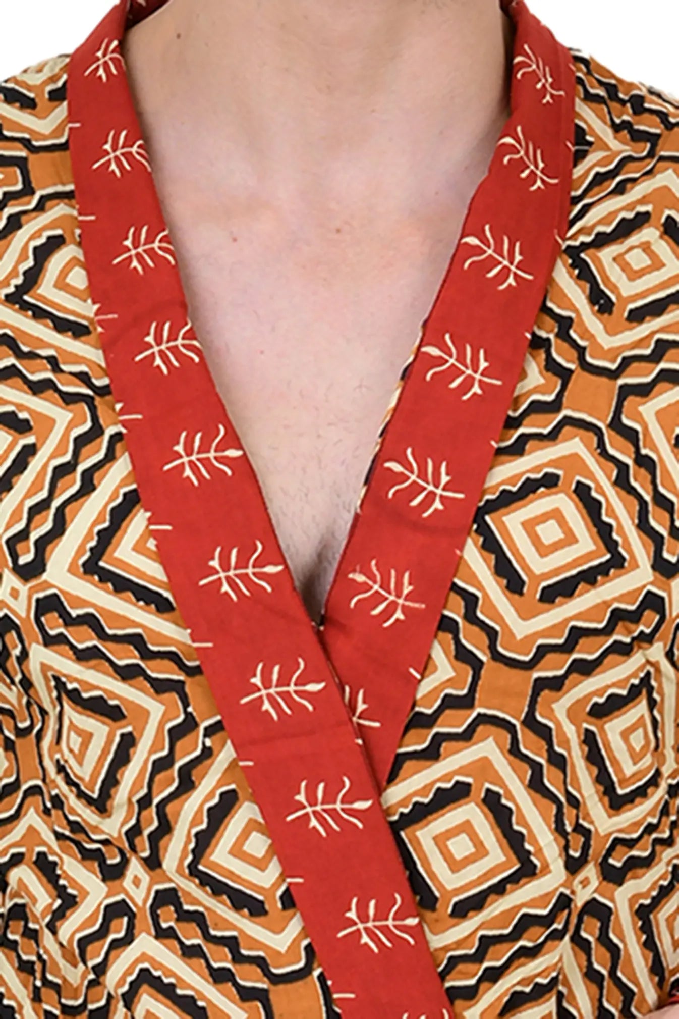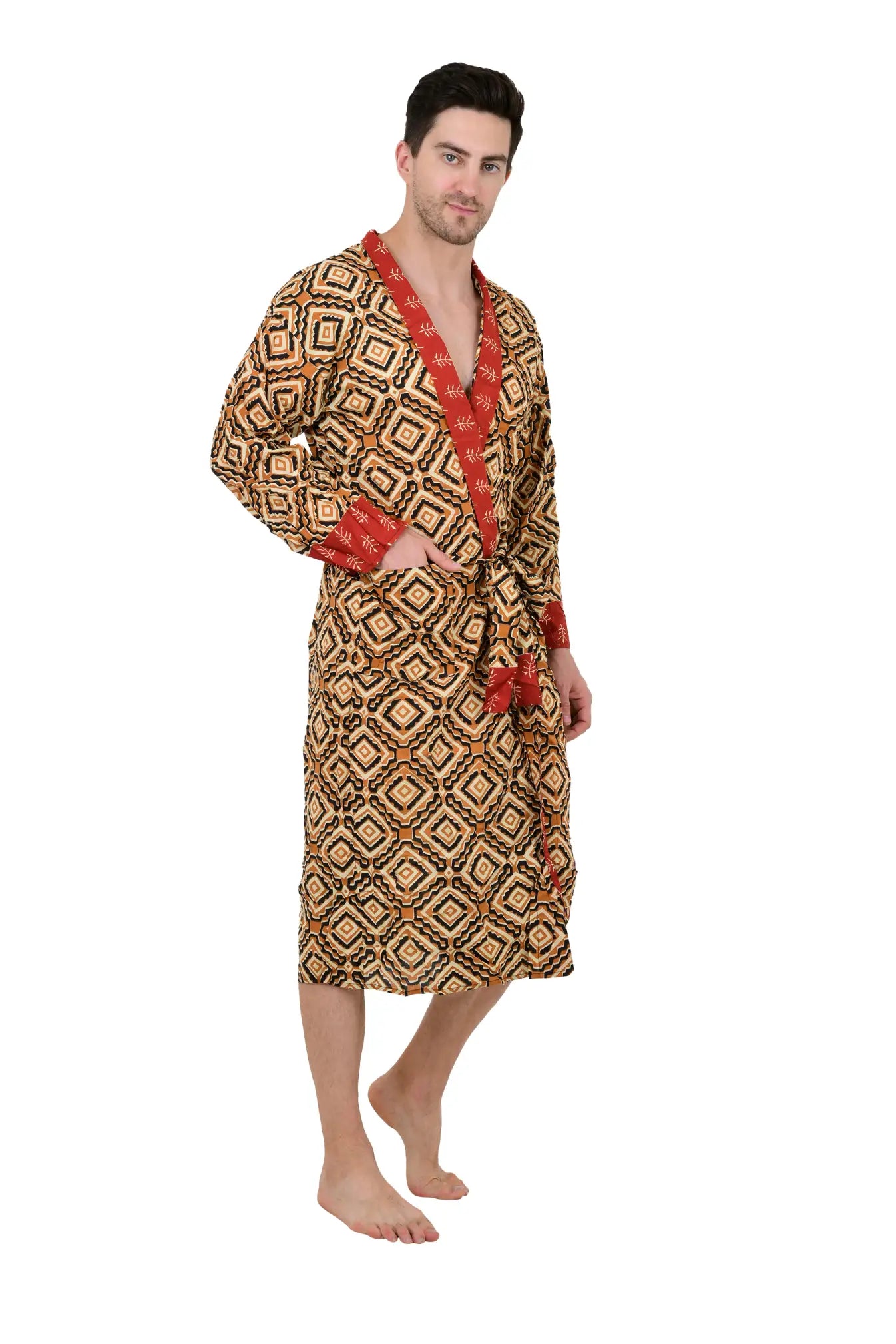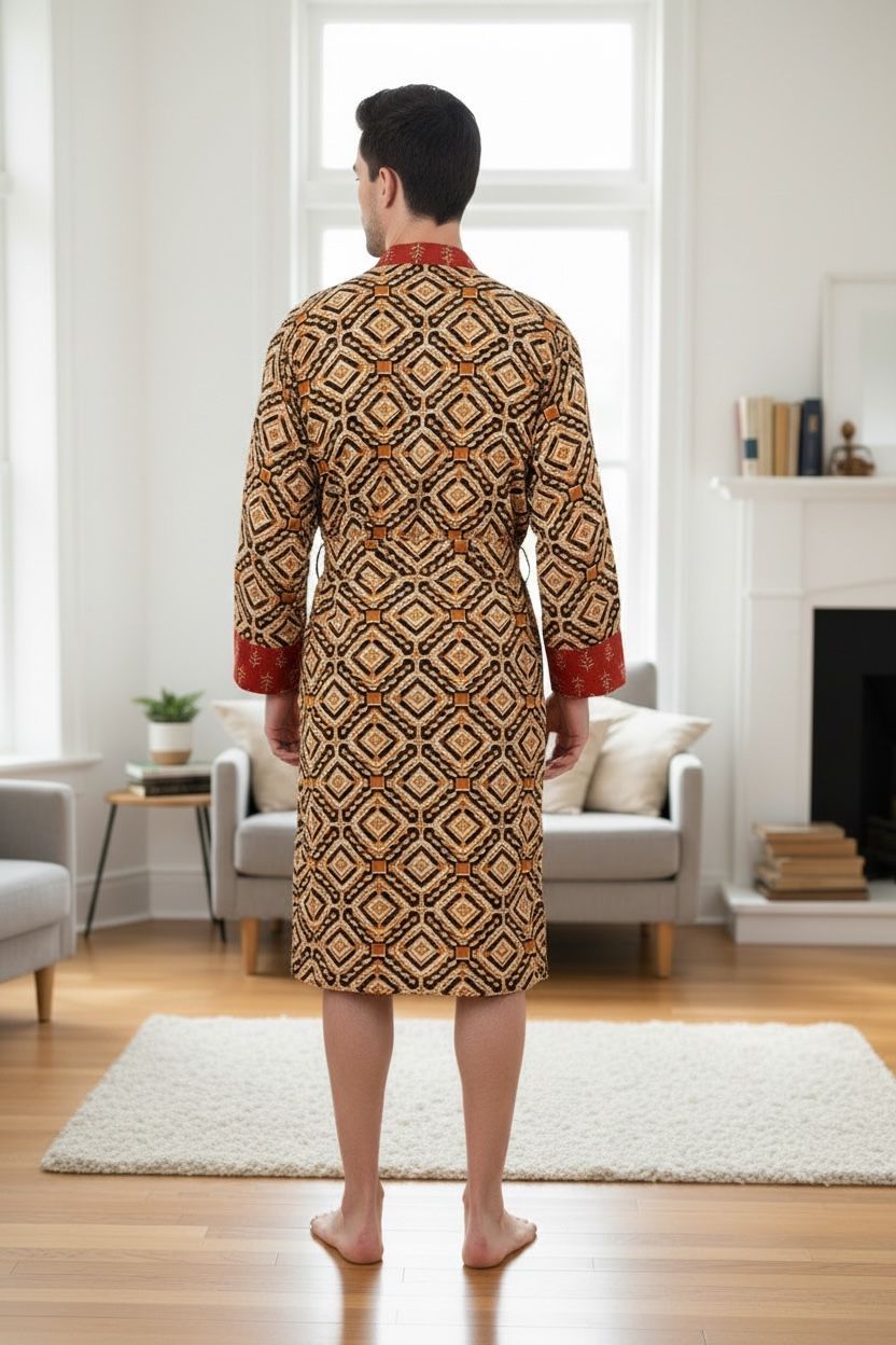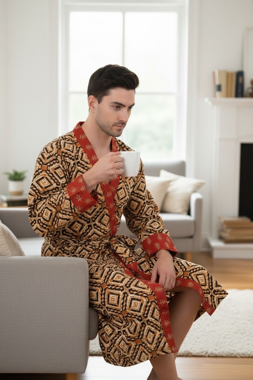 This Pure Cotton Handblock Kimono offers breathable comfort, artisan quality, and versatile styling—an effortless men’s house robe designed for everyday relaxation.