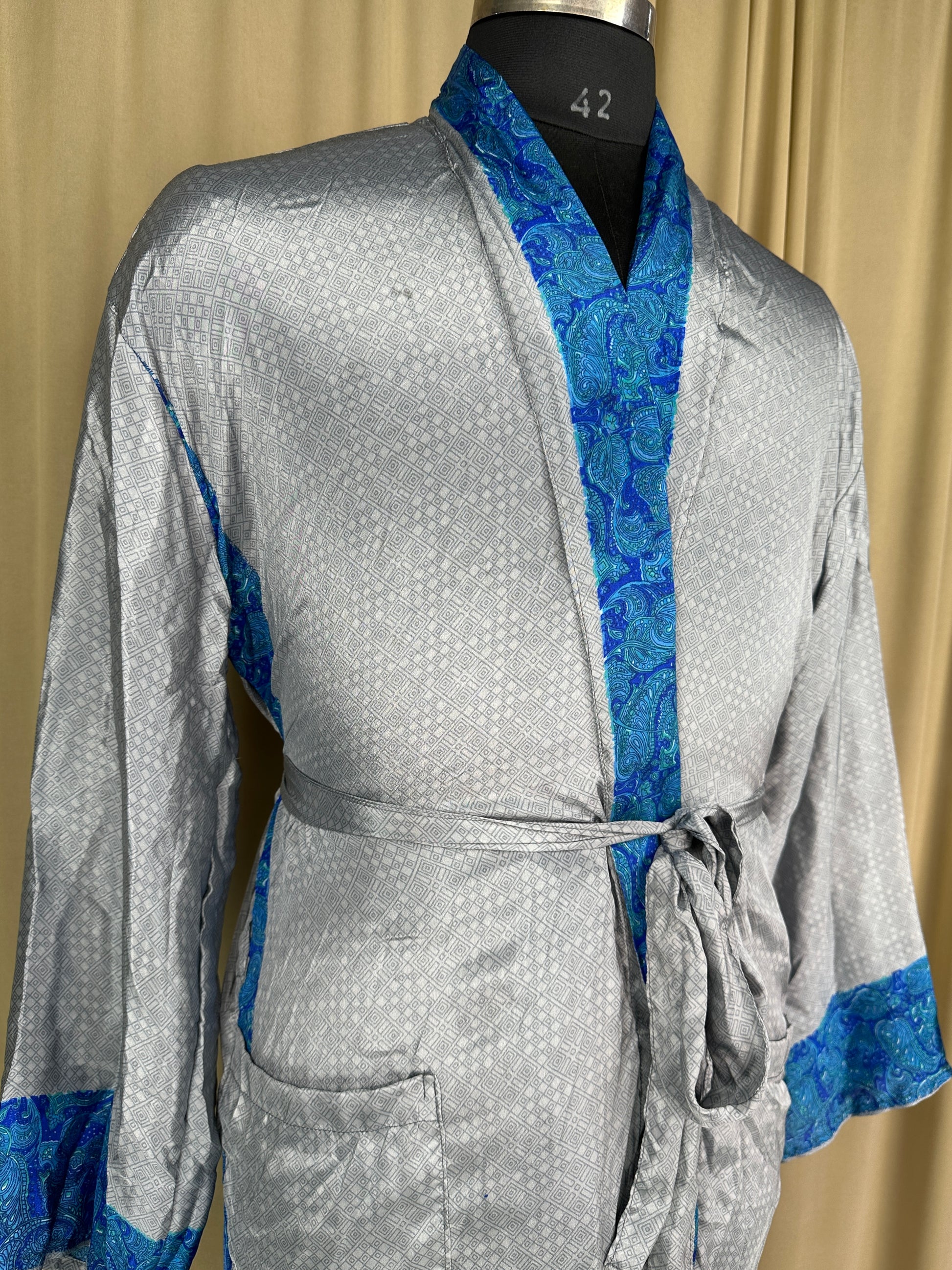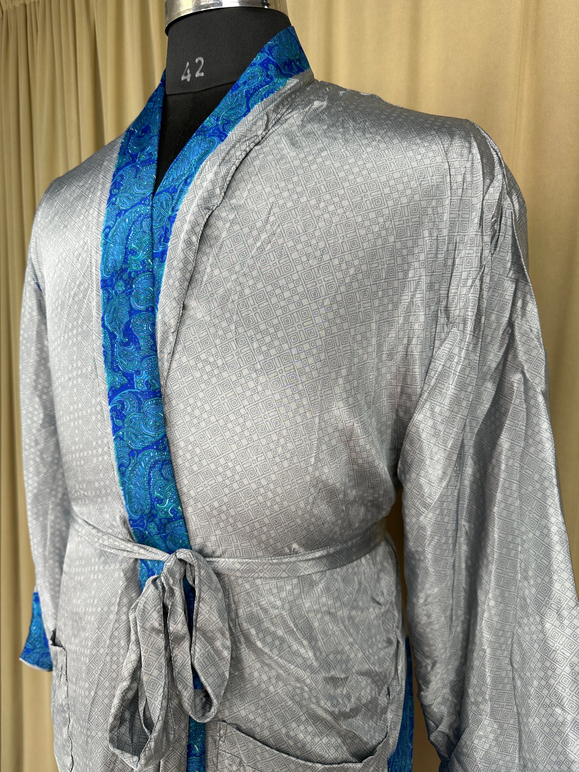 Silky Soft Men’s Kimono Robe, Masculine Elegant Classic Sustainable Vintage House Robe gift, Timeless Comfy Lounge Beach Wear Gray Geometric