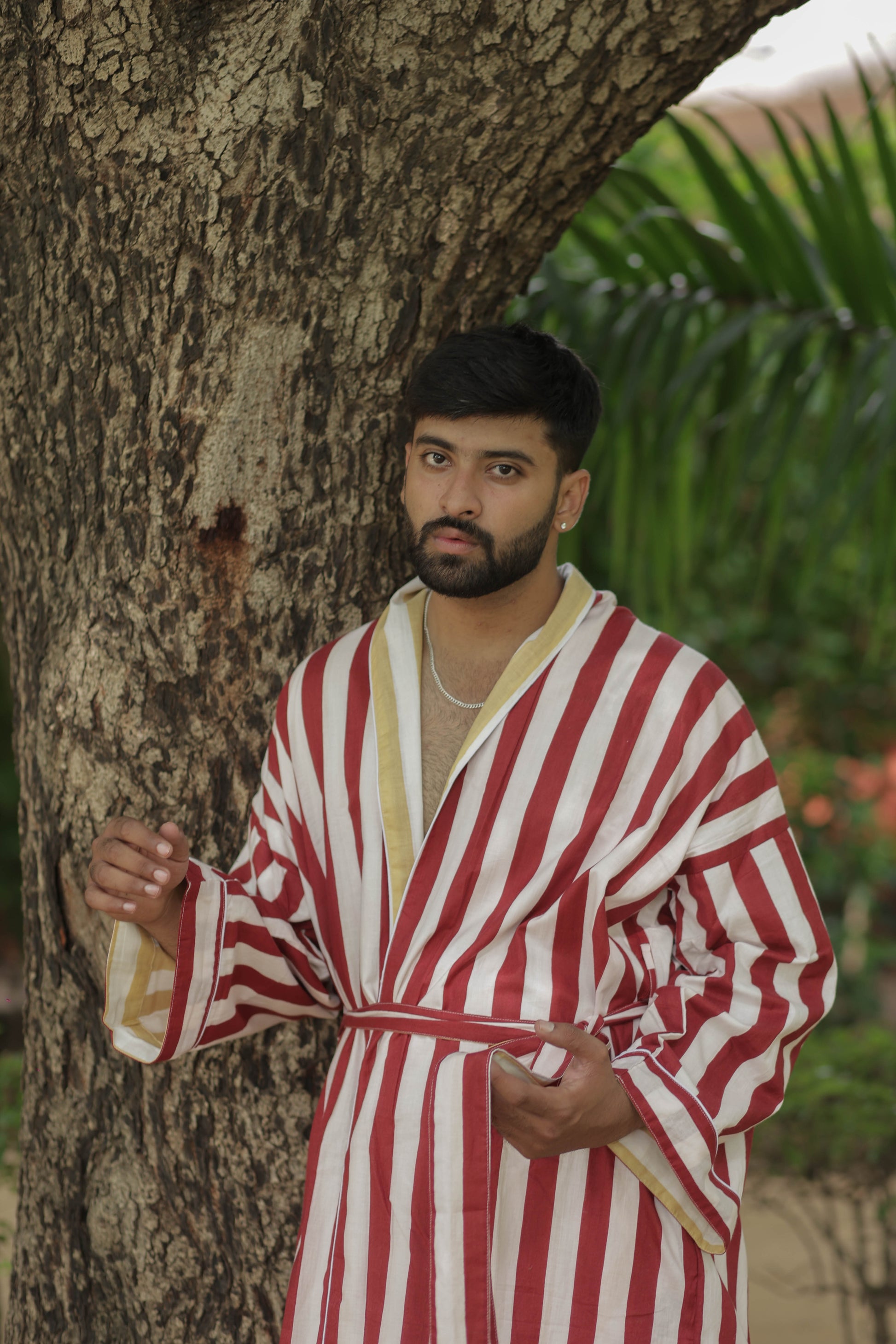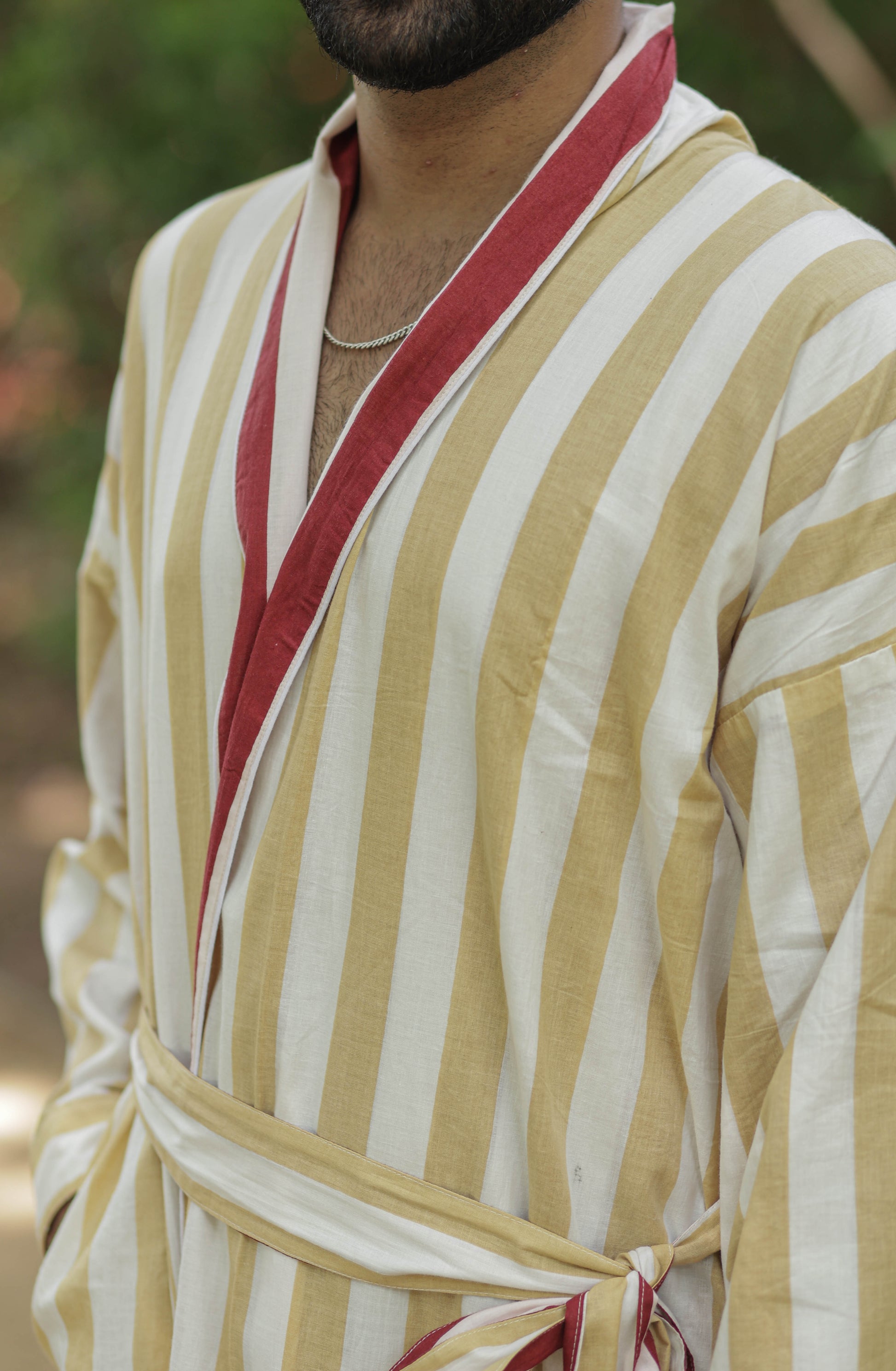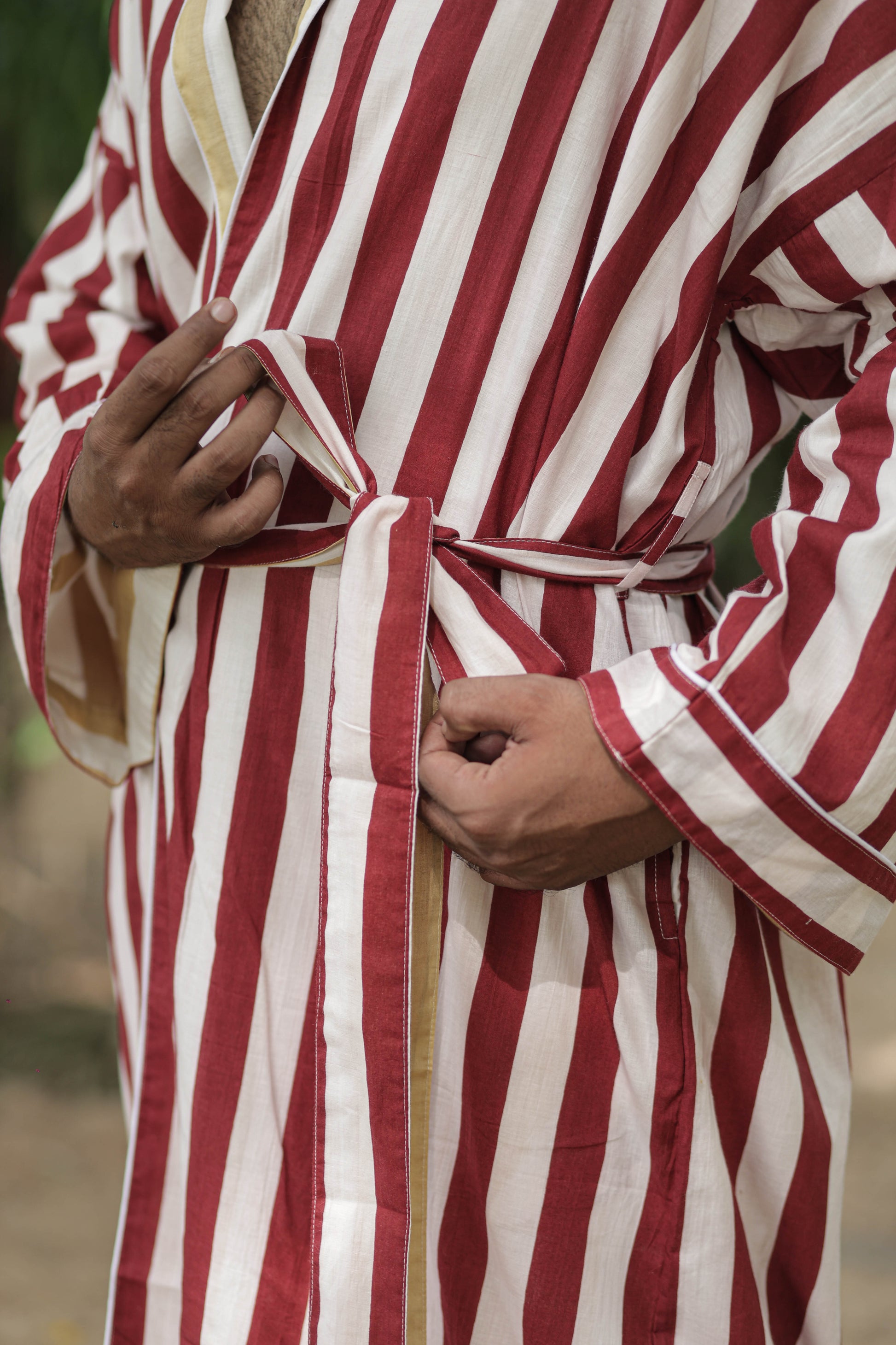 Discover the ultimate in comfort and style with The Eastern Loom’s Men Kimono Robe, crafted from 100% breathable cotton. This long kimono robe features a timeless striped print and a unique reversible design, allowing you to enjoy two looks in one. With spacious pockets on both sides, this robe is as practical as it is stylish, perfect for lounging at home, relaxing on holiday, or making a statement at festivals and resorts. The boho-inspired look adds a touch of effortless sophistication, while the one-size fit ensures comfort for a wide range of body types.