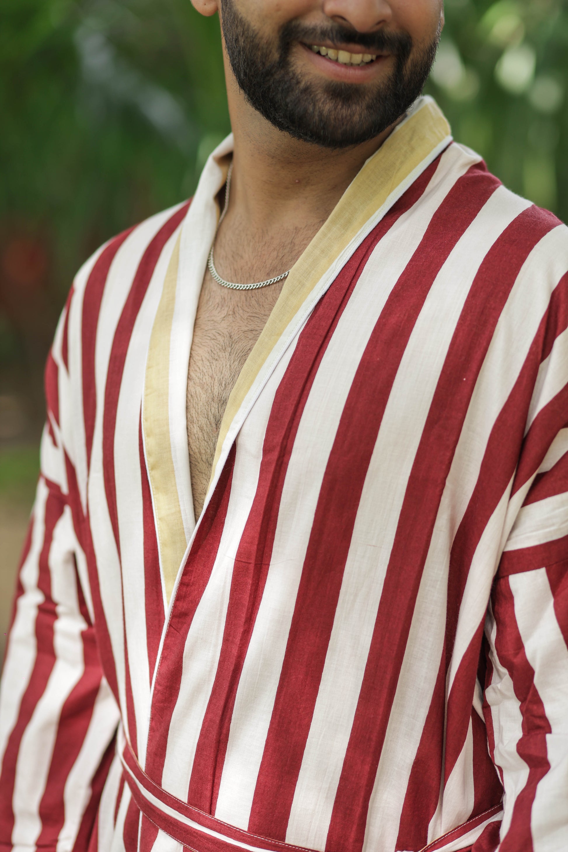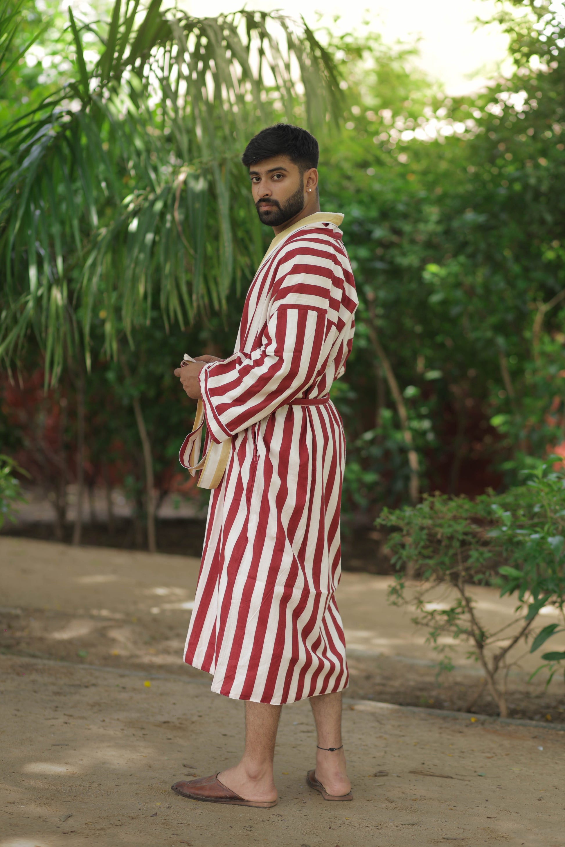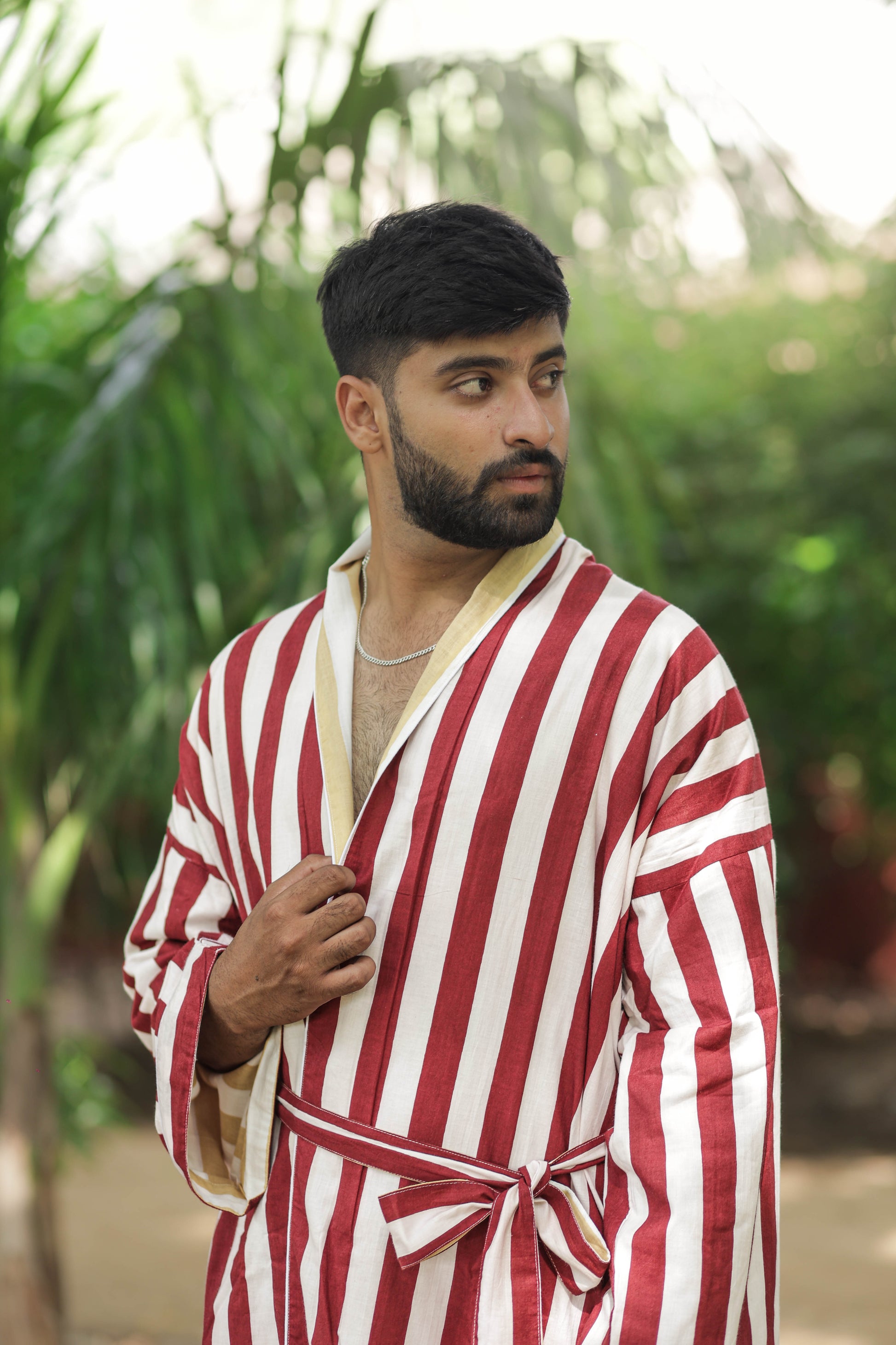 Discover the ultimate in comfort and style with The Eastern Loom’s Men Kimono Robe, crafted from 100% breathable cotton. This long kimono robe features a timeless striped print and a unique reversible design, allowing you to enjoy two looks in one. With spacious pockets on both sides, this robe is as practical as it is stylish, perfect for lounging at home, relaxing on holiday, or making a statement at festivals and resorts. The boho-inspired look adds a touch of effortless sophistication, while the one-size fit ensures comfort for a wide range of body types.