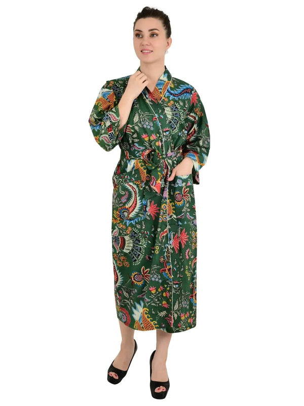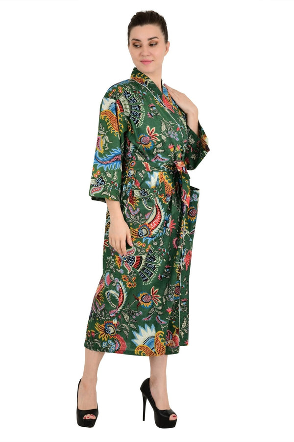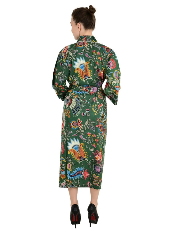 Boho Cotton Kimono House Robe Indian Handprinted Botanical Print Pattern | Lightweight Summer Luxury Beach Holidays Yacht Cover Up Stunning Dress