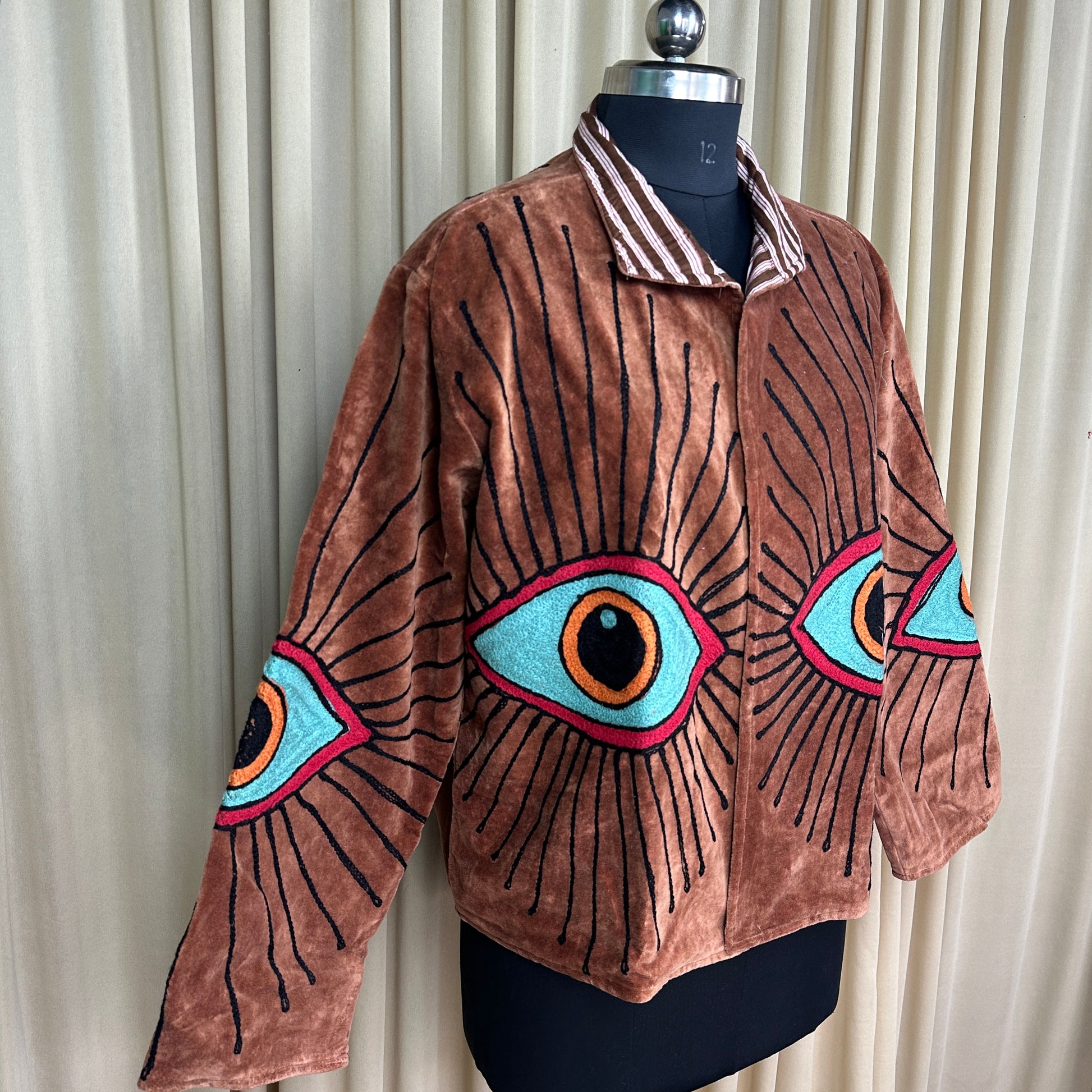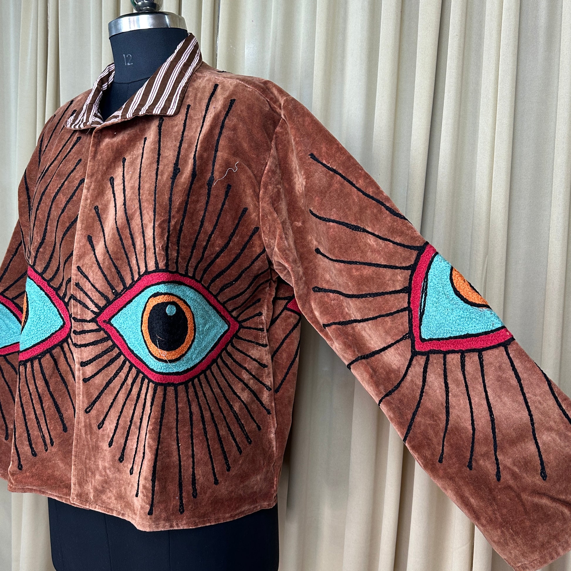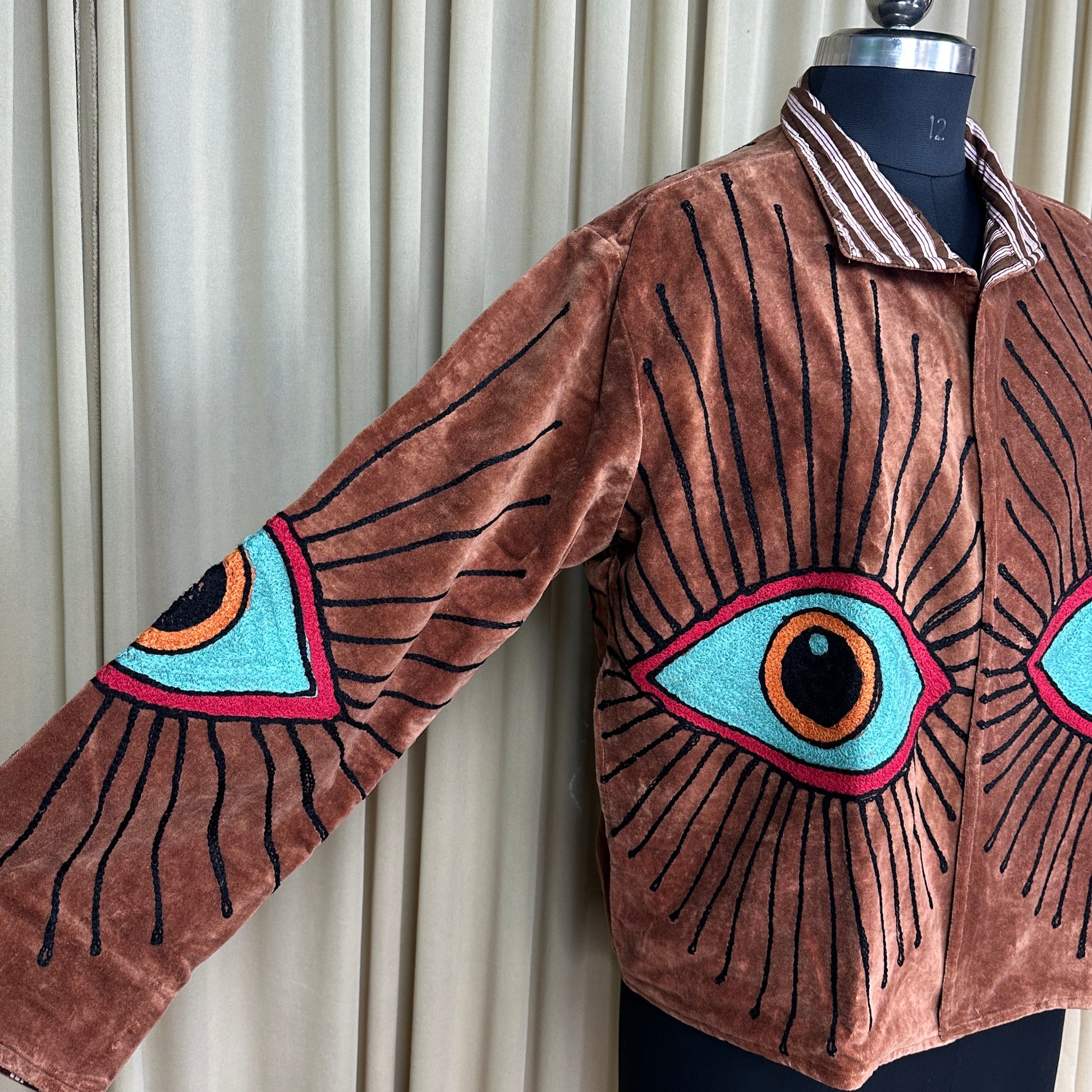 Wrap yourself in timeless artistry with this handcrafted Hand Embroidered Velvet Suzani Jacket, a stunning blend of boho charm and royal elegance. Each piece is meticulously embroidered by skilled artisans, creating a one-of-a-kind Geometric pattern that transforms this jacket into wearable art. The rich Brown velvet adds depth, luxury, and a soft drape, making it perfect for elevating everyday outfits or adding statement style to special occasions.