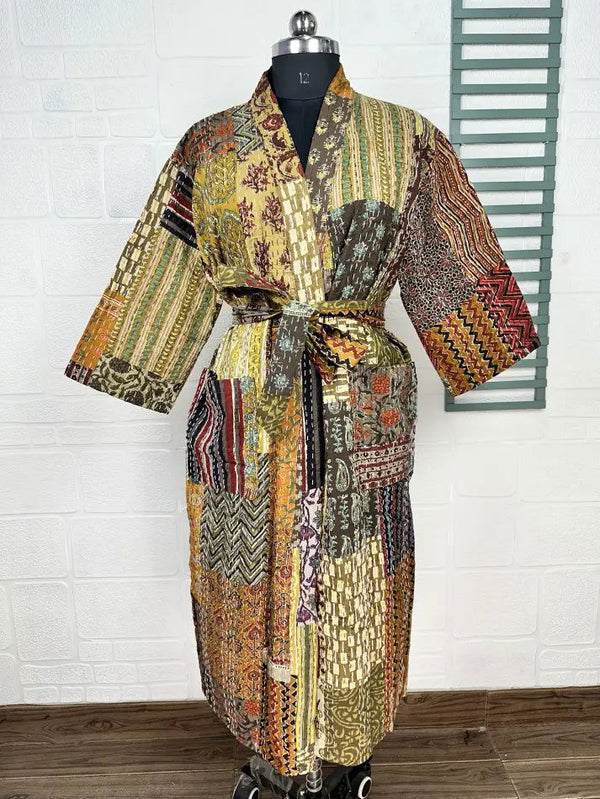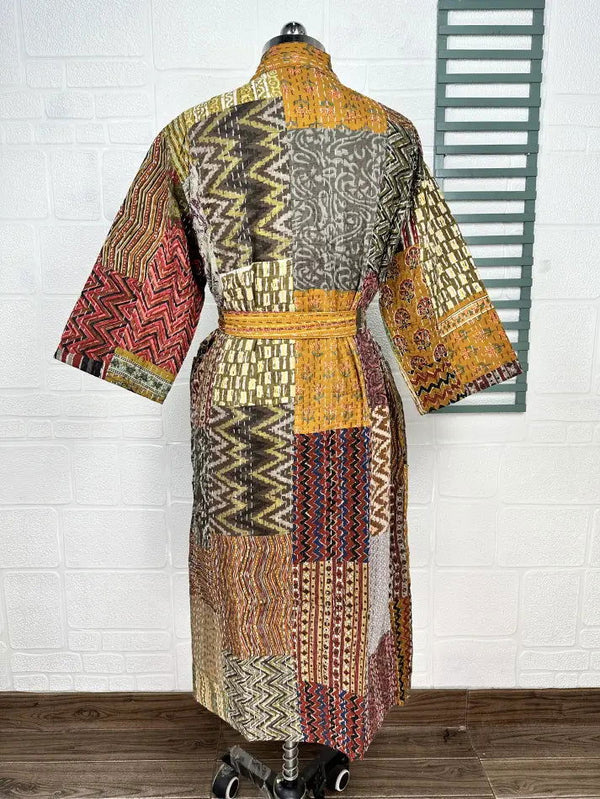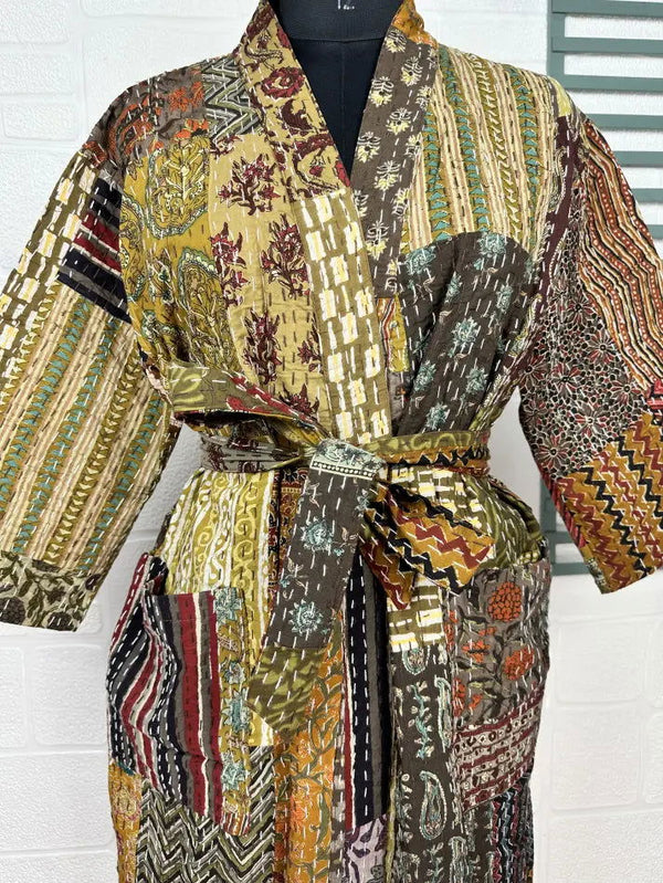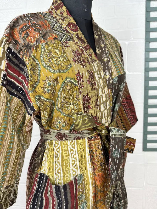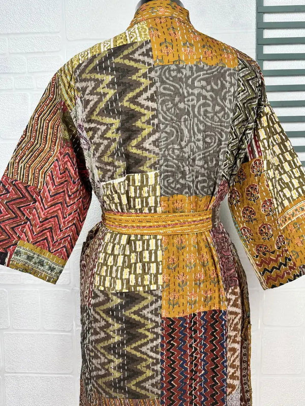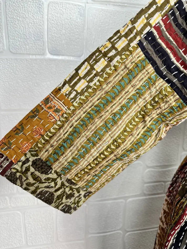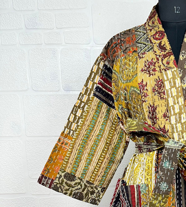 Kantha Pure Cotton Reversible Short Kimono Women Jacket Patchwork Beige Brown