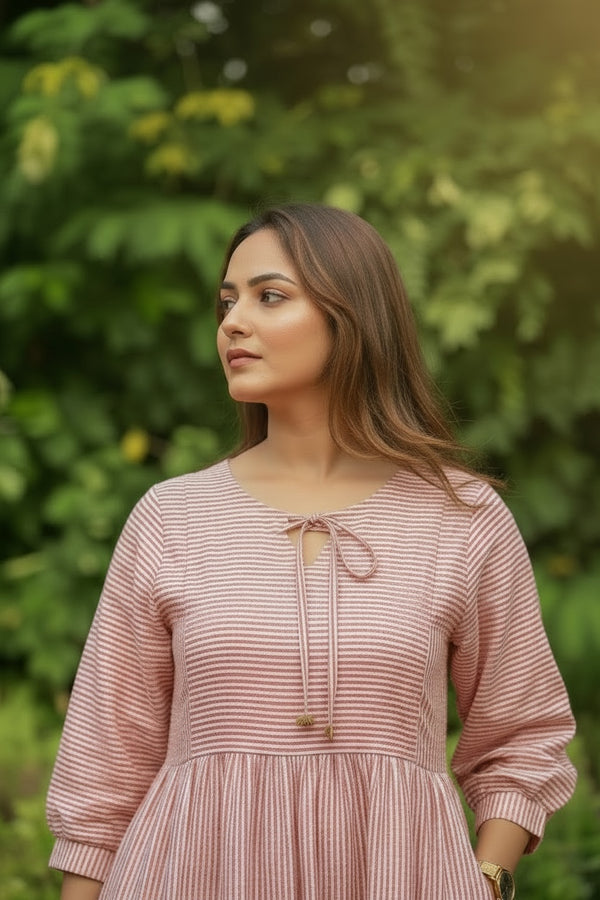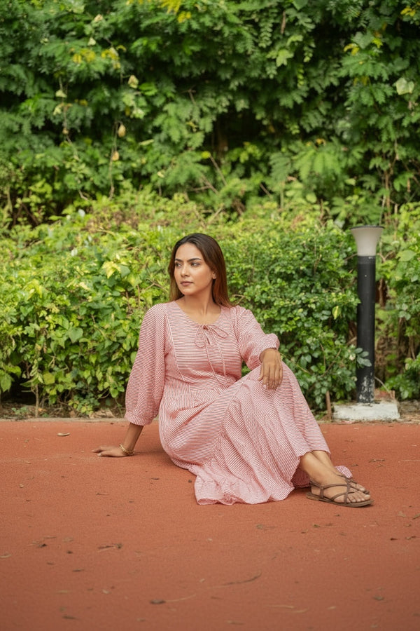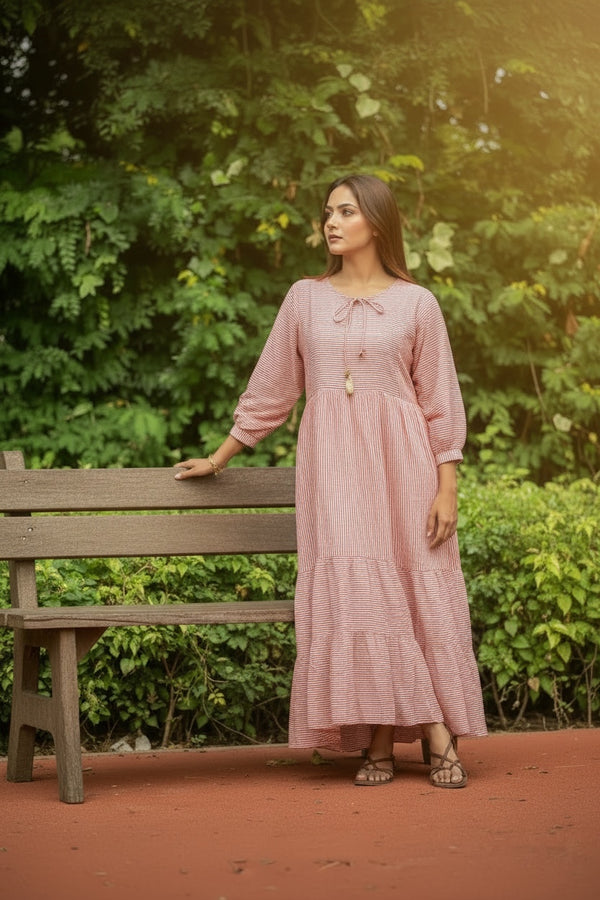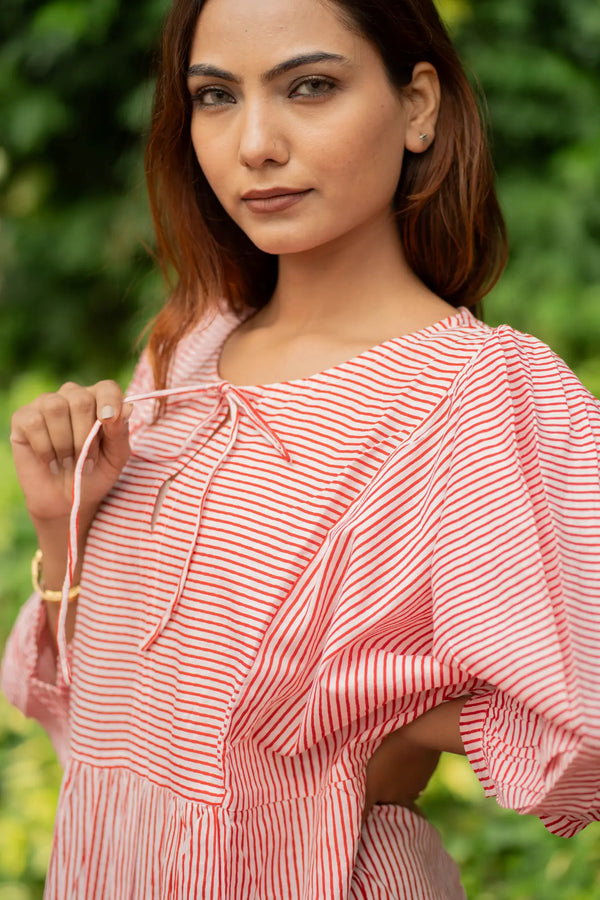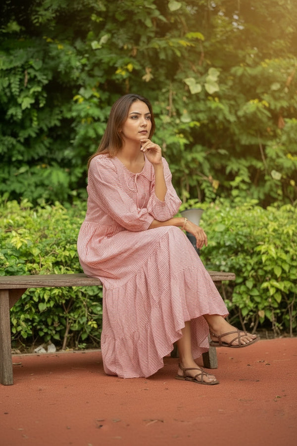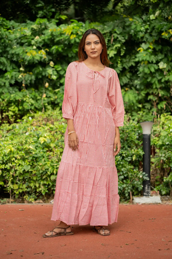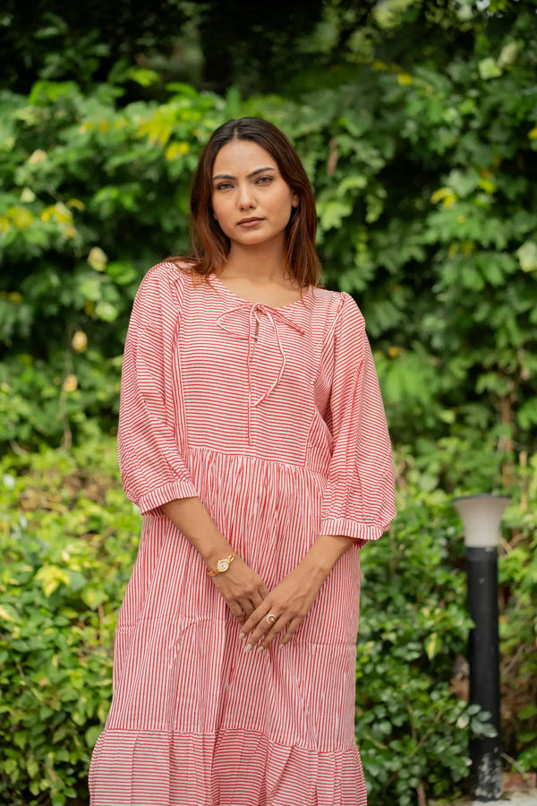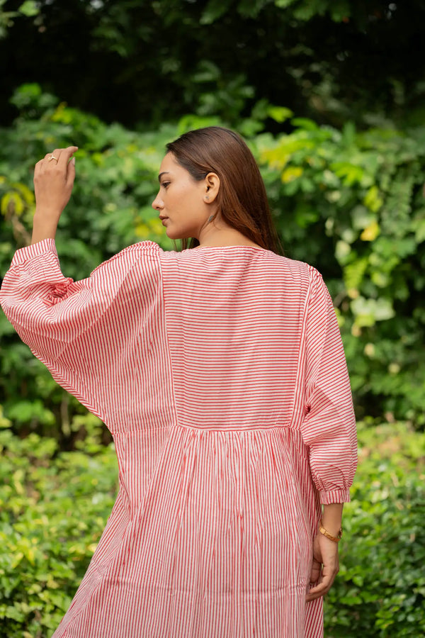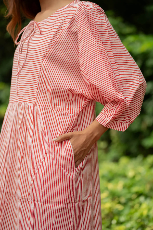 Stripe Hand Block Print Cotton Midi Dress - Boho Summer Sundress with Pockets, Lightweight Artisan Style, Gift for Her Beach Vacation Wear!!