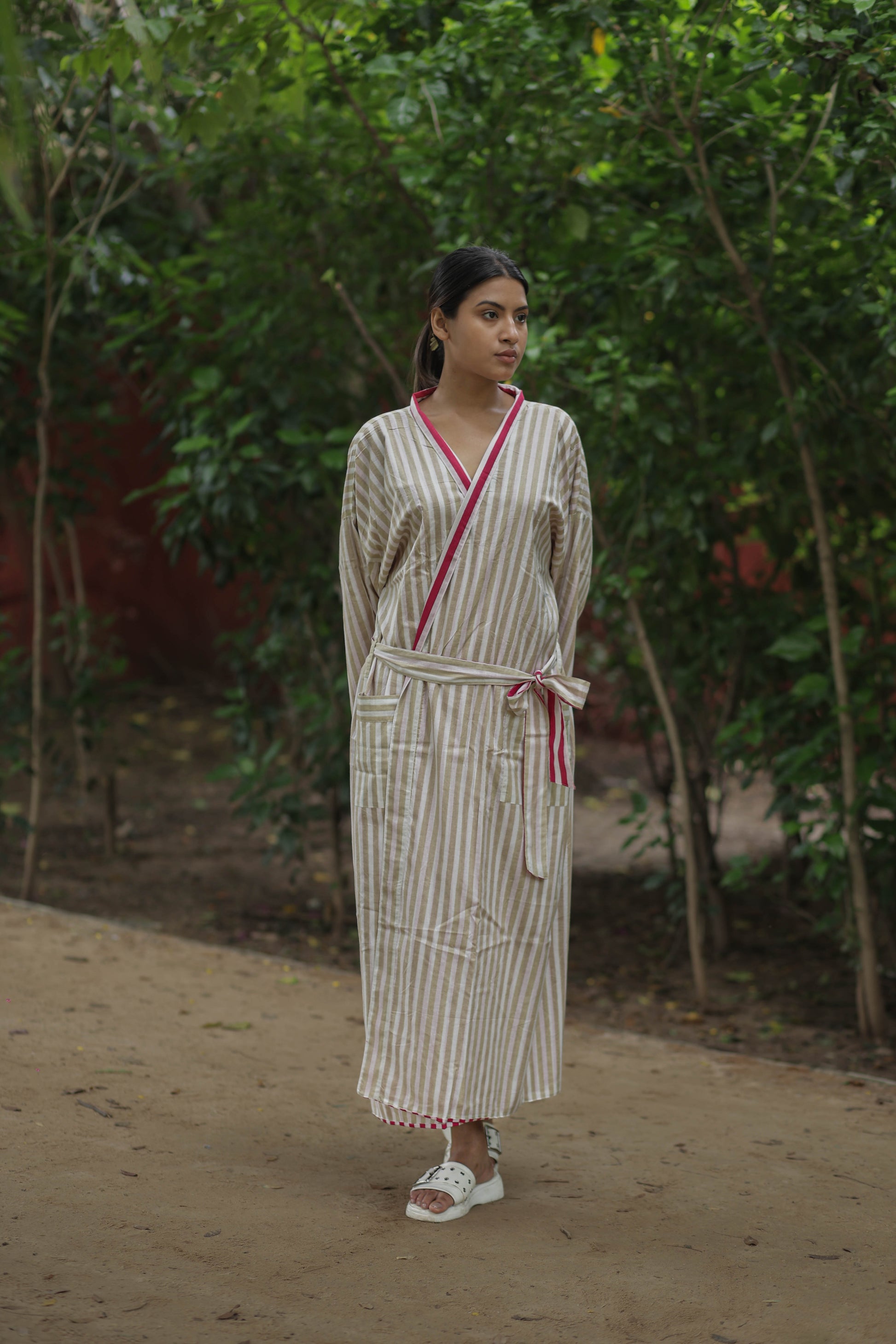 Discover the ultimate in comfort and style with The Eastern Loom’s Men Kimono Robe, crafted from 100% breathable cotton. This long kimono robe features a timeless striped print and a unique reversible design, allowing you to enjoy two looks in one. With spacious pockets on both sides, this robe is as practical as it is stylish, perfect for lounging at home, relaxing on holiday, or making a statement at festivals and resorts. The boho-inspired look adds a touch of effortless sophistication, while the one-size fit ensures comfort for a wide range of body types.