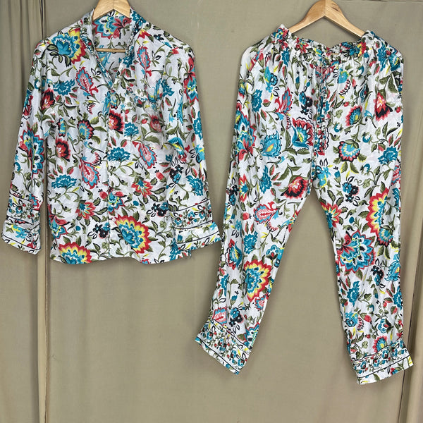 Silk Blend PJ Set | White Floral Silky Soft Pajama Set