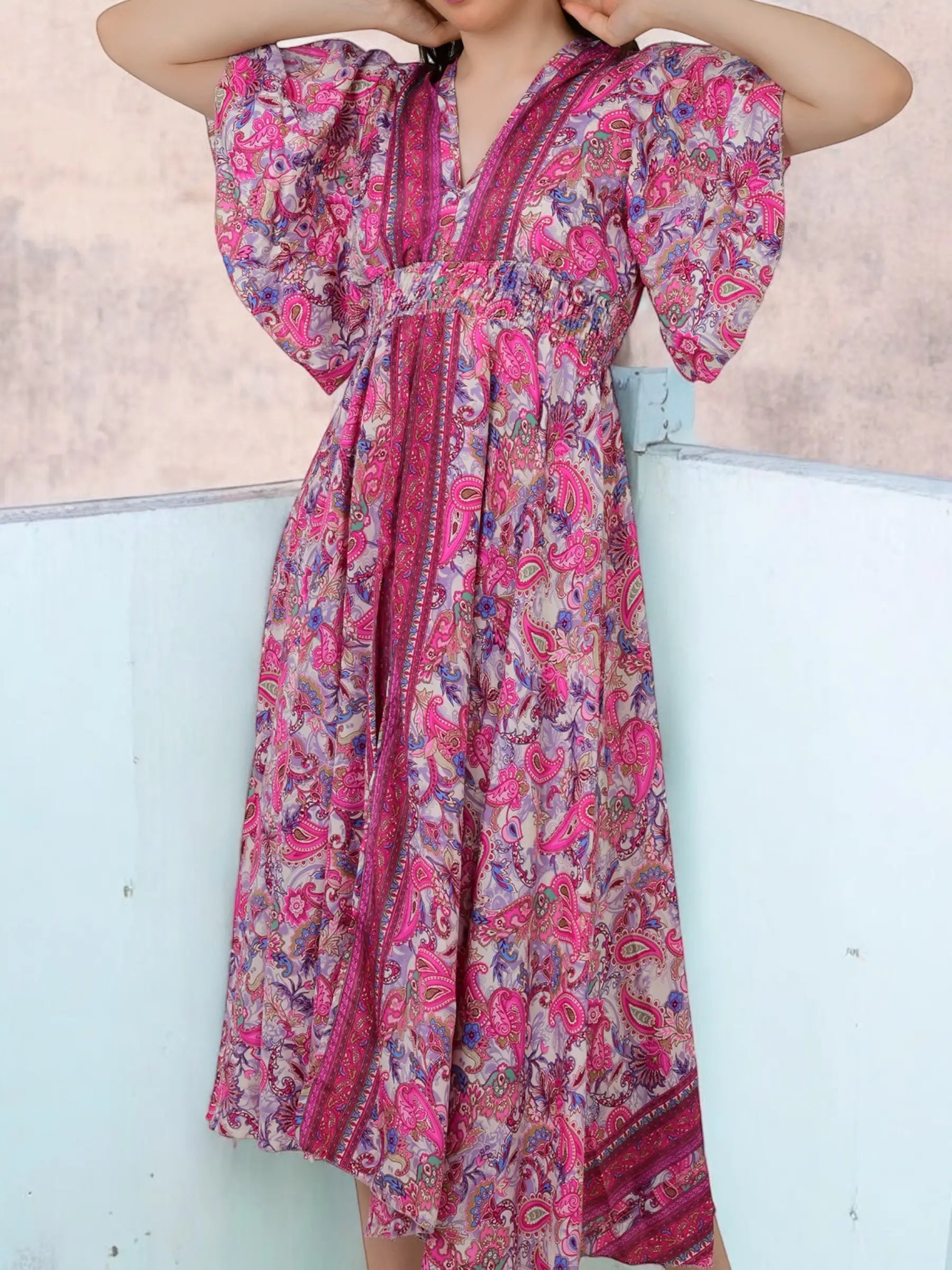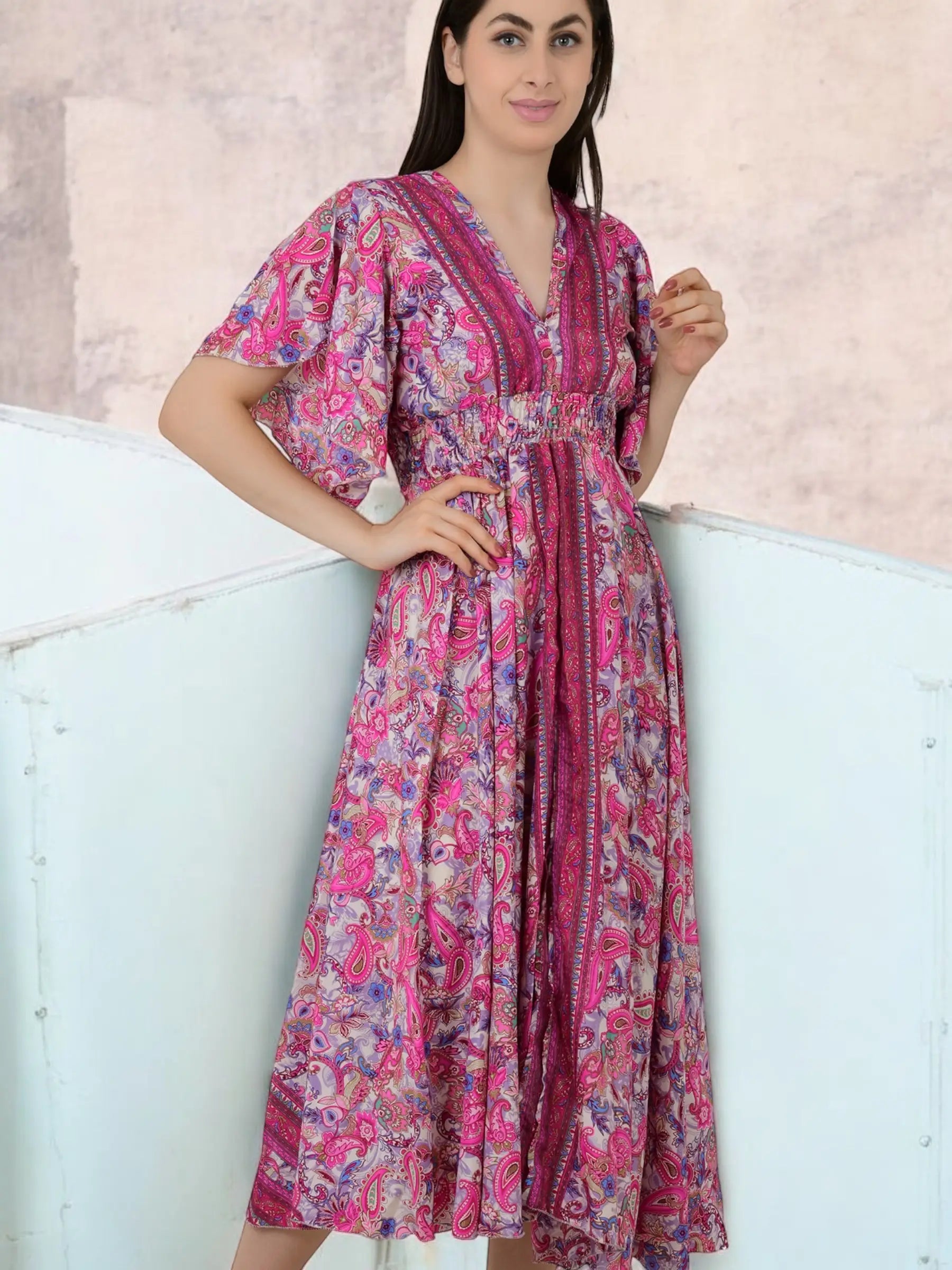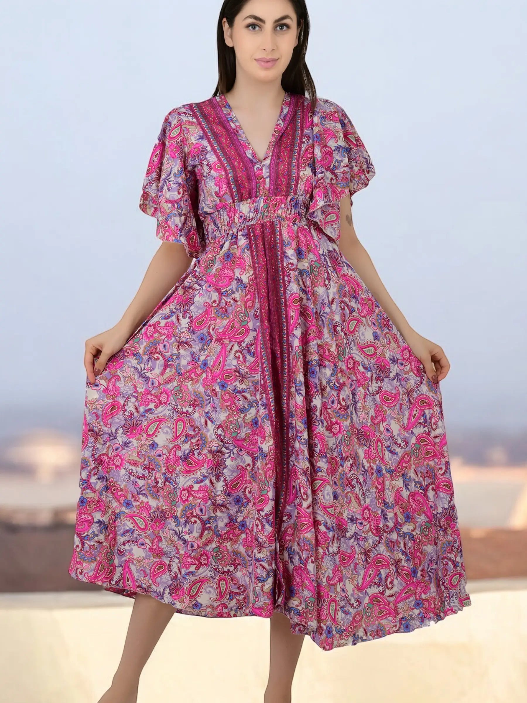 Spring Summer Silky Soft Boho Dress from The Eastern Loom, a luxurious and versatile piece designed for adult women and girls, or anyone looking to buy a thoughtful gift for her—be it your wife, girlfriend, sister, mother, nan, or best friend. This unique bohemian maxi dress is perfect for those seeking a silky soft boho dress for women, a luxury bohemian outfit gift for her, or a standout floral paisley midi dress for women.