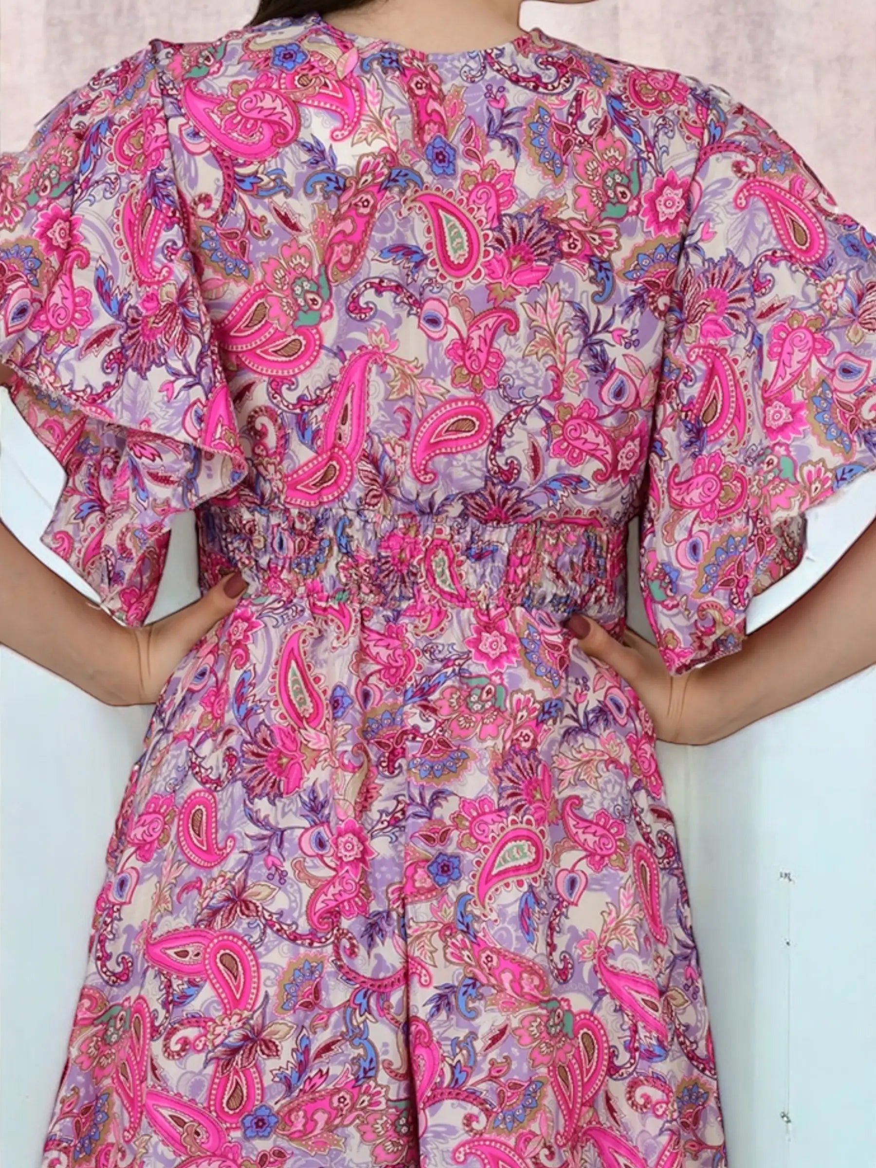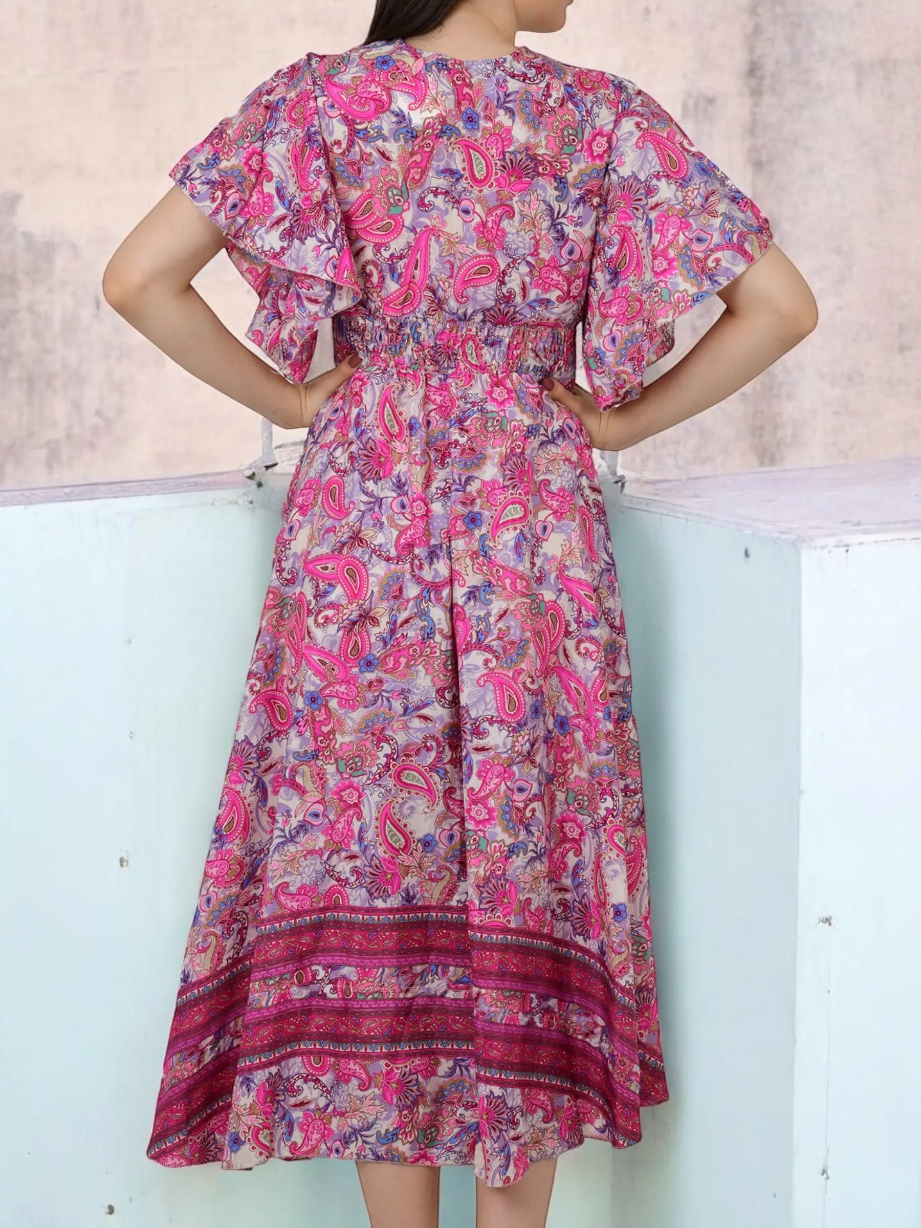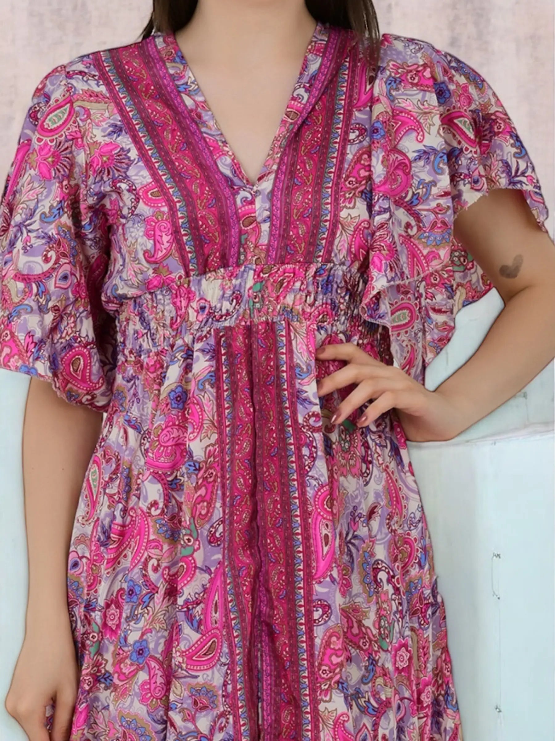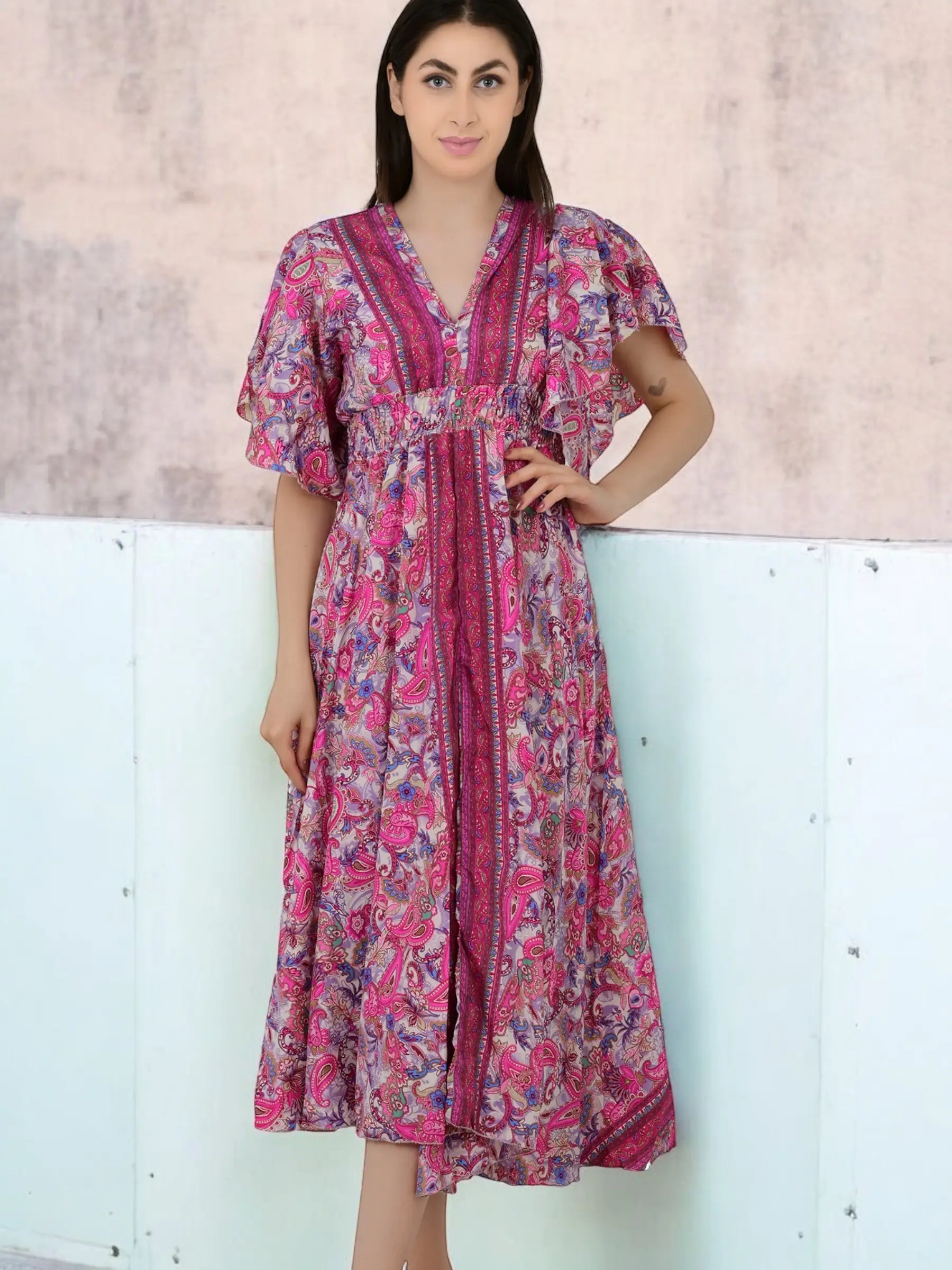 Spring Summer Silky Soft Boho Dress from The Eastern Loom, a luxurious and versatile piece designed for adult women and girls, or anyone looking to buy a thoughtful gift for her—be it your wife, girlfriend, sister, mother, nan, or best friend. This unique bohemian maxi dress is perfect for those seeking a silky soft boho dress for women, a luxury bohemian outfit gift for her, or a standout floral paisley midi dress for women.