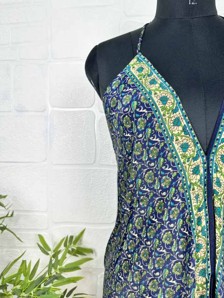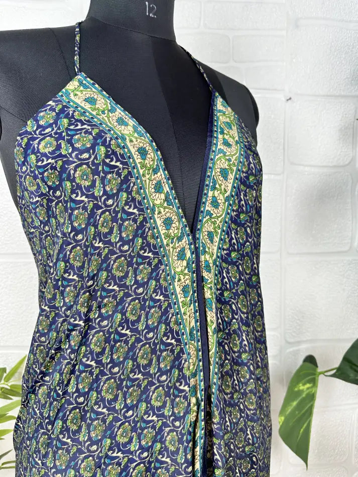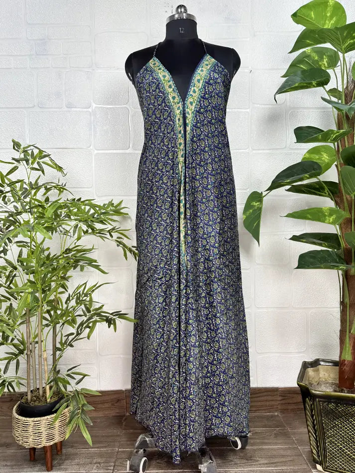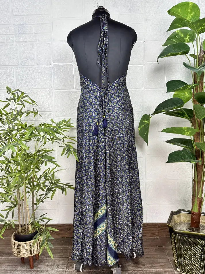 Boho New Silk Magic Summer Maxi Halter Dress | Floral Blue Green