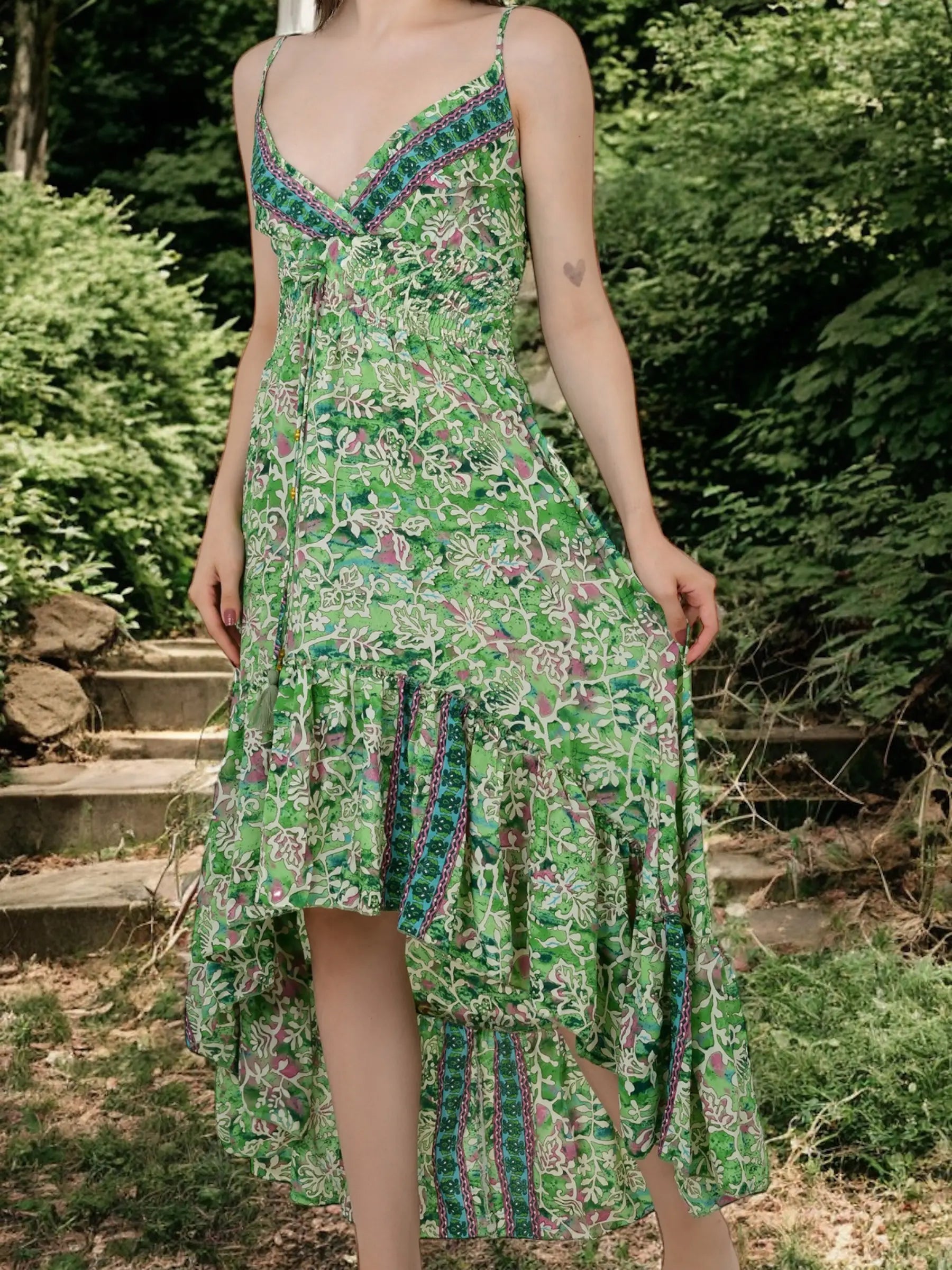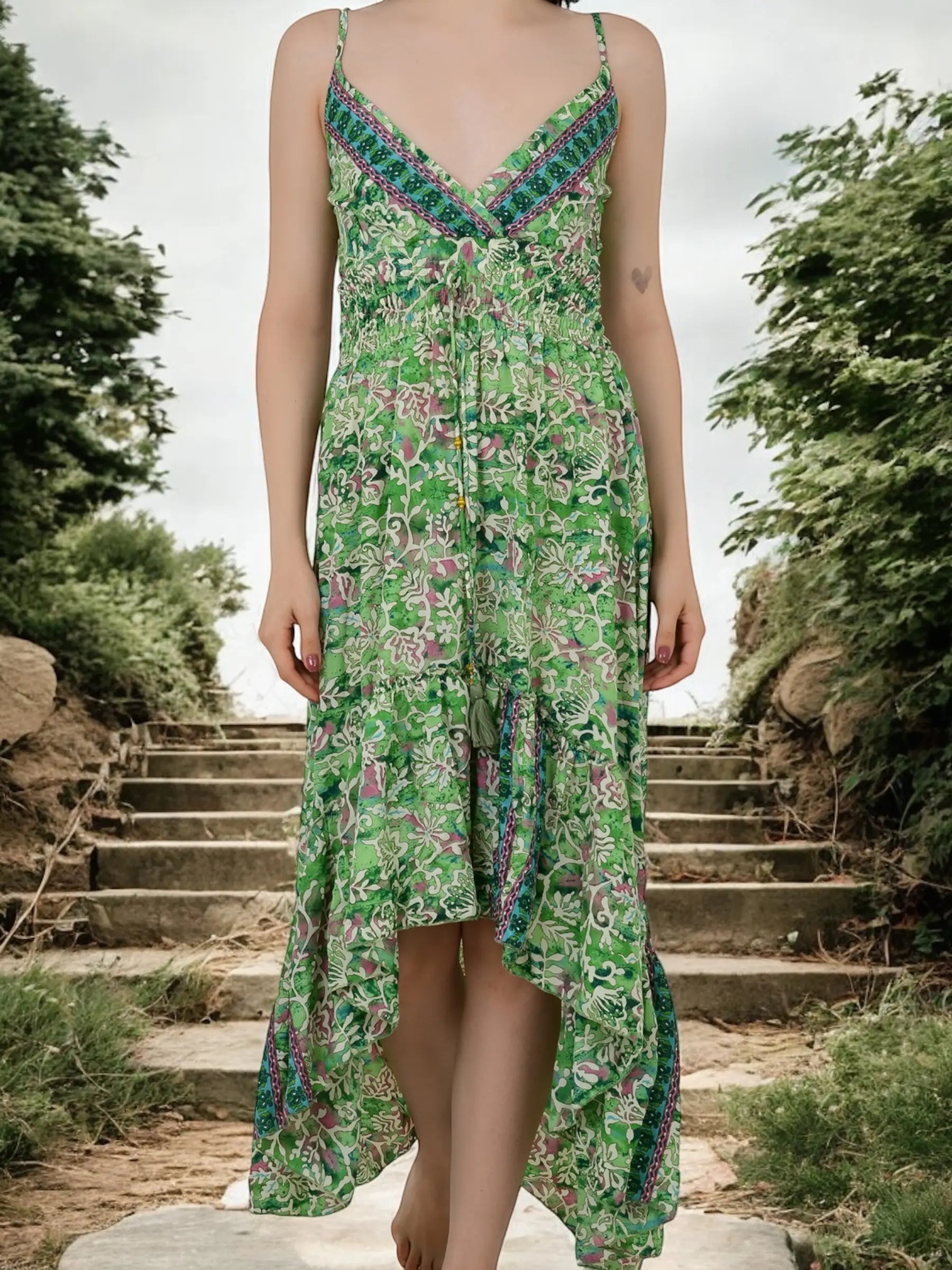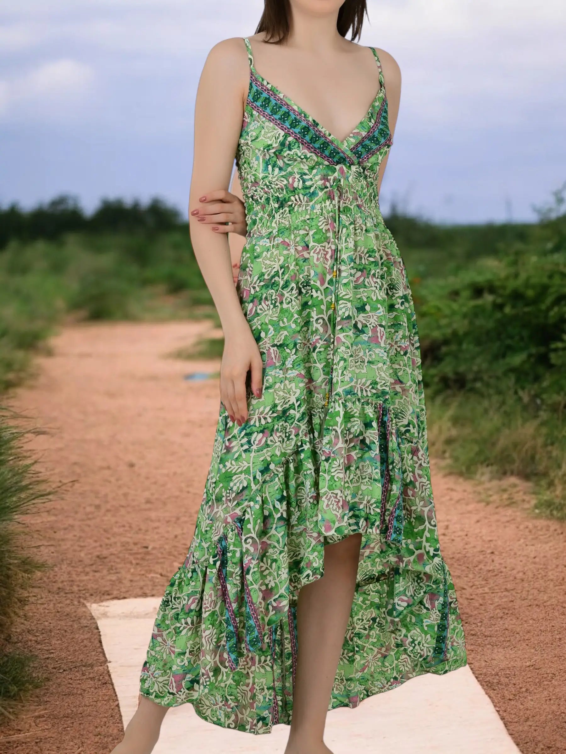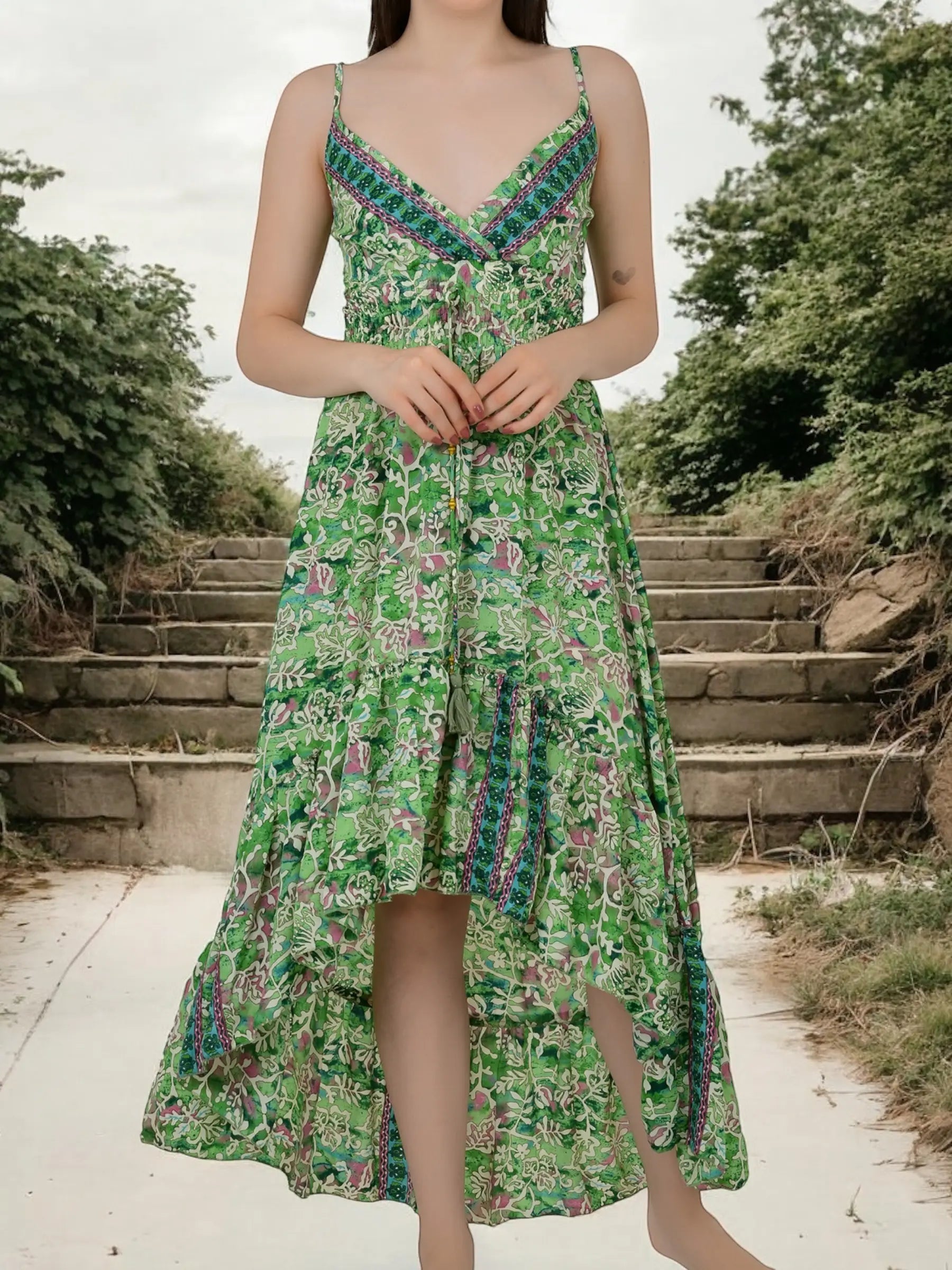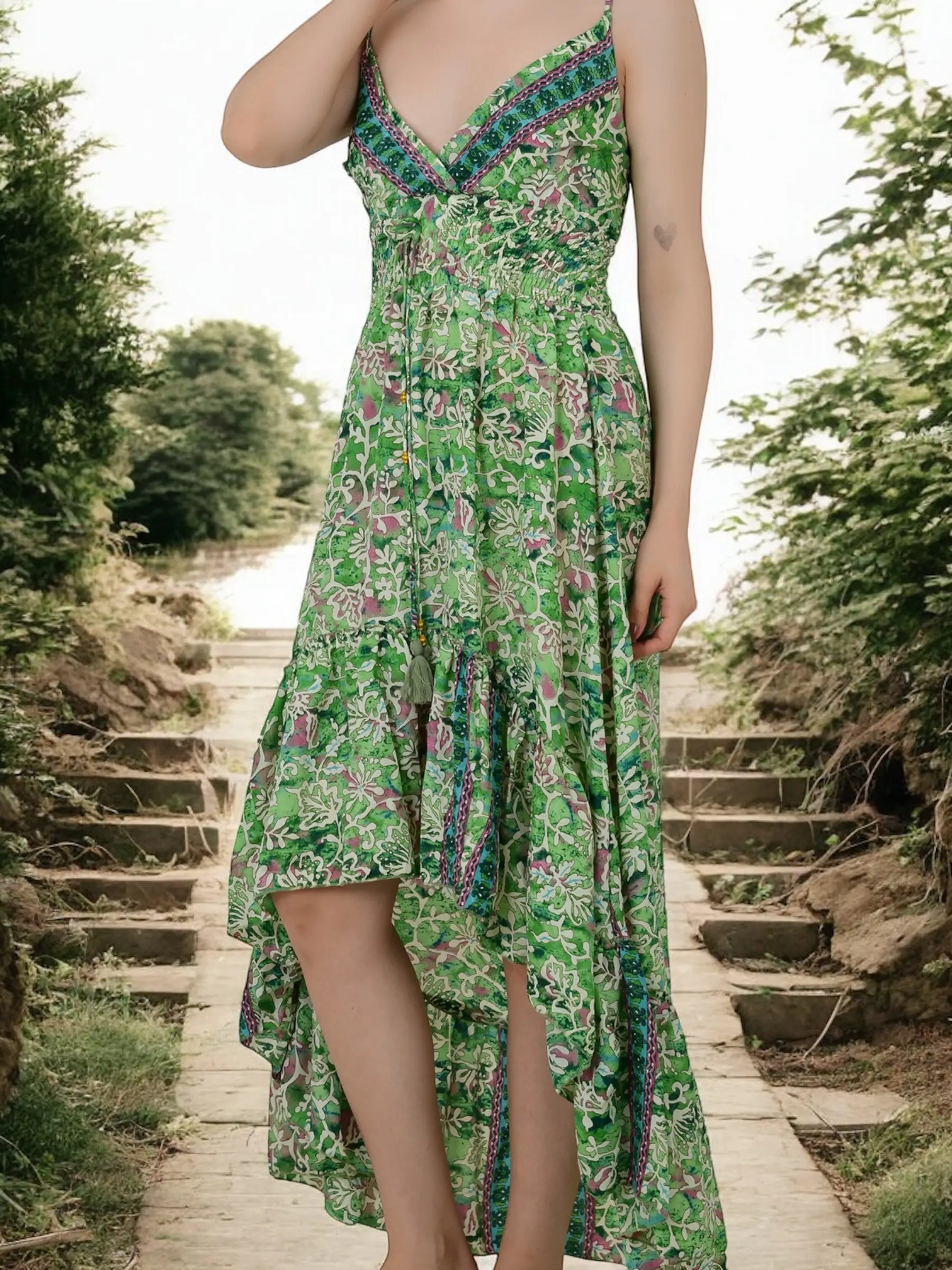 Spring Summer Silky Soft Boho Dress from The Eastern Loom, a luxurious and versatile piece designed for adult women and girls, or anyone looking to buy a thoughtful gift for her—be it your wife, girlfriend, sister, mother, nan, or best friend. This unique bohemian maxi dress is perfect for those seeking a silky soft boho dress for women, a luxury bohemian outfit gift for her, or a standout open back floral maxi dress for women.