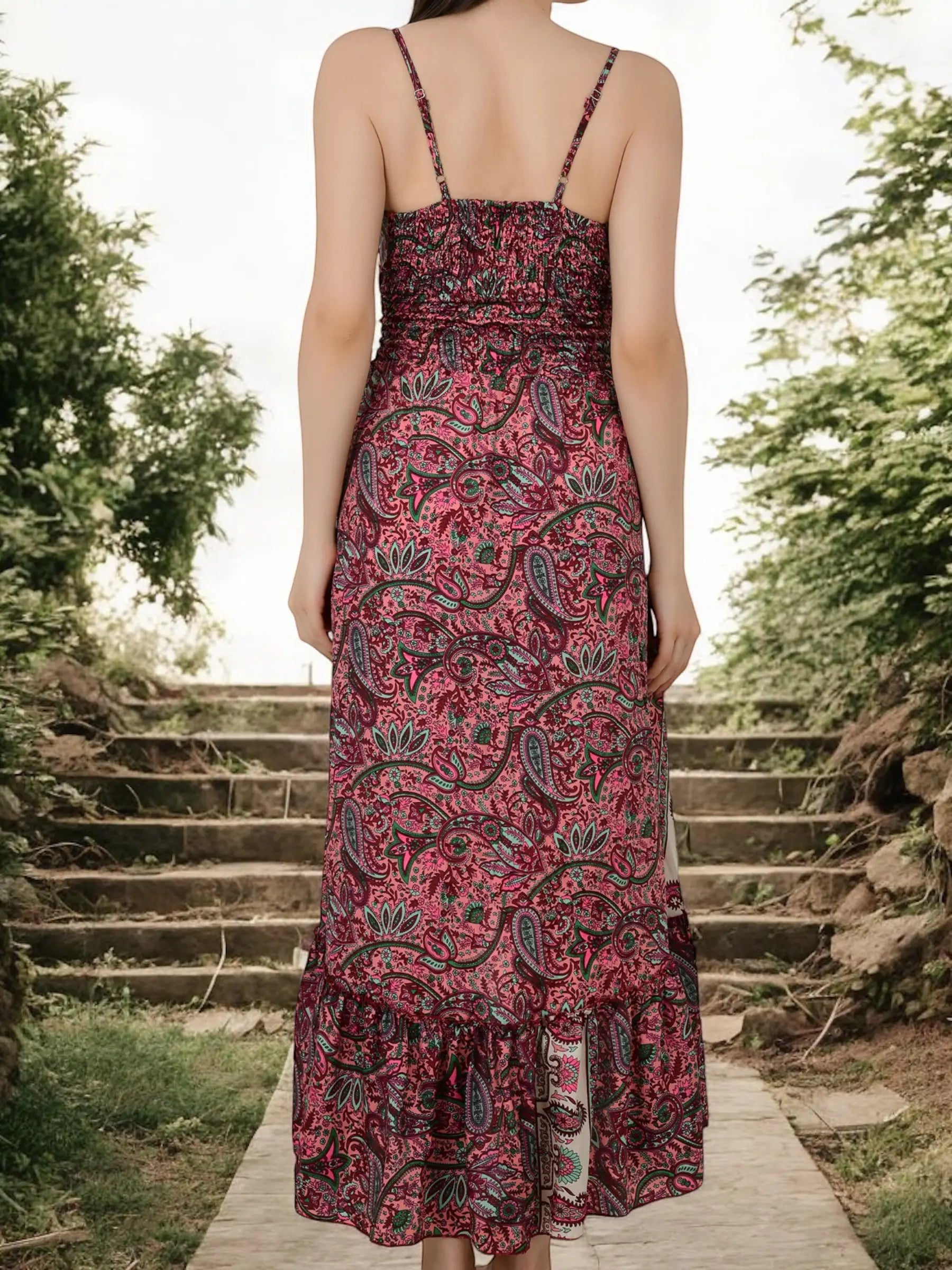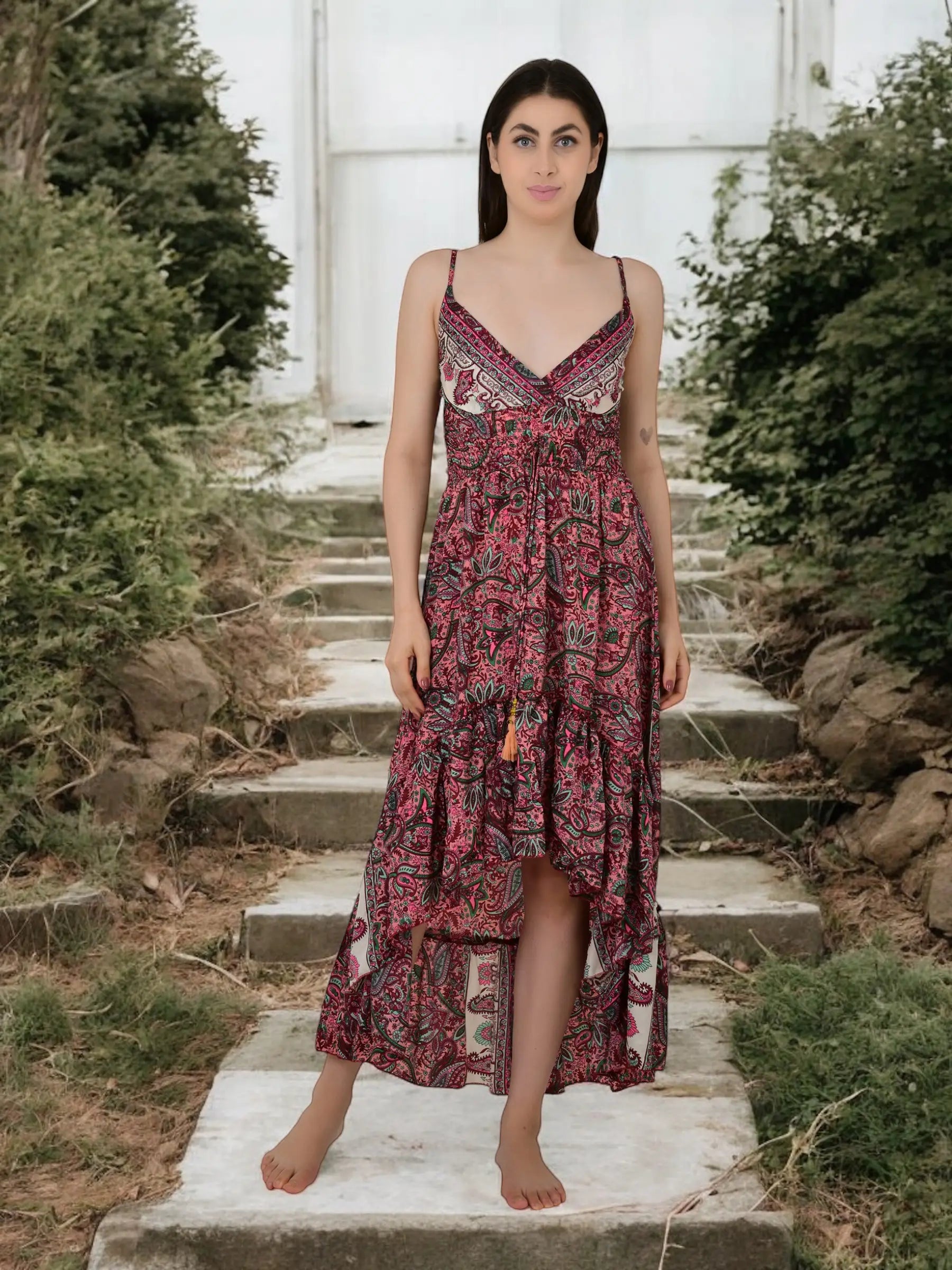 Spring Summer Silky Soft Boho Dress from The Eastern Loom, a luxurious and versatile piece designed for adult women and girls, or anyone looking to buy a thoughtful gift for her—be it your wife, girlfriend, sister, mother, nan, or best friend. This unique bohemian maxi dress is perfect for those seeking a silky soft boho dress for women, a luxury bohemian outfit gift for her, or a standout open back floral maxi dress for women.