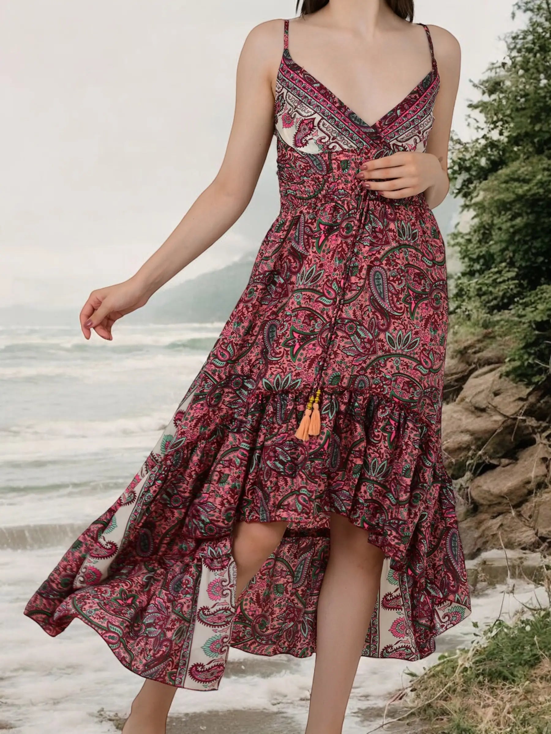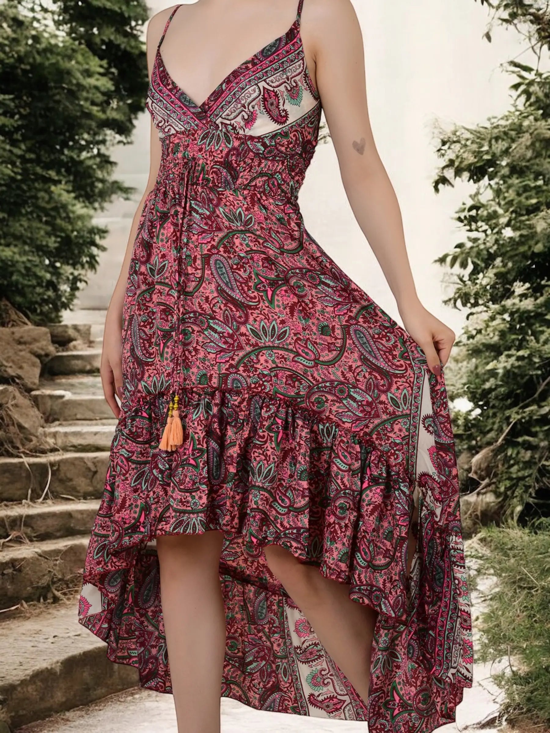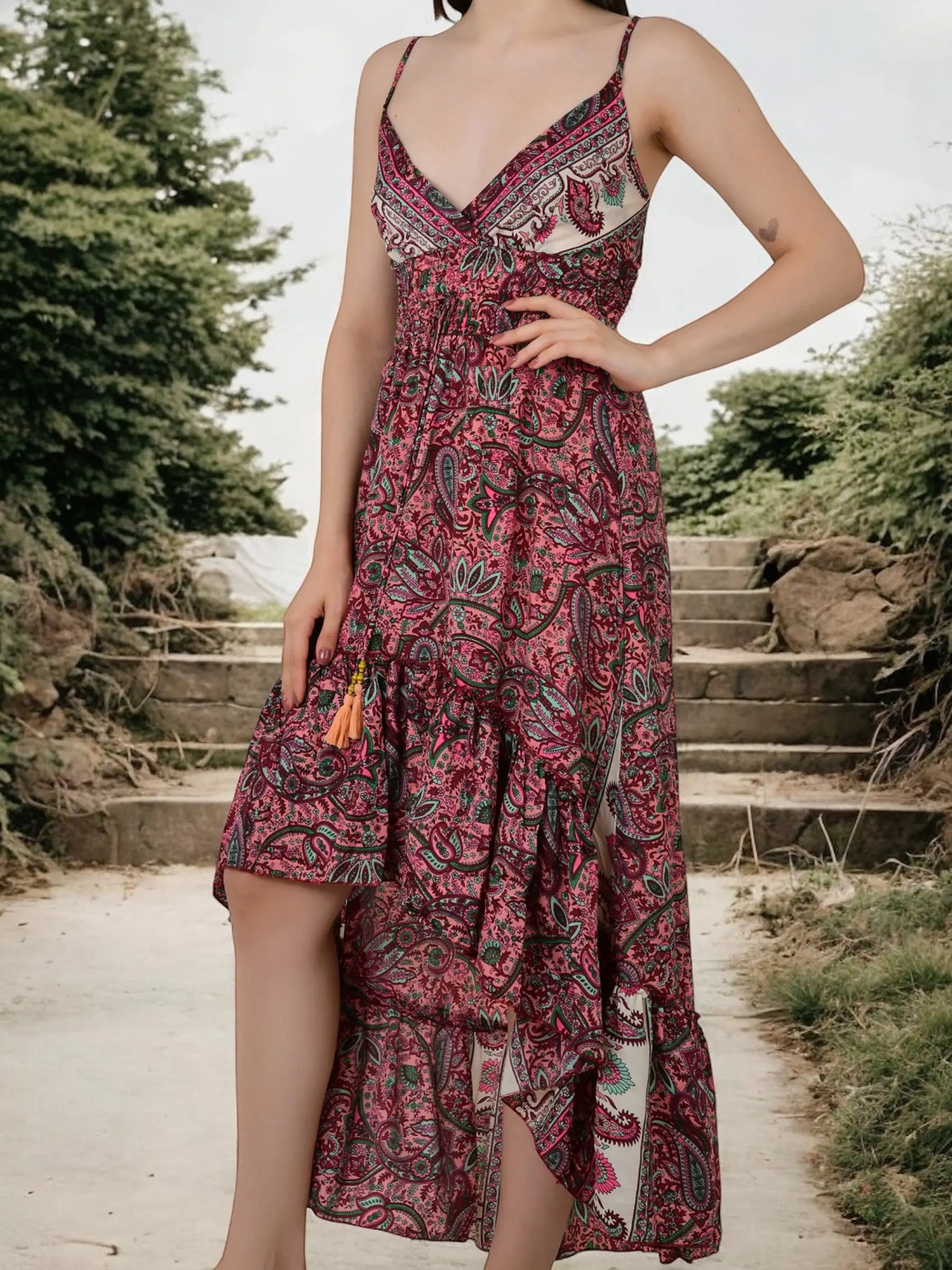 Whether you’re searching for a bridesmaid gift boho dress, beachwear boho dress for her, festival wear boho maxi dress, or a gypsy flowy silk dress for women, this piece is sure to delight. It’s also a wonderful option for sustainable boho clothing gifts, soft breathable summer dresses for women, unique boho bridesmaid dress gifts, adjustable v-neck boho dresses for her, resort wear boho dresses for women, and loungewear boho dress gifts for her. The Eastern Loom’s boho dress is beloved by those looking for birthday gifts, anniversary gifts, holiday wear, resort wear, festival wear, loungewear, and sustainable, soft, and breathable clothing.