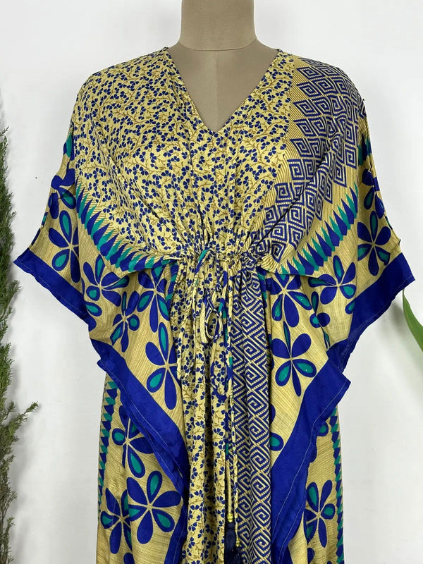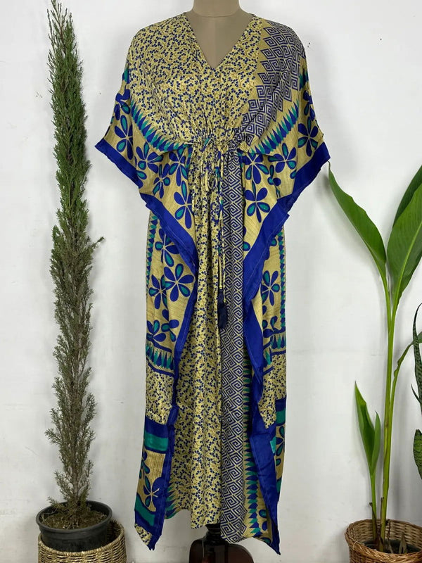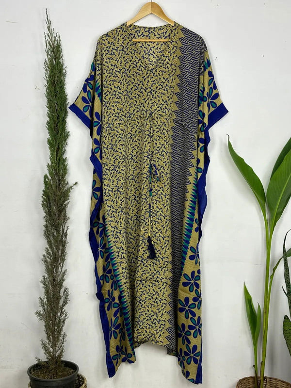 Recycled Silk Vintage Sari Kaftan Boho Dress Flowy Long Length Blossom Artistic Women Beach Coverup | Brown Blue Blossom