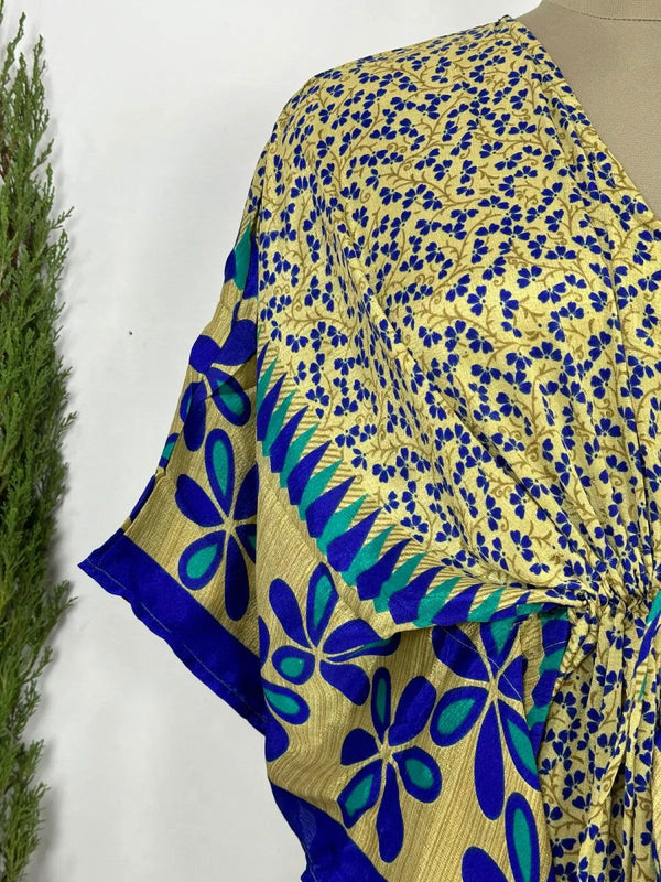 Discover the perfect blend of style and sustainability with our recycled silk Kaftan. Each piece is carefully crafted from handpicked vintage saris, making every Kaftan truly unique. Our small batch, female-led business based in Jaipur is committed to creating eco-friendly fashion that reduces landfills and protects the environment.