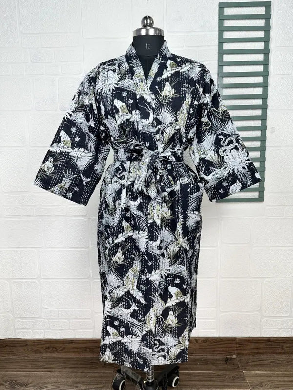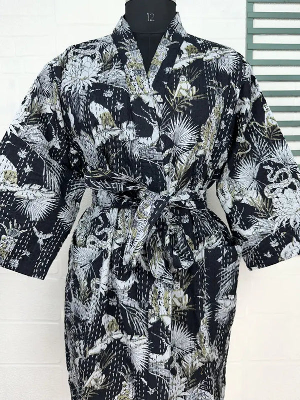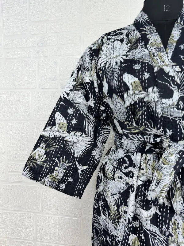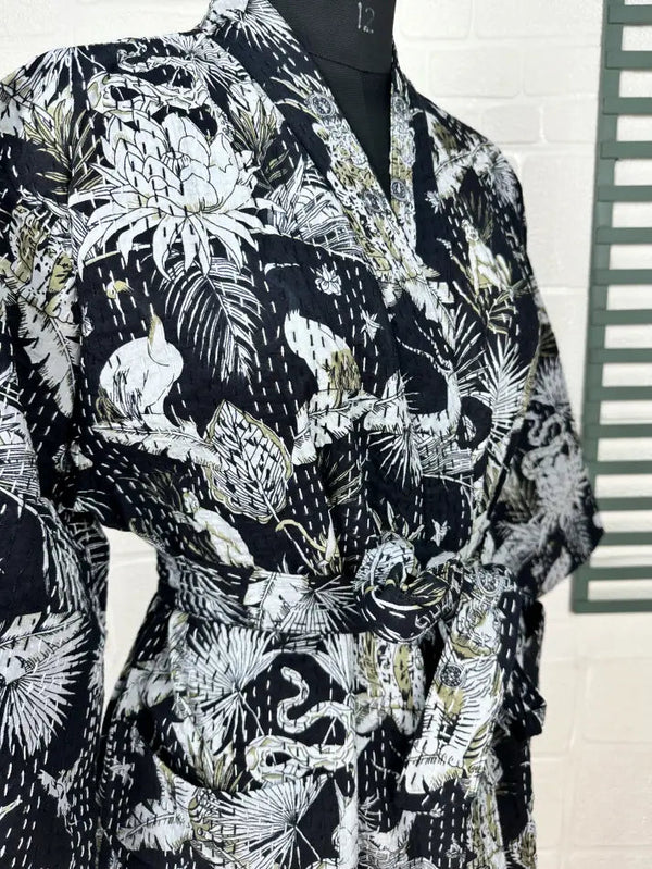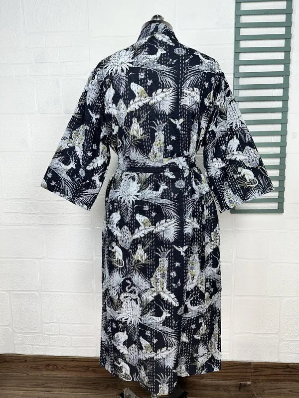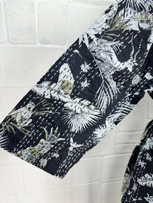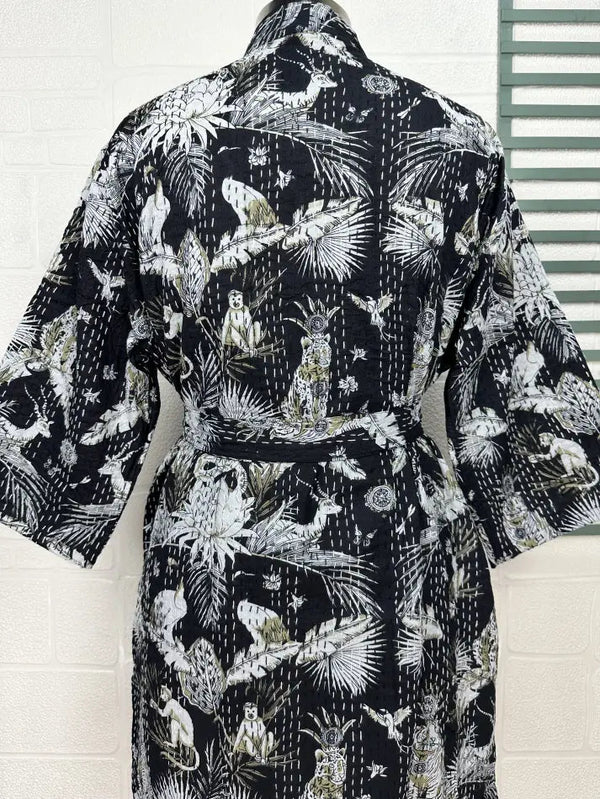 Kantha Reine Baumwolle Wendbare Lange Kimono Damen Jacke Pastell Grün Affe Tier