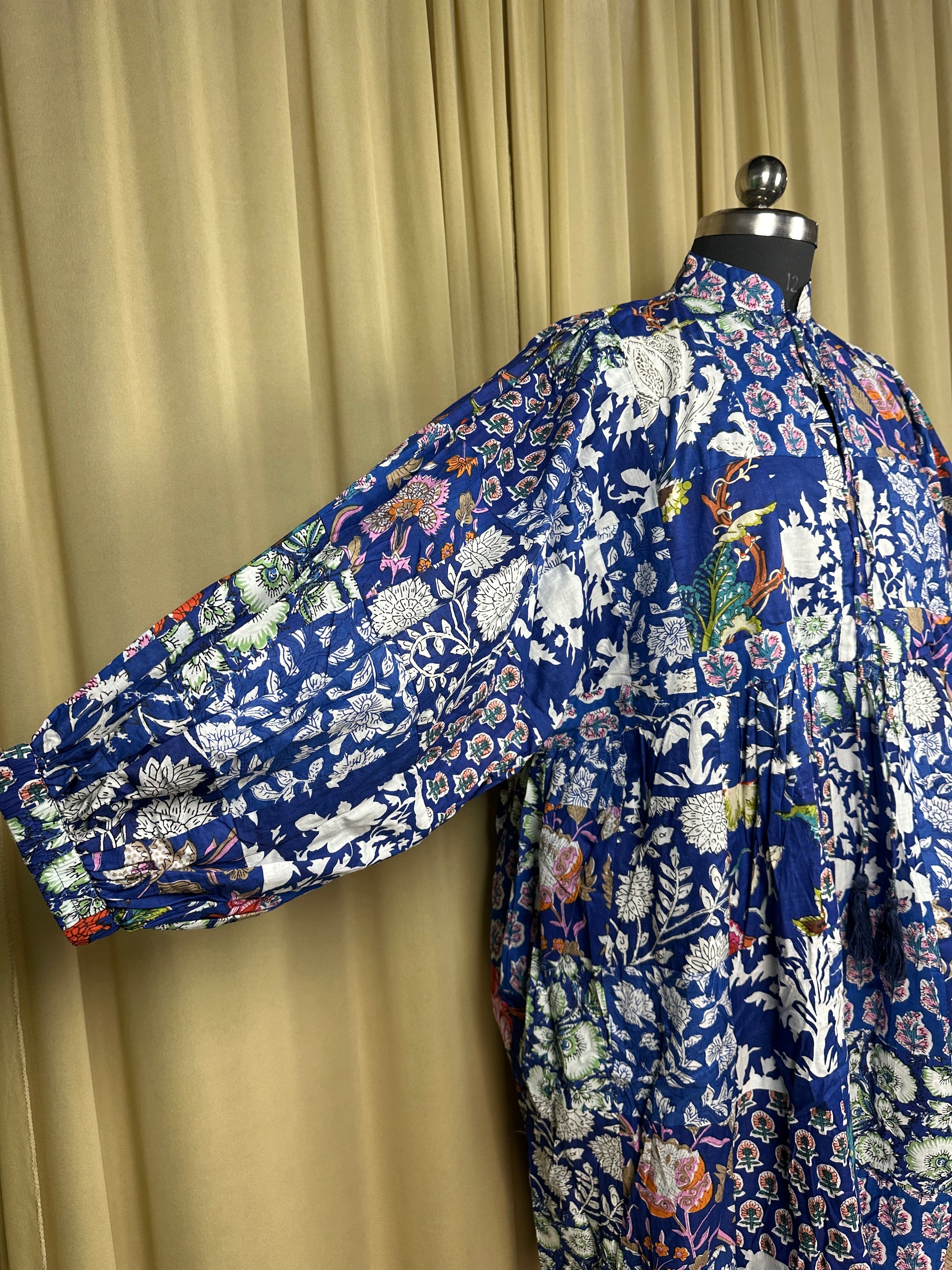 Der Blockdruck auf dem Stoff ist reichhaltig und lebendig. Die Farben können aufgrund digitaler Einstellungen und Beleuchtung variieren.
