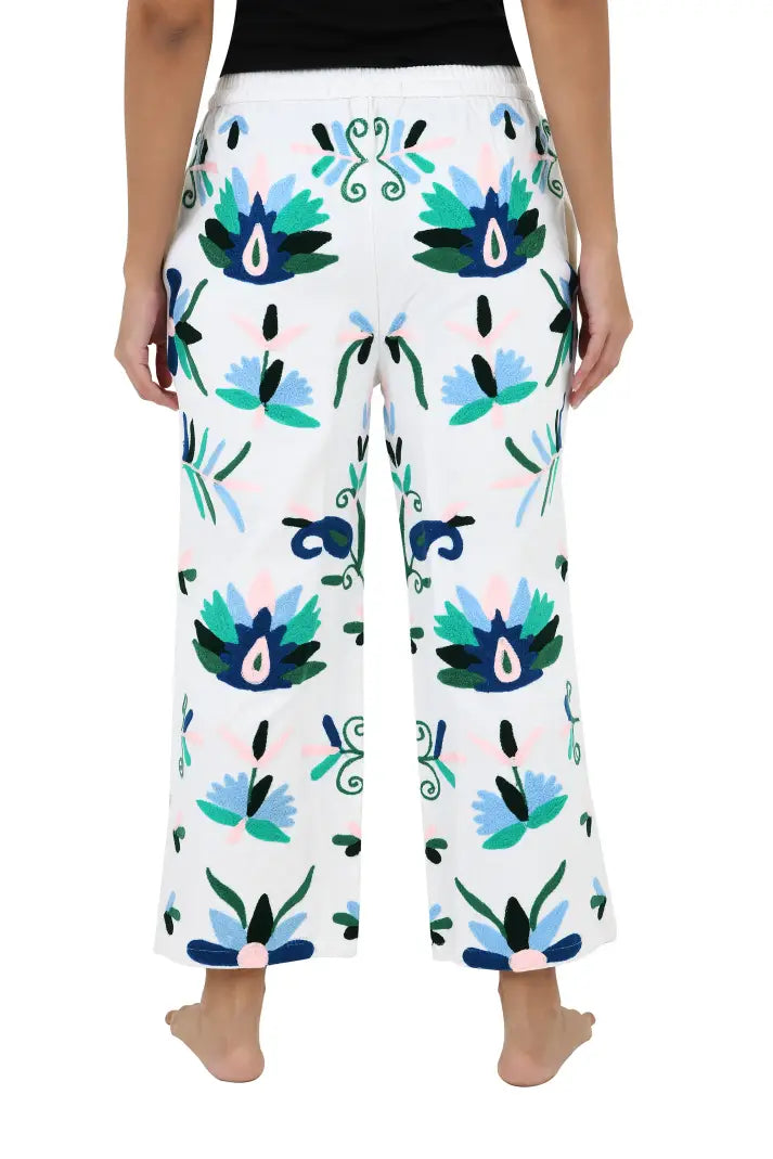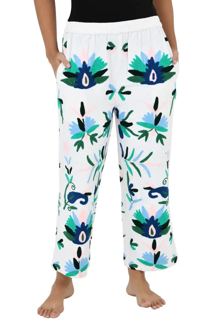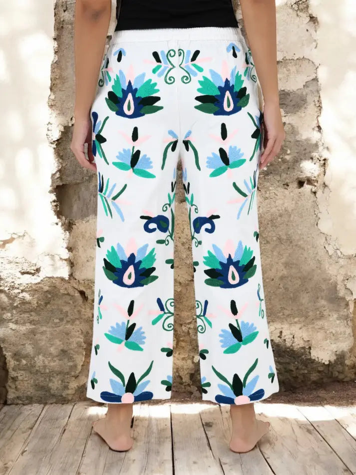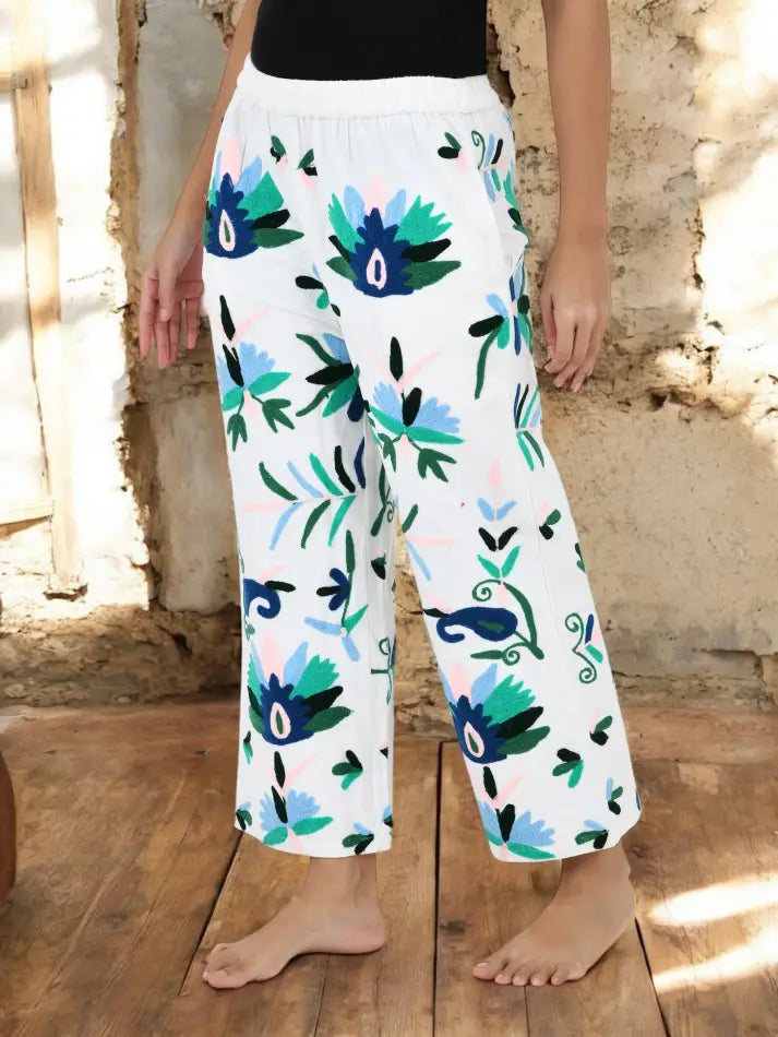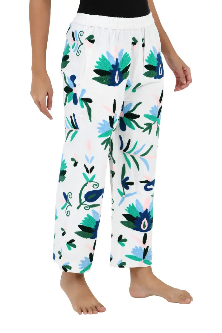 Boho Harem Pants Gift for Her – Handmade Embroidered Suzani Festival Pants, Boho Hippie Lounge Pajamas with Pockets, Unique Floral Yoga Pant