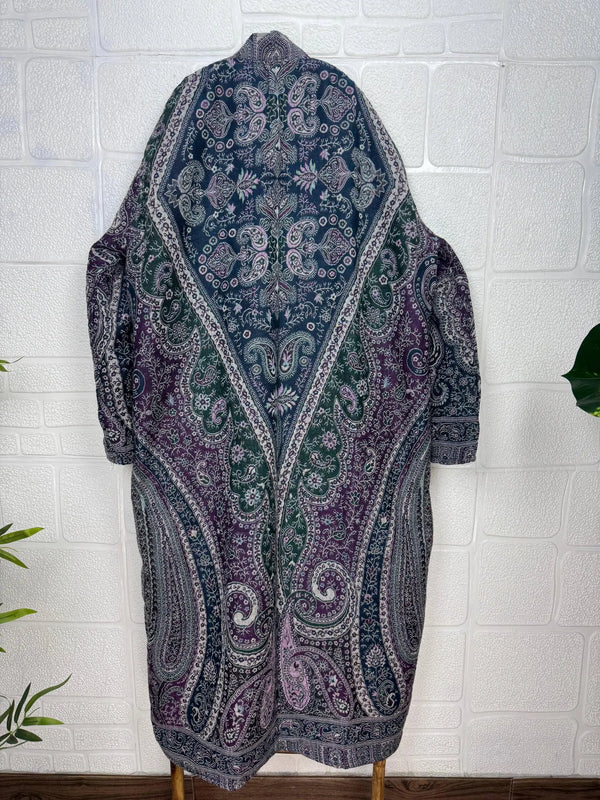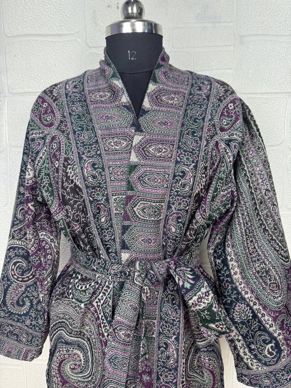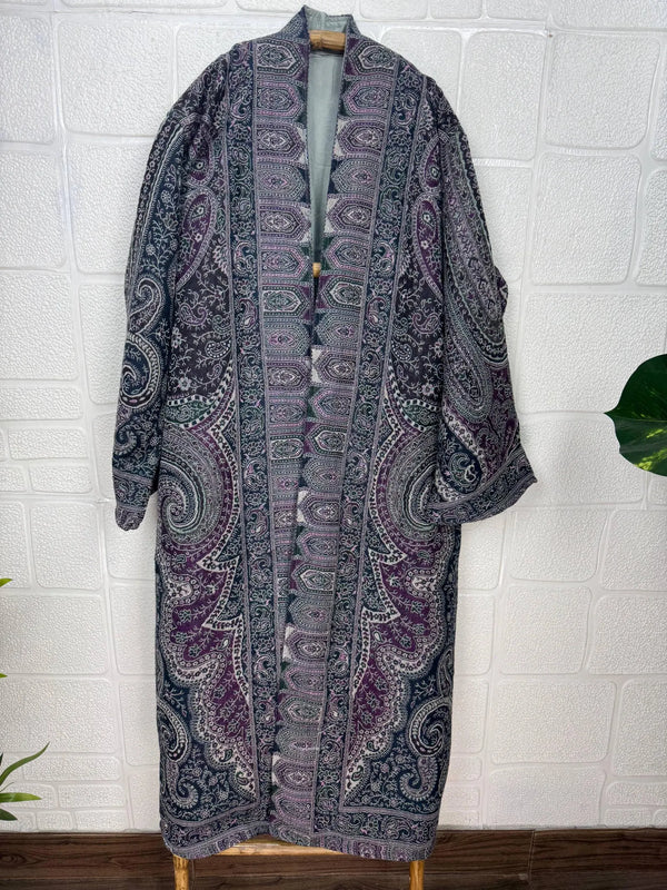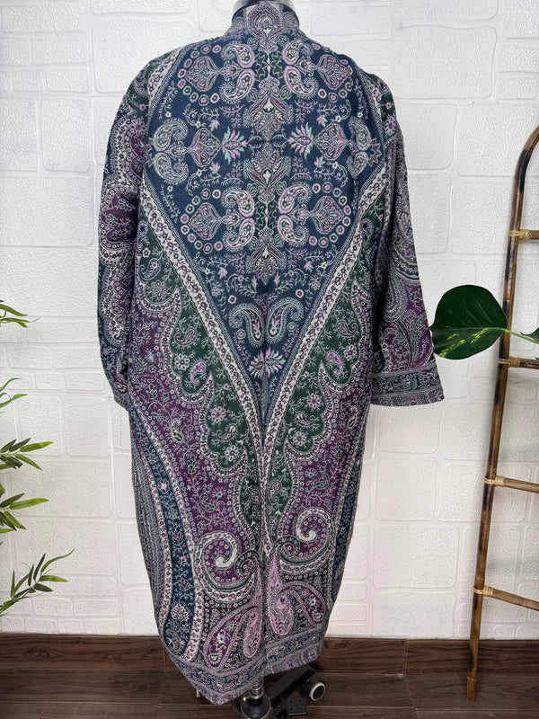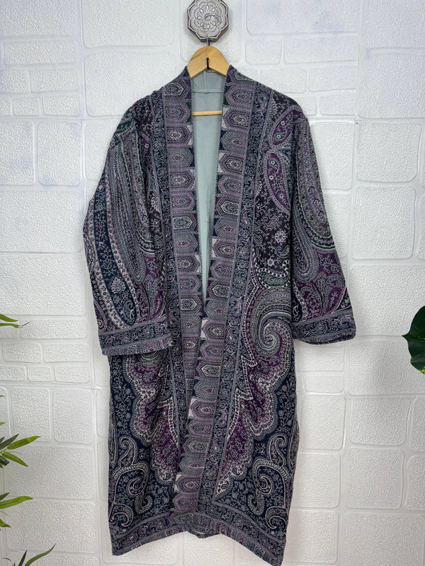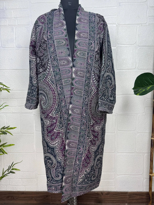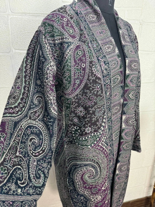 Luxurious Paisley Design Open Jacket Robe, crafted from gorgeous Boiled Merino wool. This piece is designed to provide warmth and elegance, lined on the inside for extra coziness, yet remaining light and comfortable.