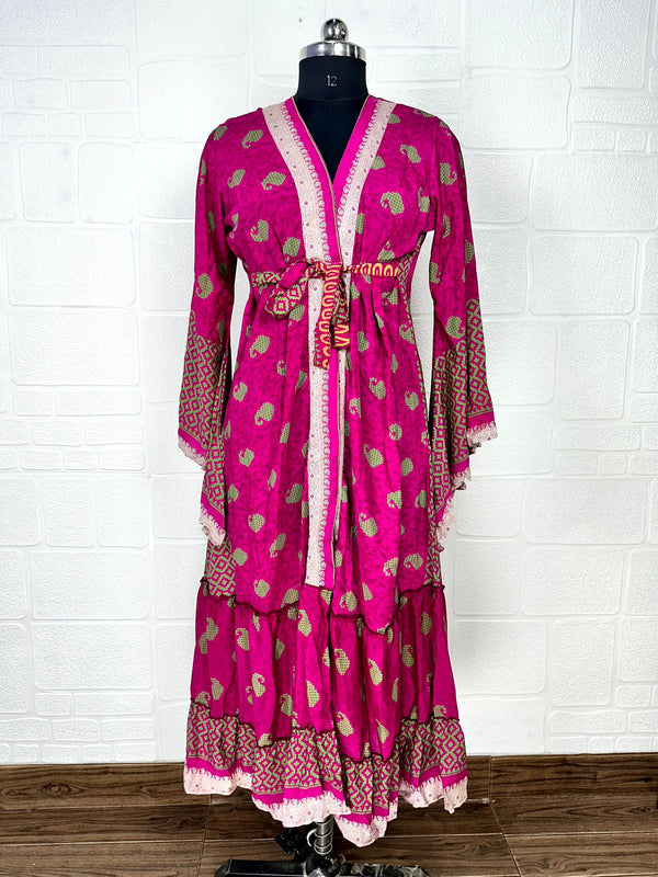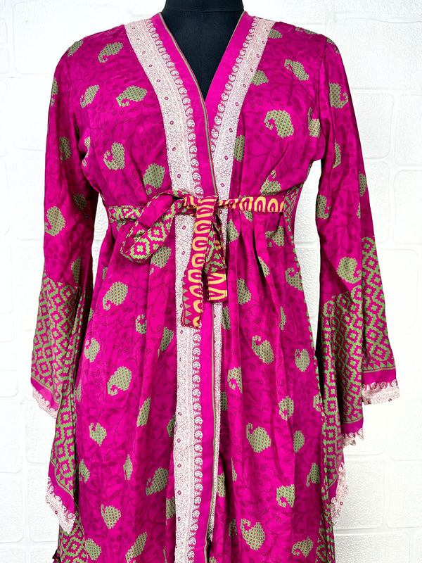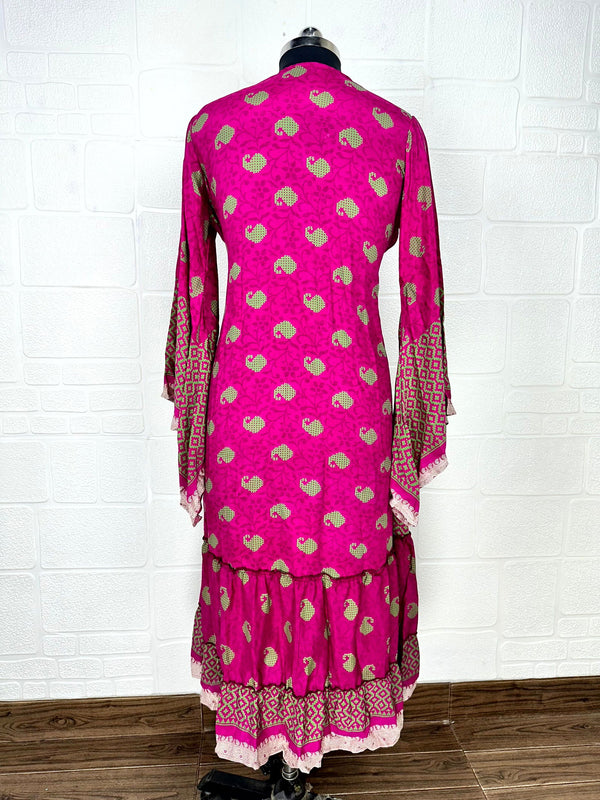 Recycle Boho House Robe Kimono Vintage Silk Sari Dressing Gown, Beach Coverup, Bridesmaid, Anniversary Gift Her | Paisley Print Pink