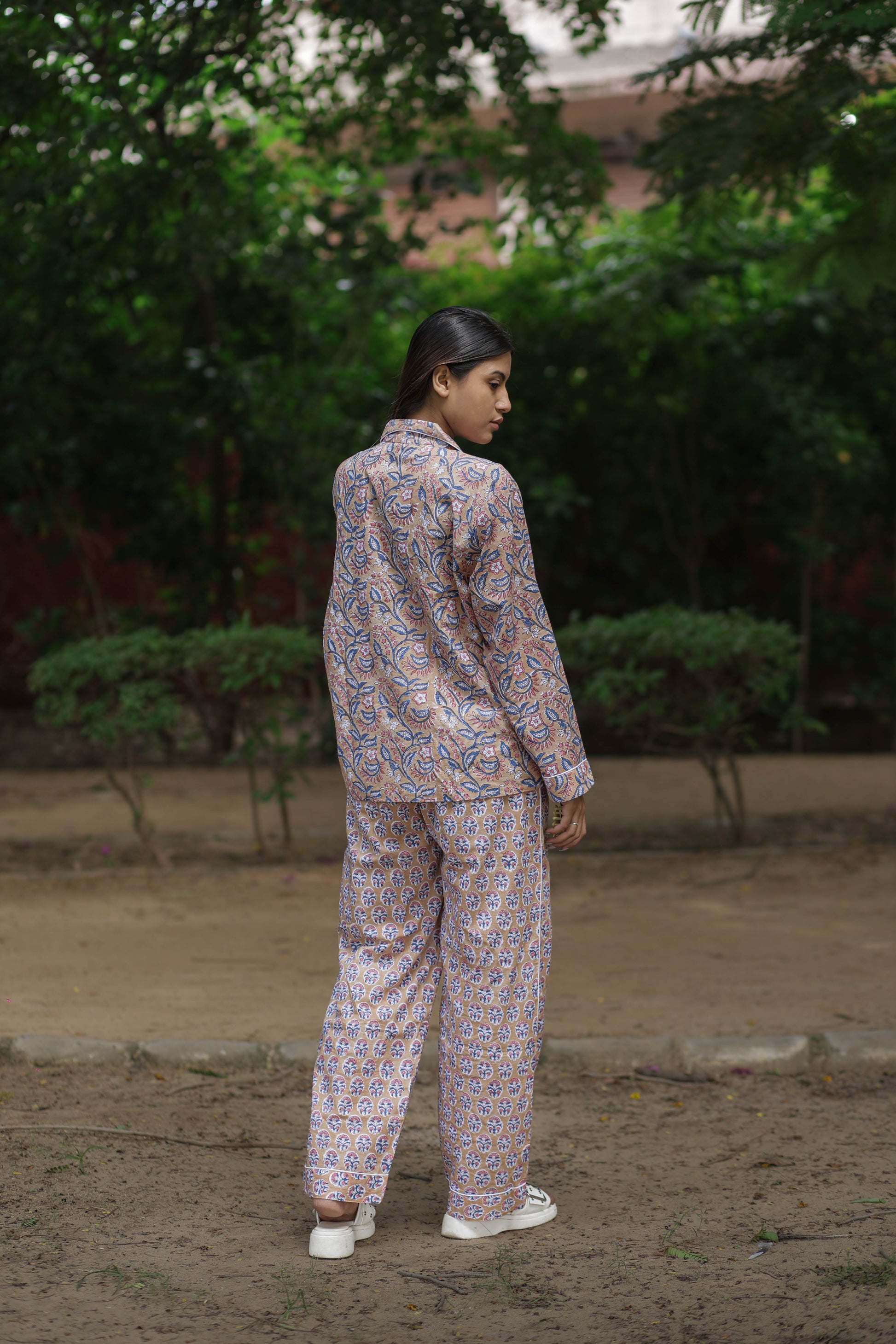 To keep your pajama set looking and feeling its best, machine wash cold on a gentle cycle with like colors. Use mild detergent, avoid bleach, and either tumble dry low or line dry. Iron on low if needed. This care routine preserves the vibrant handblock print and the natural softness of the cotton.