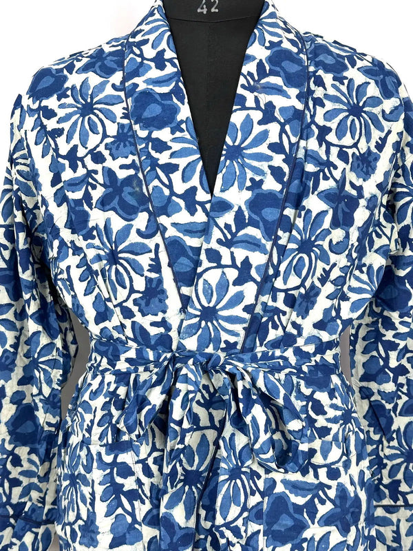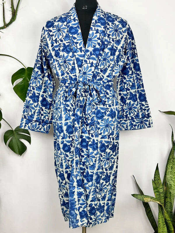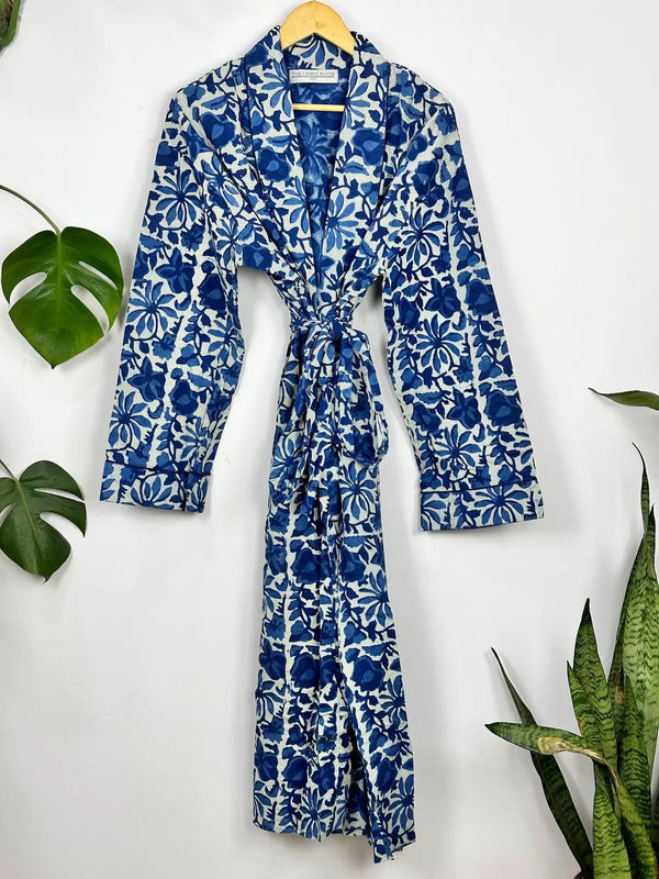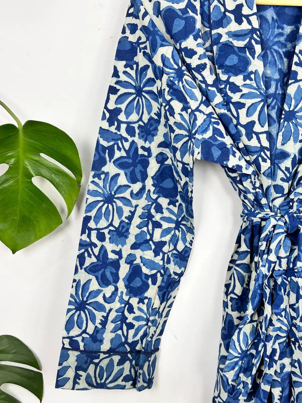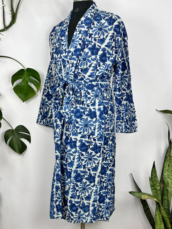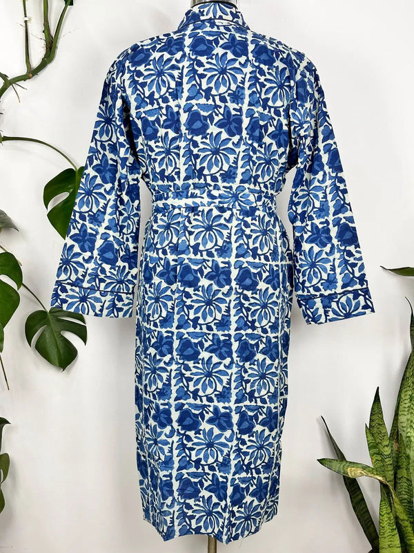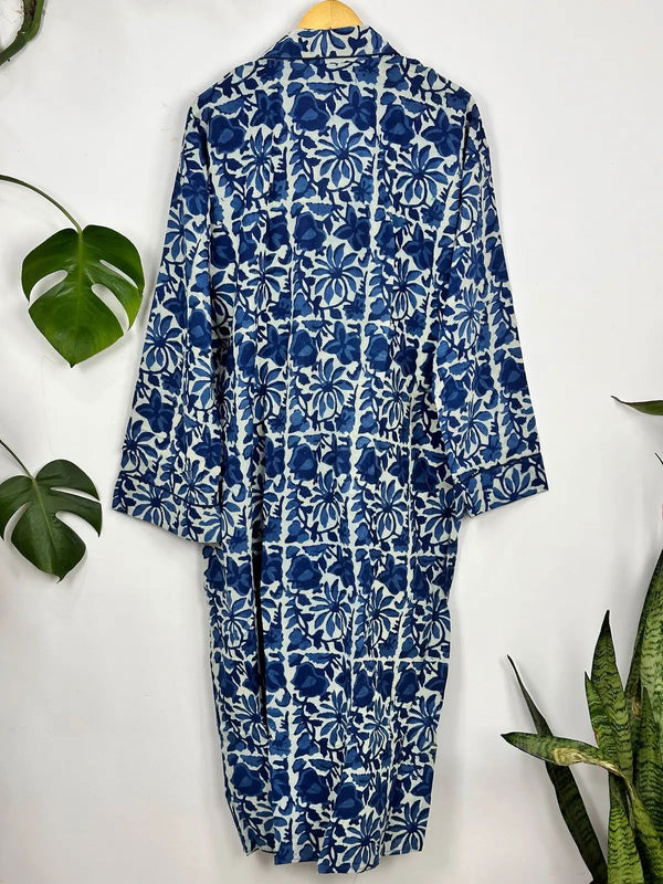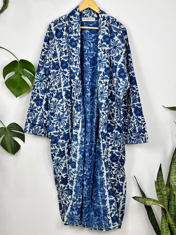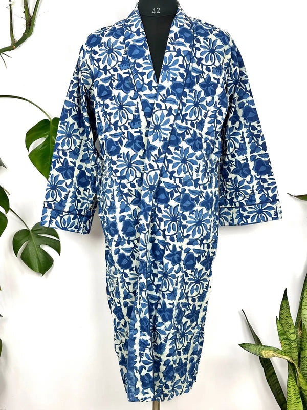 Robe kimono en pur coton pour hommes, vêtements d'été funky pour la maison, imprimé à la main, couverture de plage élégante, vêtements de salon pour fumer | Blanc Bleu Indigo Floral