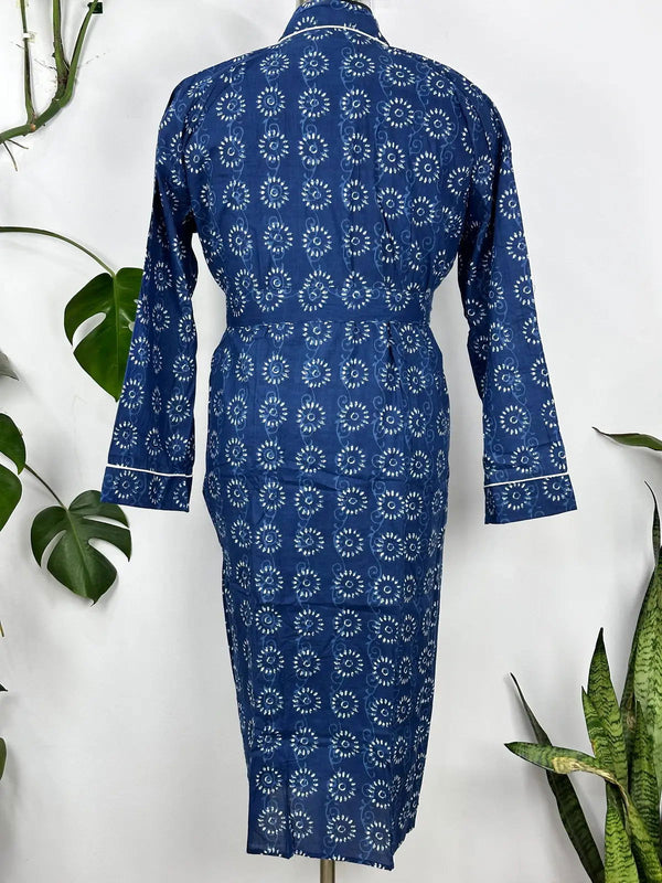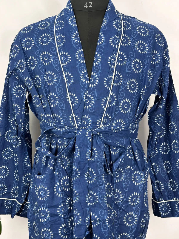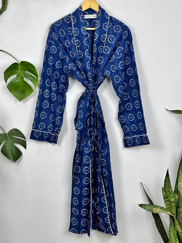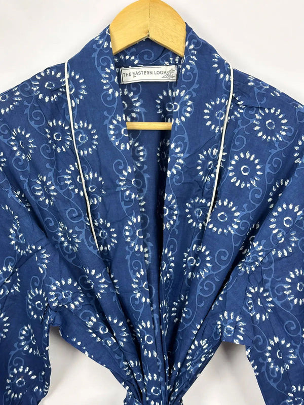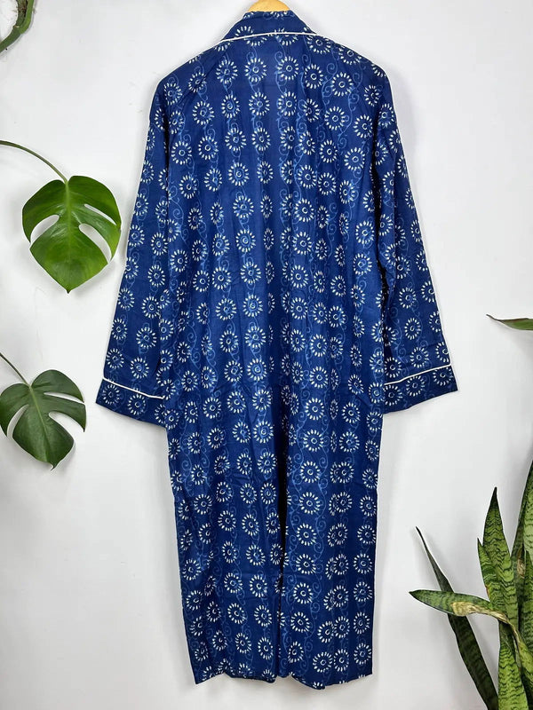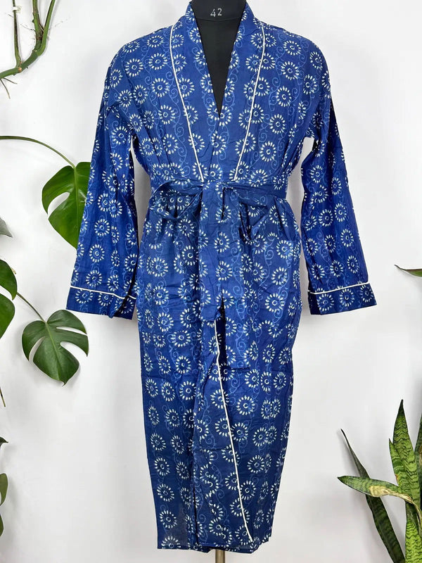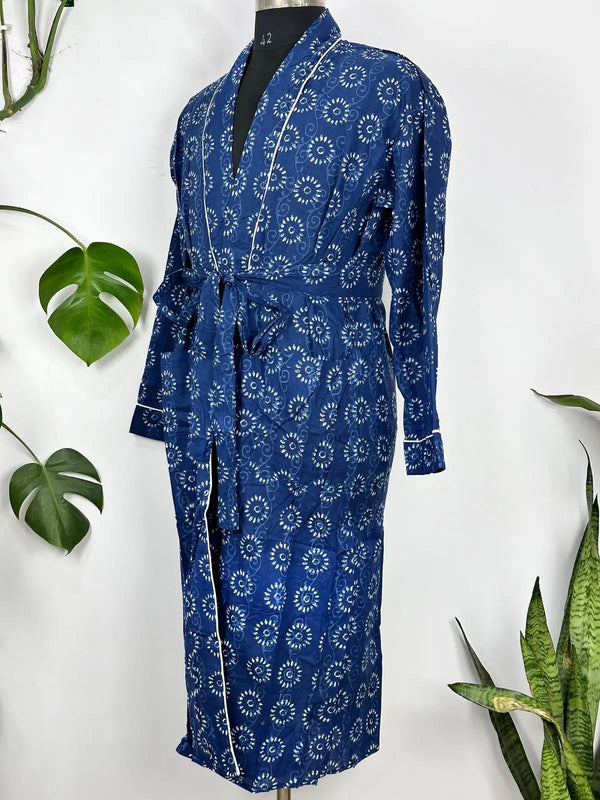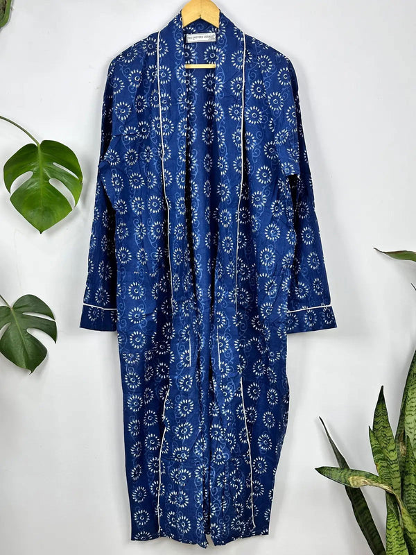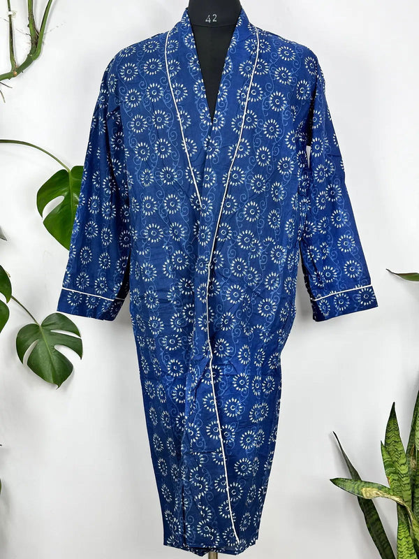 Robe de maison imprimée à la main en coton pour hommes Kimono Indigo Floral Mughal Bloom