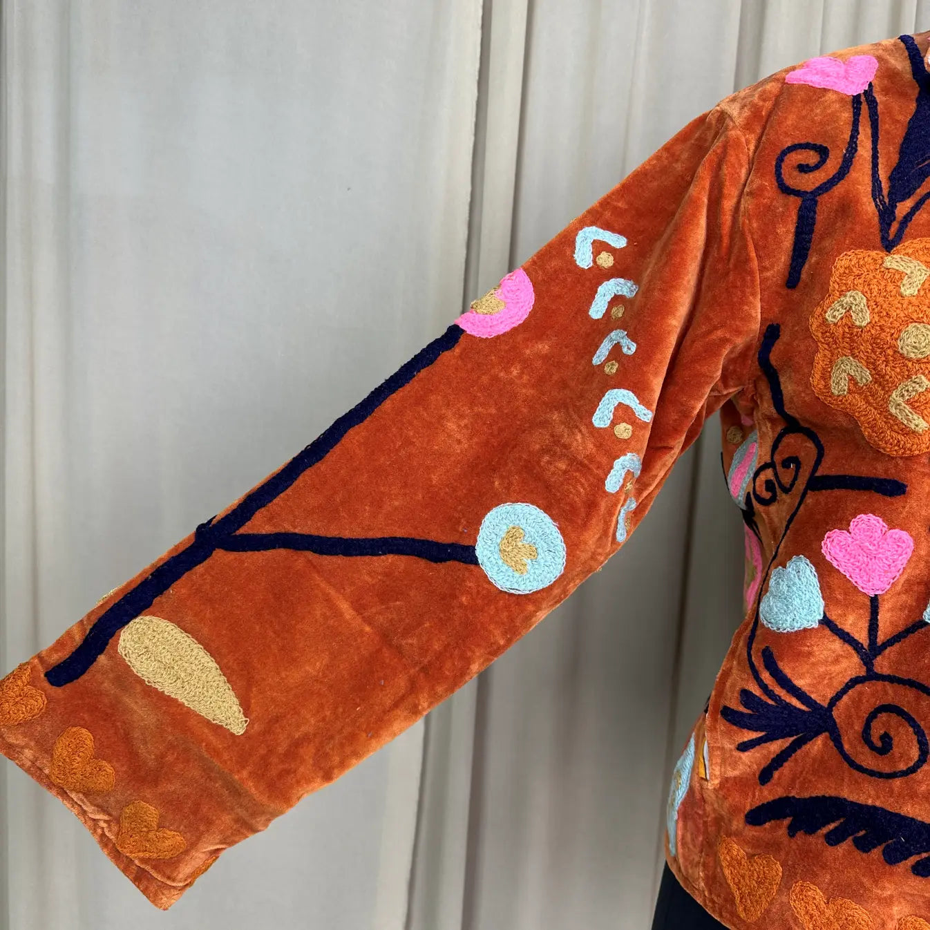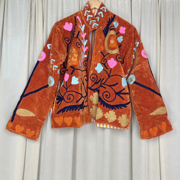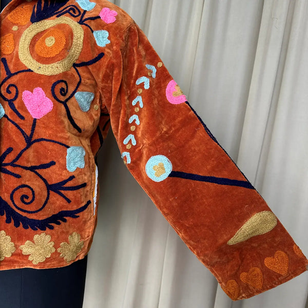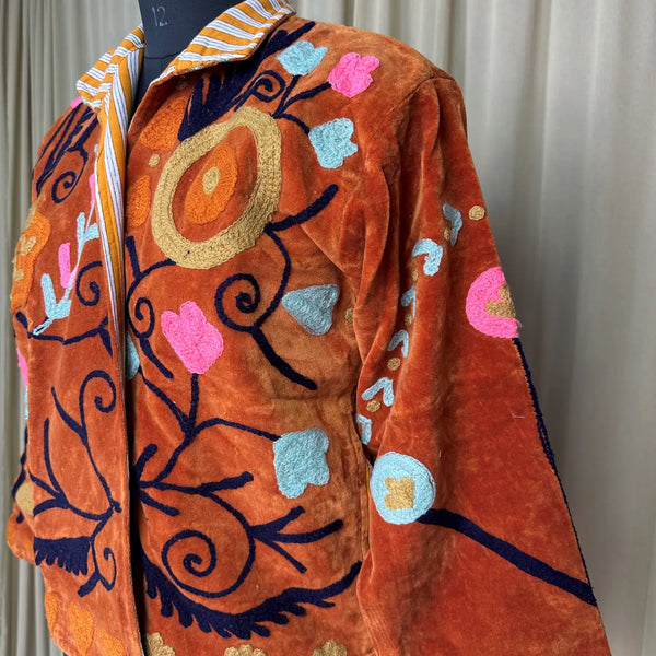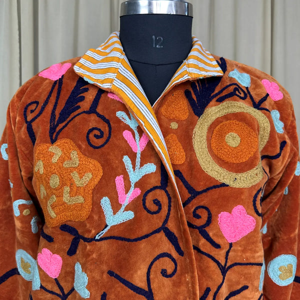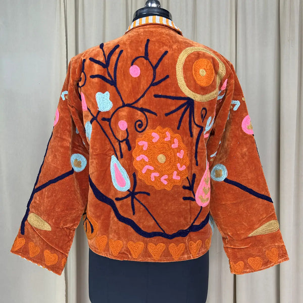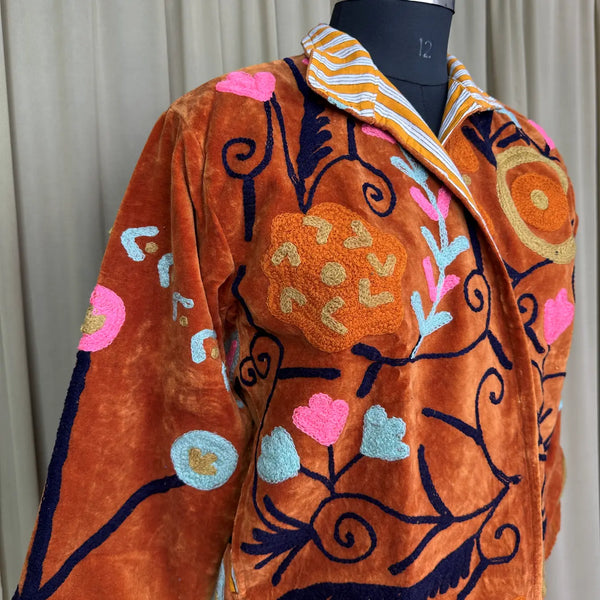 Wrap yourself in timeless artistry with this handcrafted Hand Embroidered Velvet Suzani Jacket, a stunning blend of boho charm and royal elegance. Each piece is meticulously embroidered by skilled artisans, creating a one-of-a-kind floral pattern that transforms this jacket into wearable art. The rich Brwon velvet adds depth, luxury, and a soft drape, making it perfect for elevating everyday outfits or adding statement style to special occasions.