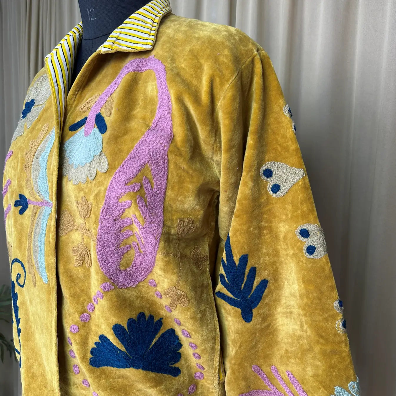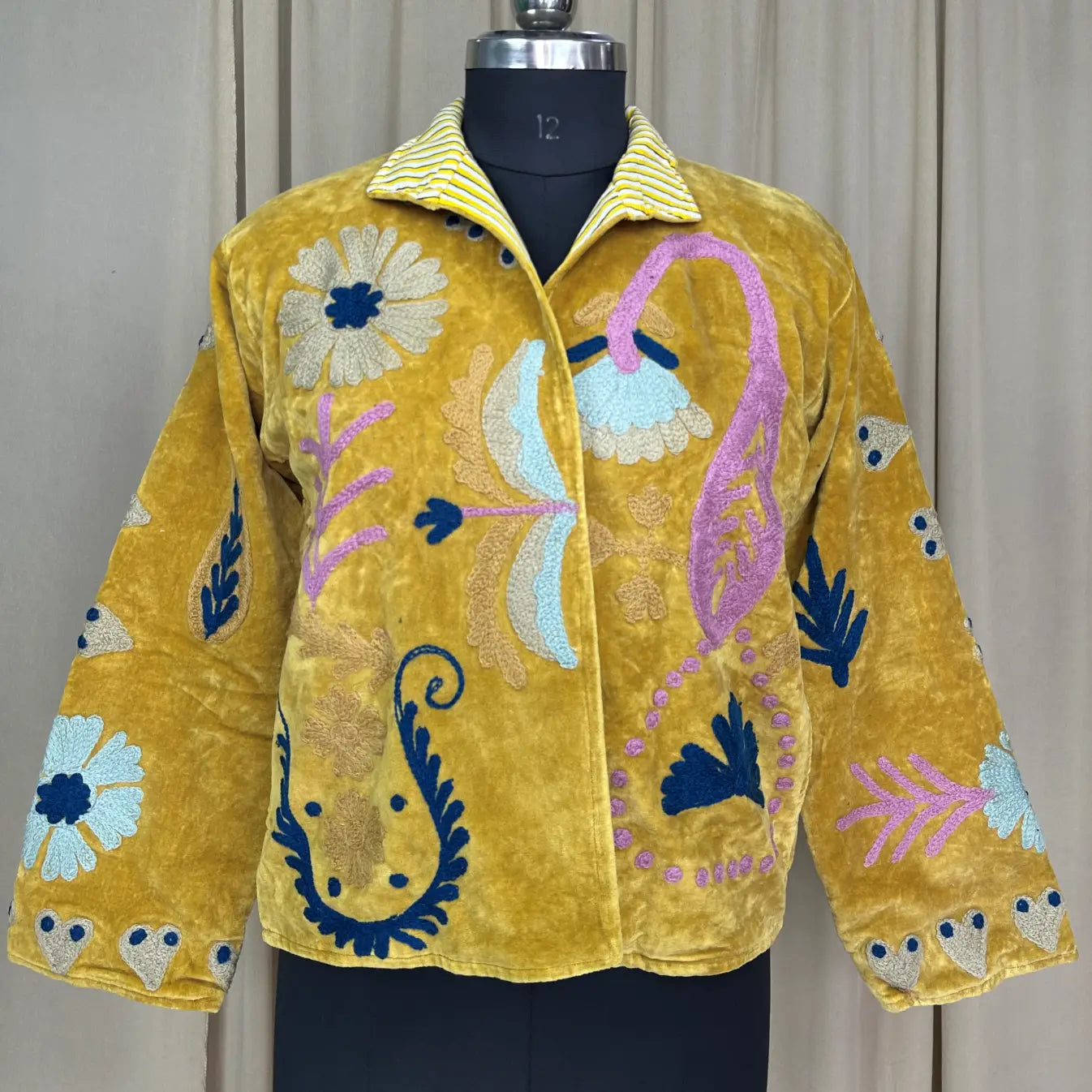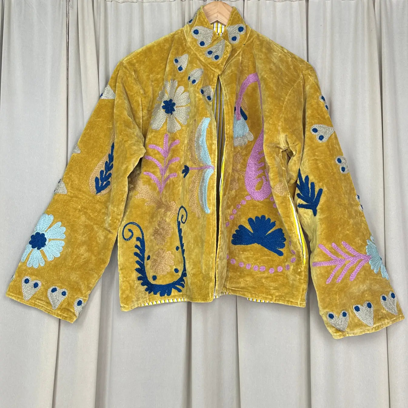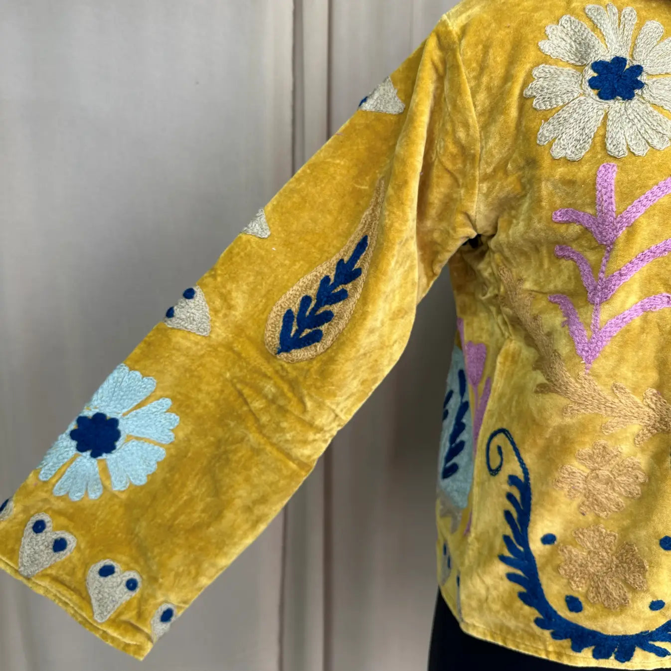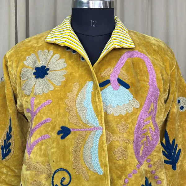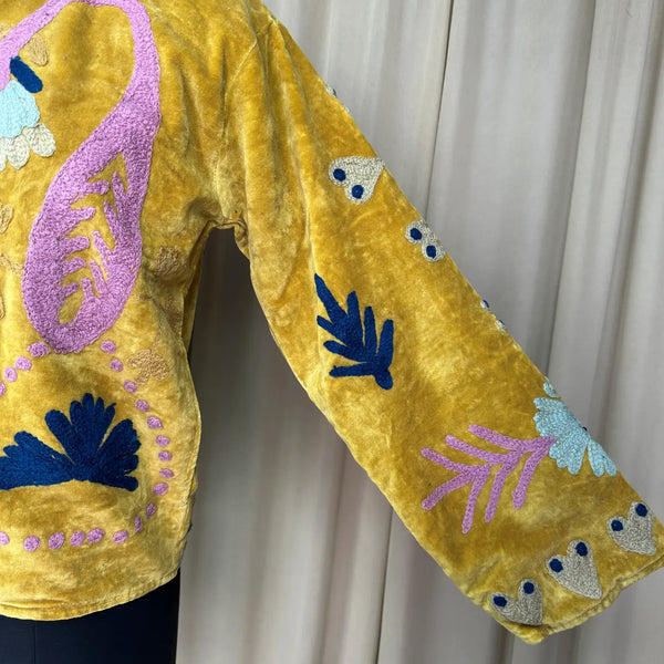 Boho Hand Embroidered Velvet Suzani Jacket Yellow Floral Open Front Coat Winter Wear Free Size Robe Retro Chic Free Size Robe Blazer for Her
