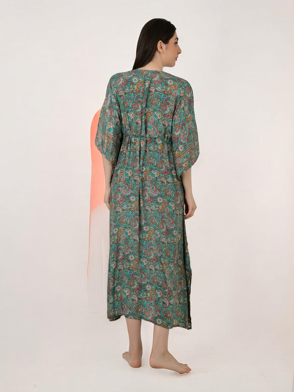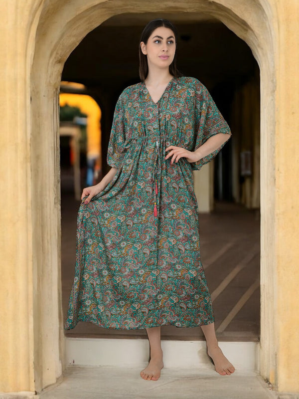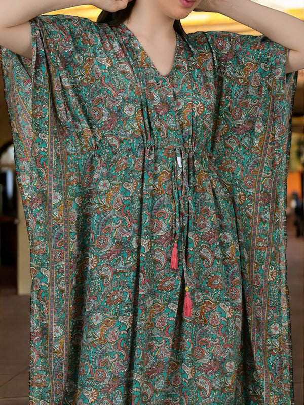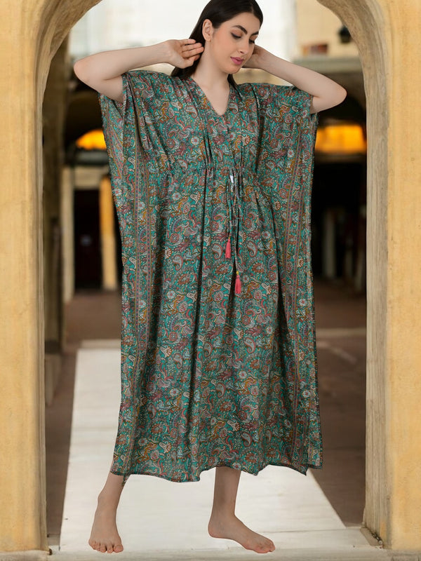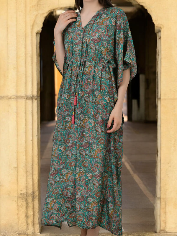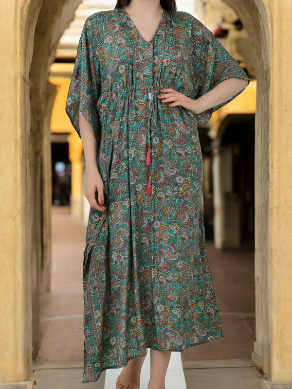 Women Silk Kaftan | Teal Green Paisley Caftan #1624