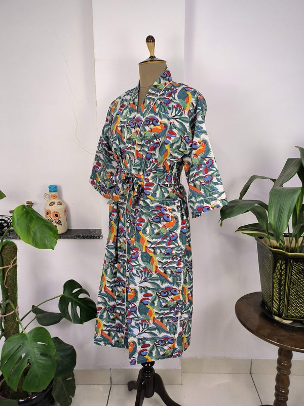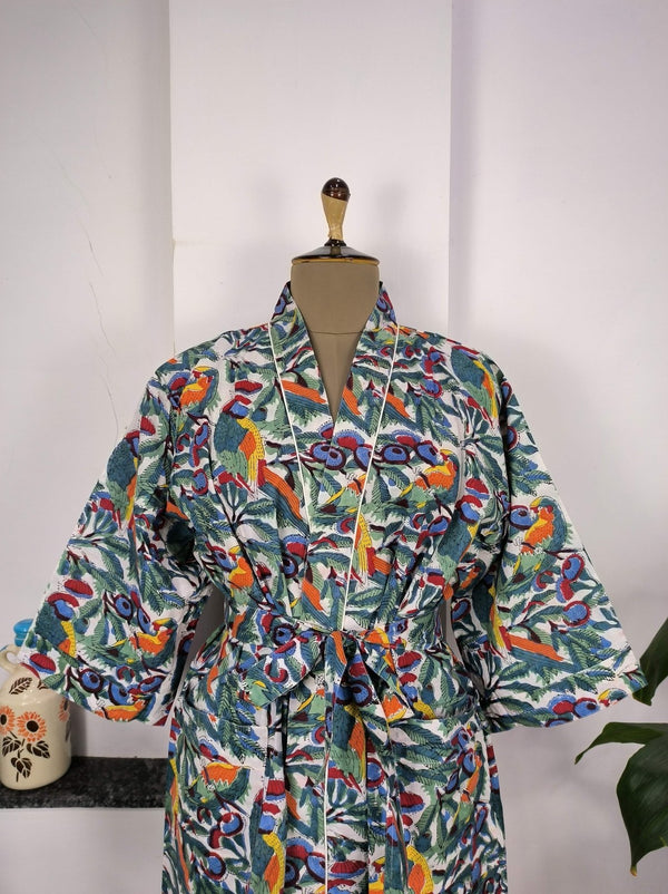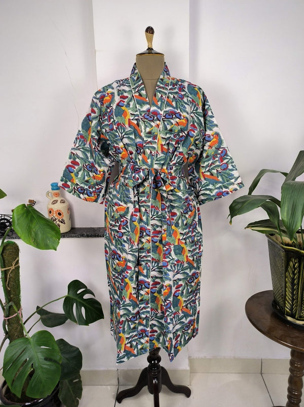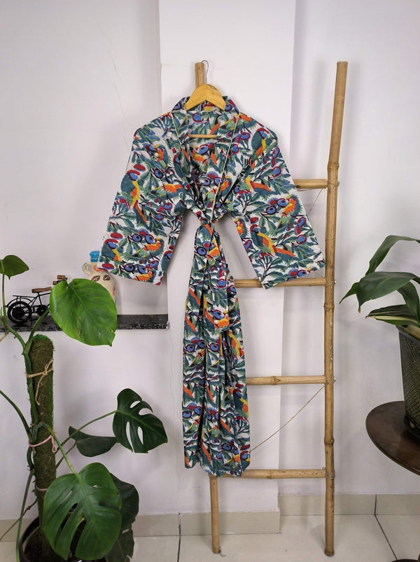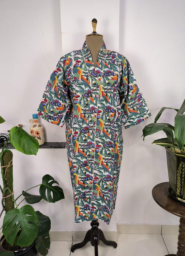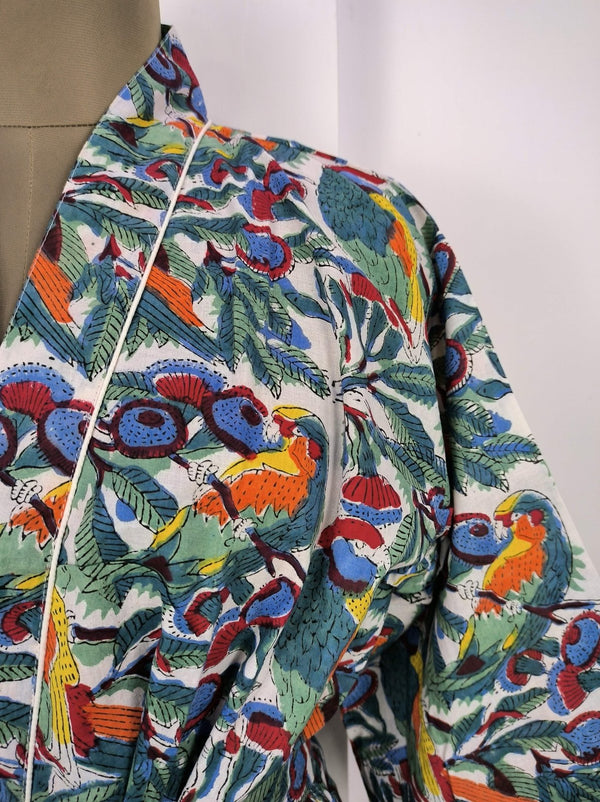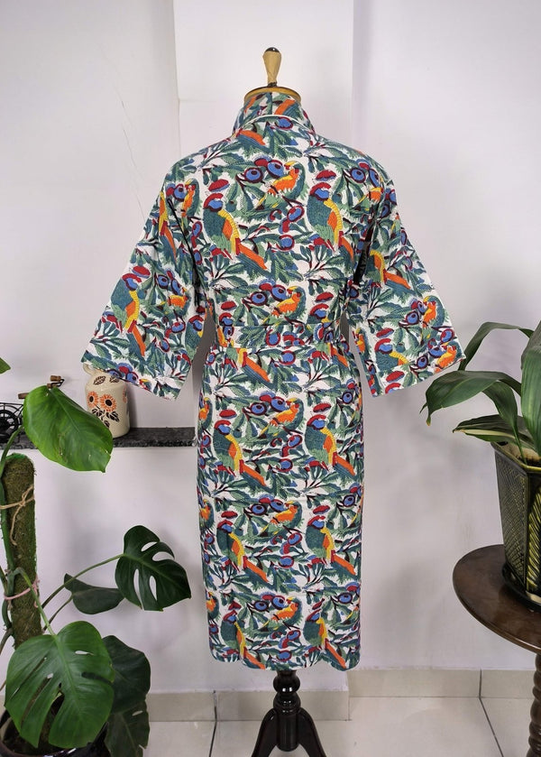 Boho House Robe Indienne Imprimée à la Main Coton Kimono Parrot Bird Print | Parfait pour les vacances d'été de luxe à la plage, superbe robe pour yacht.