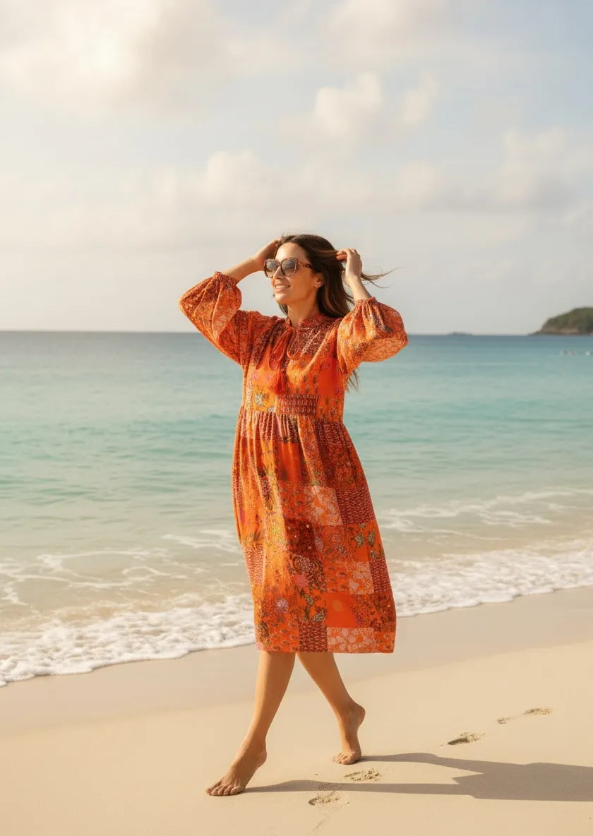 Beautiful Handprints made in small villages of Rajasthan using wooden blocks and natural dyes turned into gorgeous Dress.