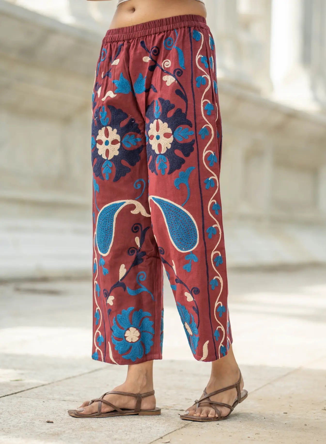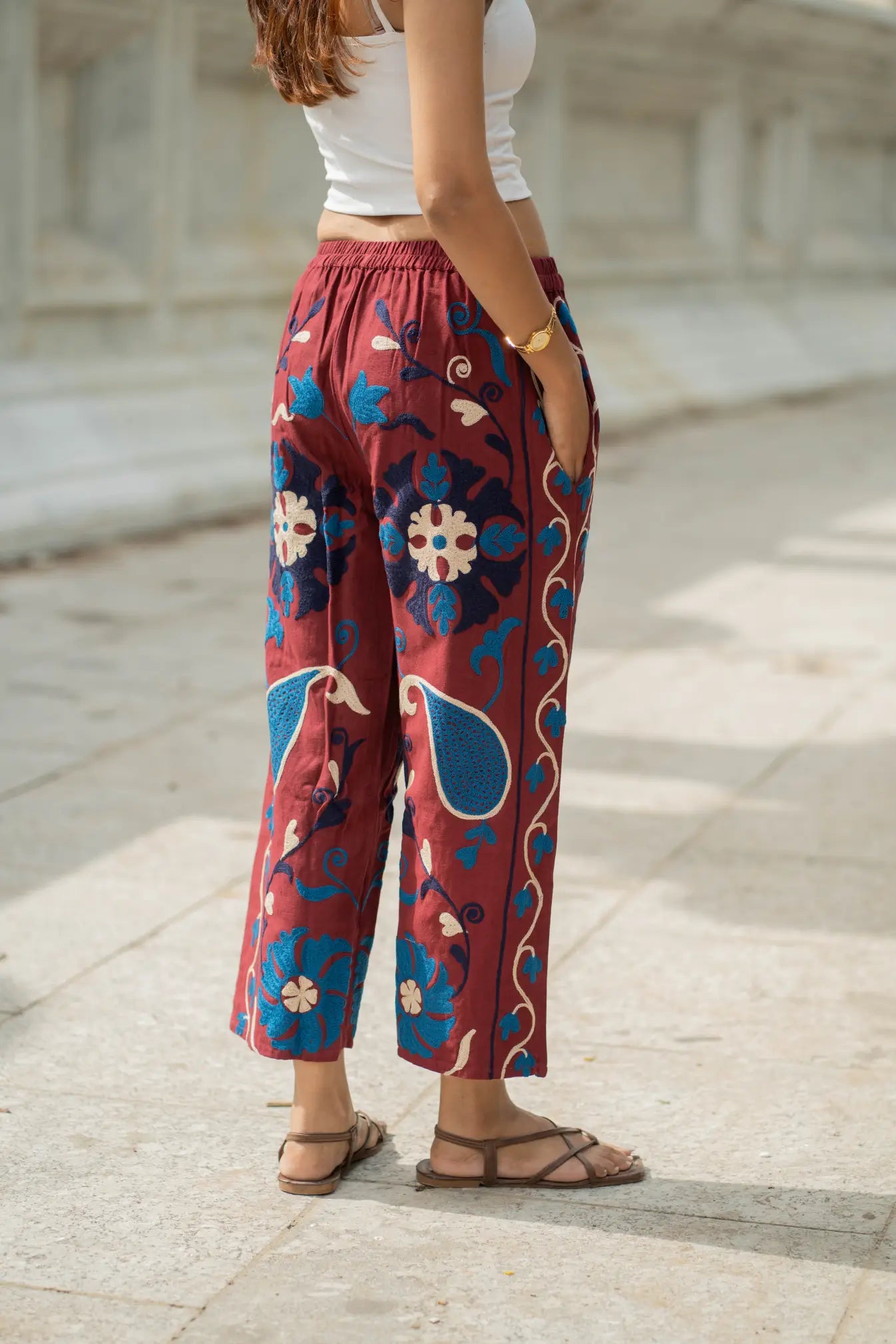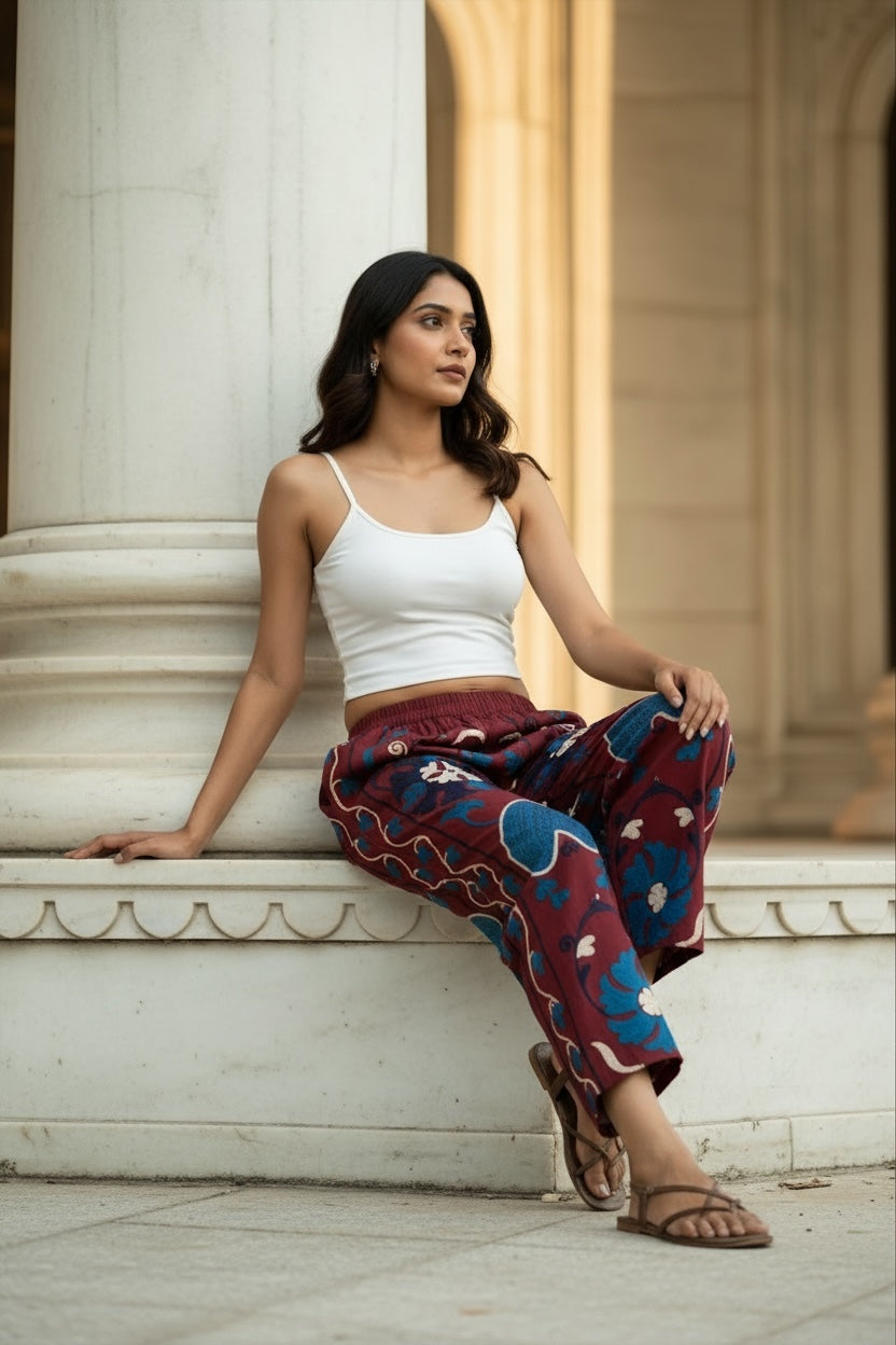 Artisan Craftsmanship: Each pant is meticulously hand-embroidered using the traditional Suzani technique, where every motif is stitched by hand with care and precision. The result is a one-of-a-kind piece that celebrates India’s rich textile artistry.