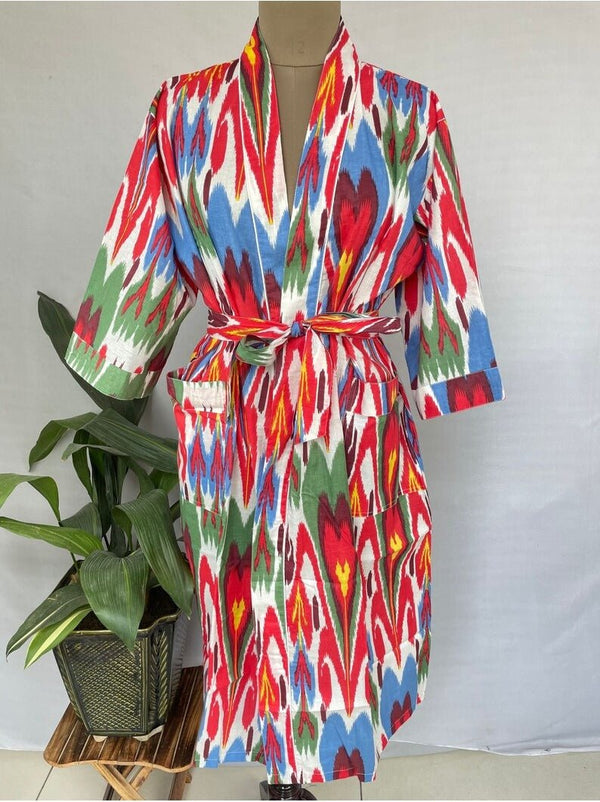 Pur coton Kimono indien imprimé à la main Boho House Robe Robe d’été | Rouge Bleu Vert Irate Hearts Beach Coverup/Comfy Maternité Maman Mariée