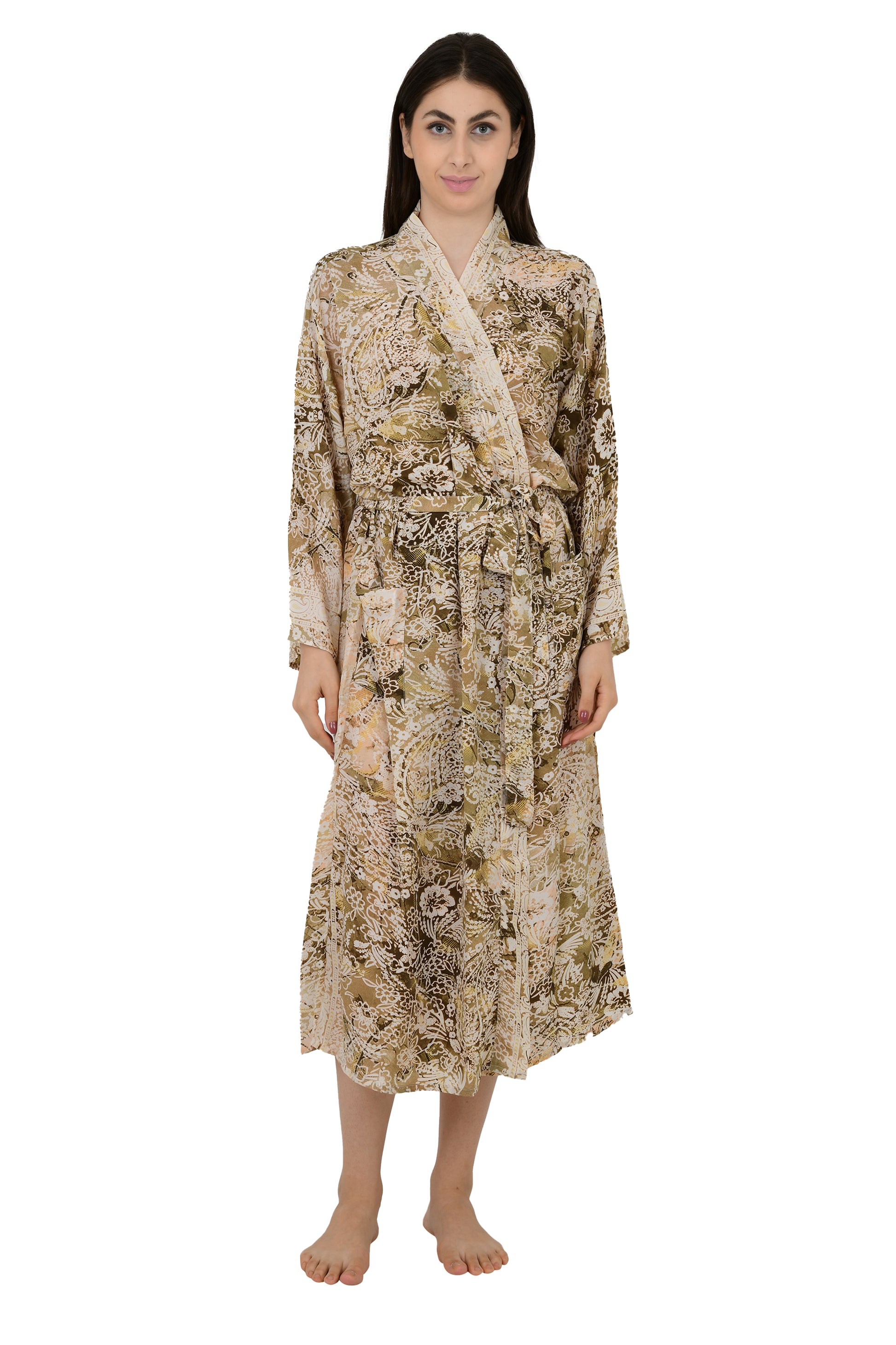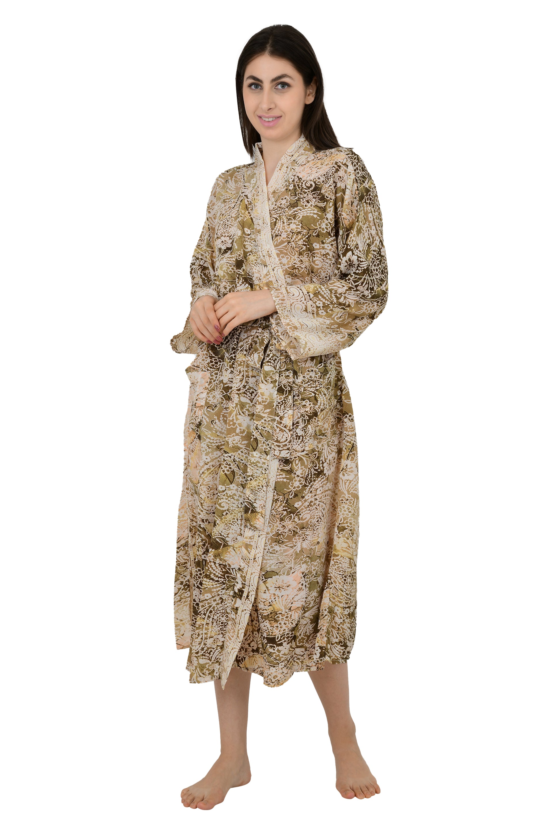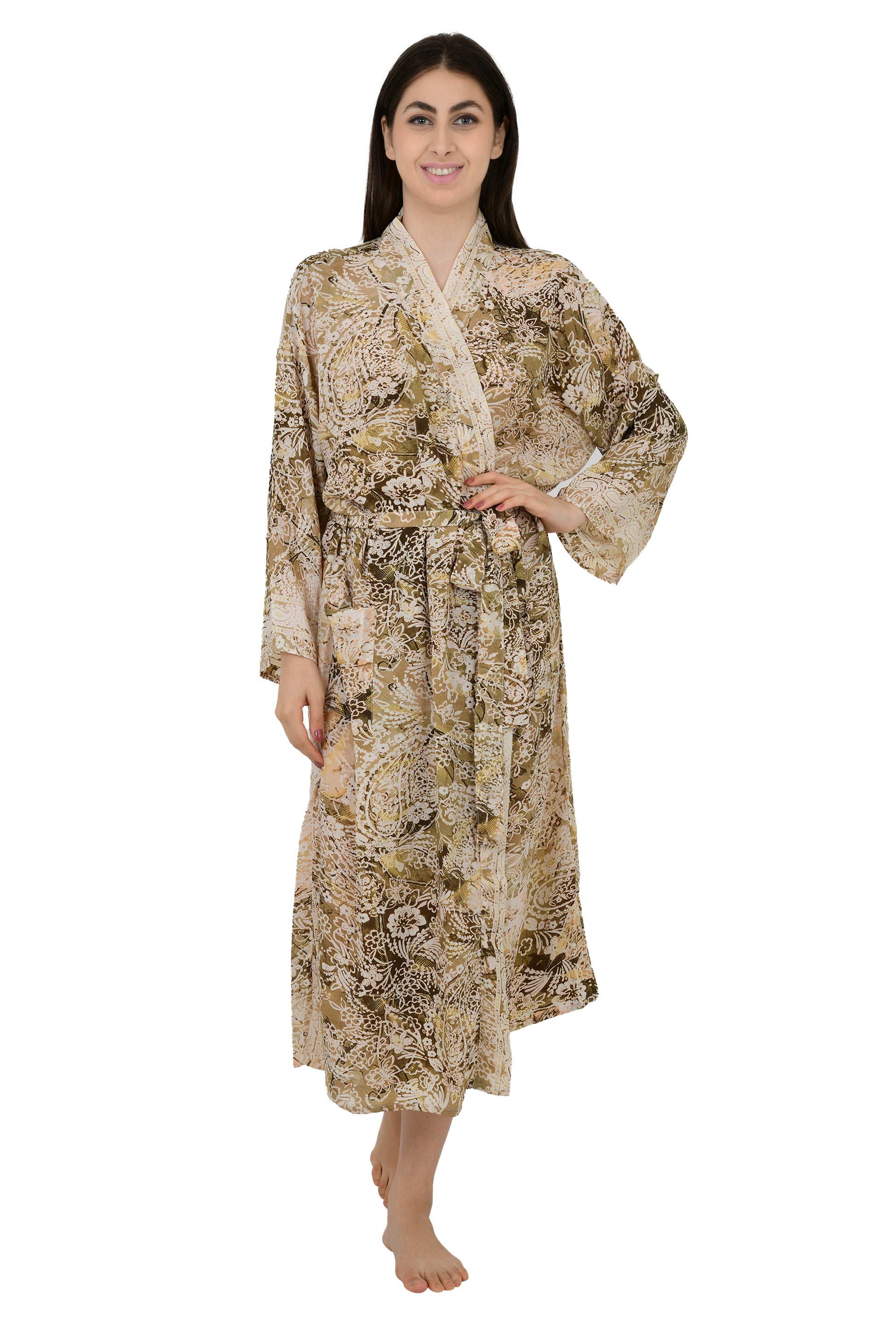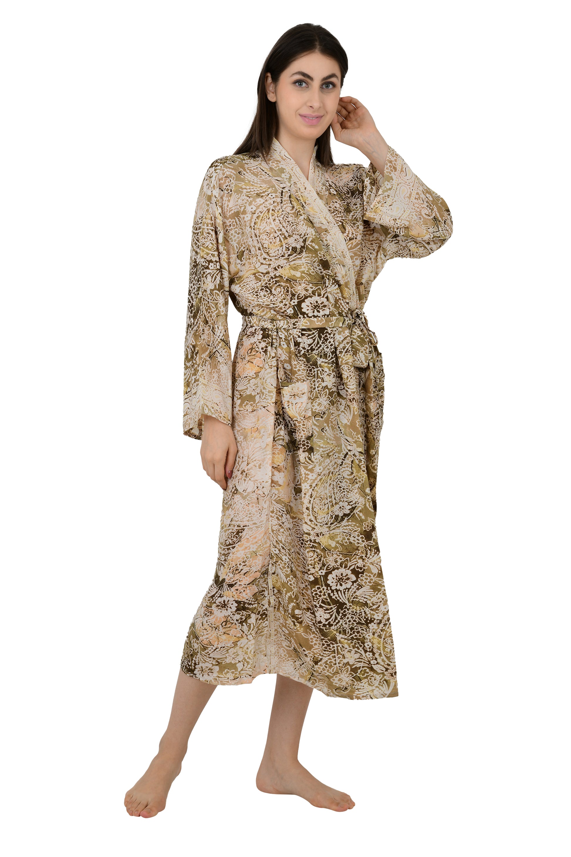 Bohemian New Silk Sari Kimono Women Regal House Beach Robe | Beige Brown Floral Luxury Anniversary Birthday Gift For Her