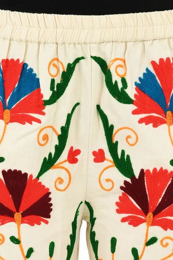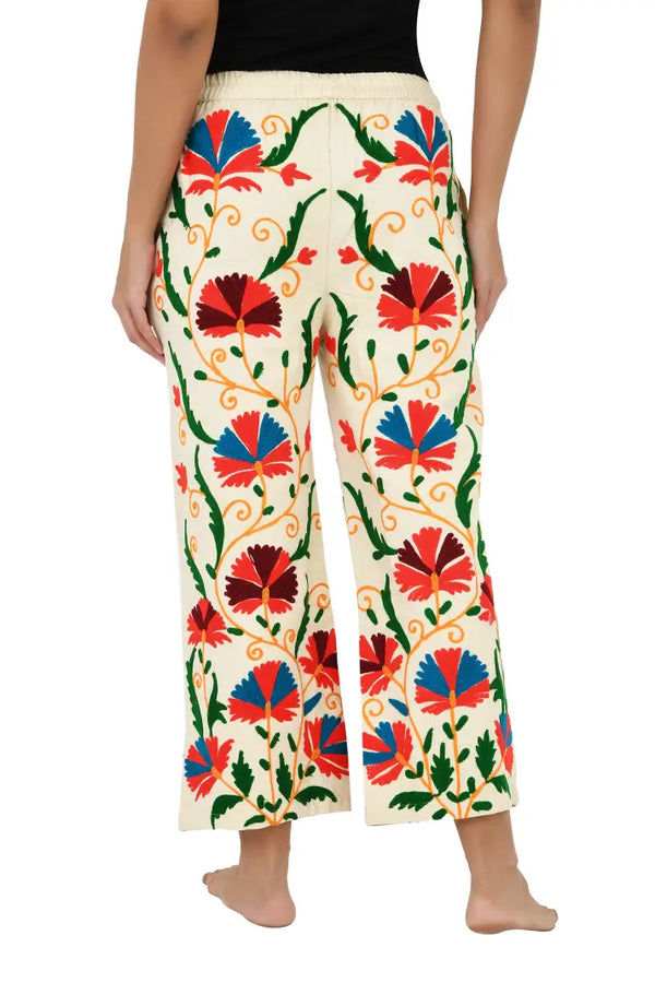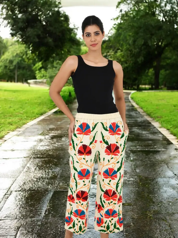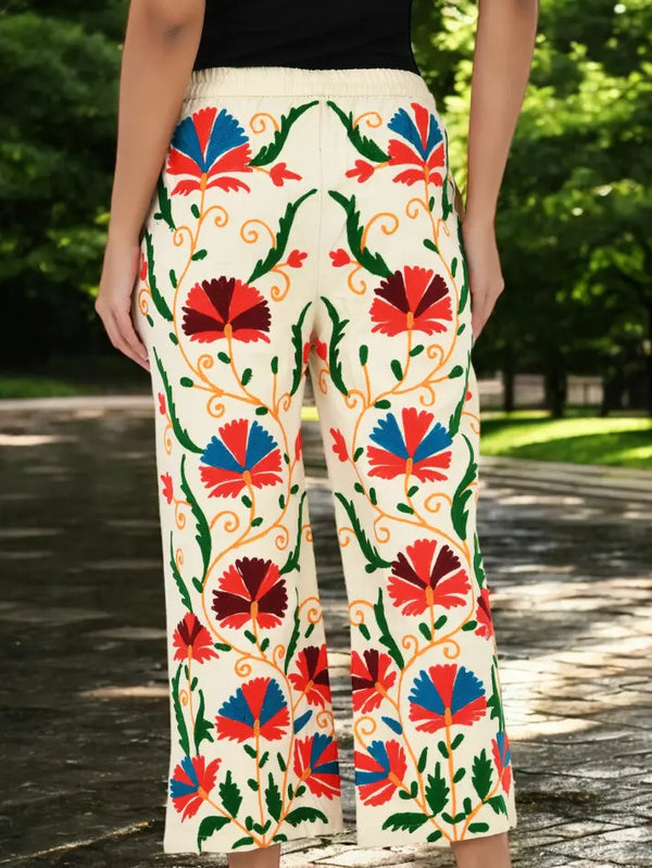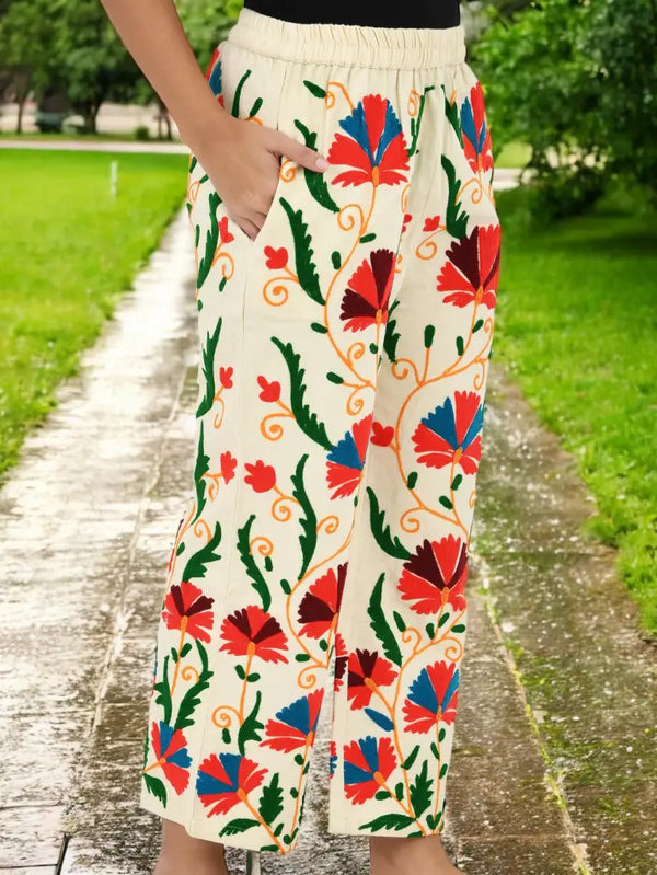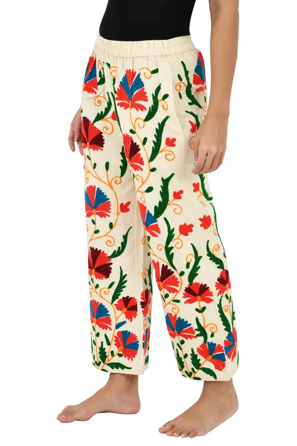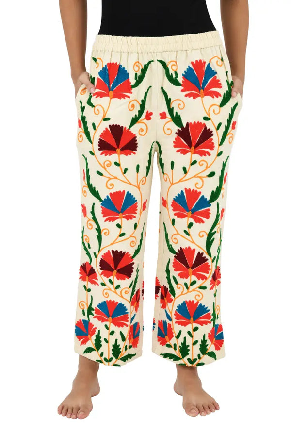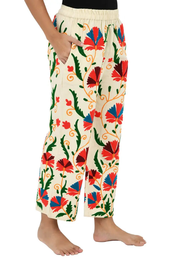 Boho Hippi Handmade Suzani Embroidered Pockets Trouser Comfy Fit Casual Wear Elastic Waist | Floral