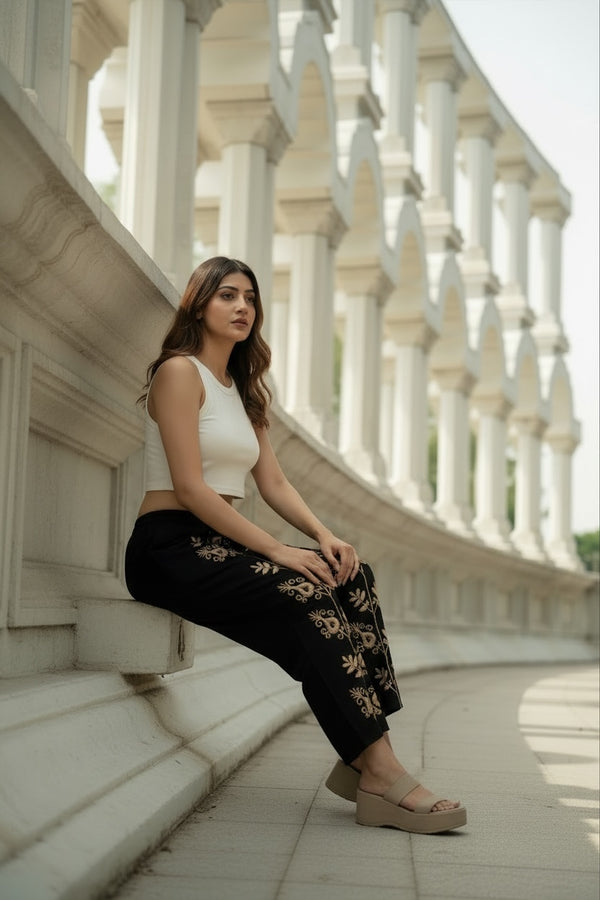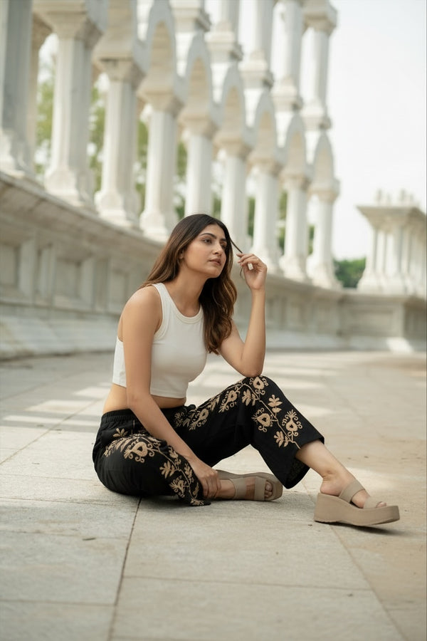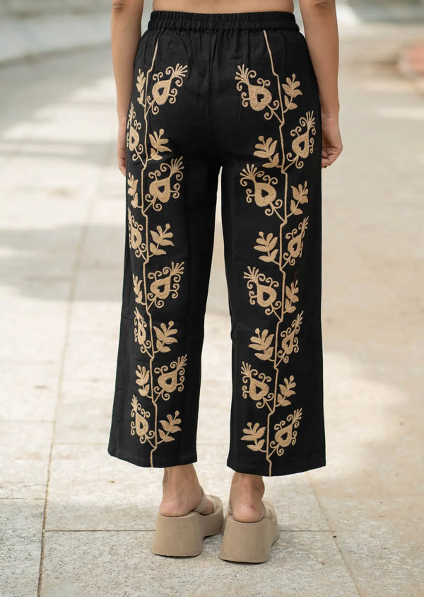 Artisan Craftsmanship: Each pant is meticulously hand-embroidered using the traditional Suzani technique, where every motif is stitched by hand with care and precision. The result is a one-of-a-kind piece that celebrates India’s rich textile artistry.