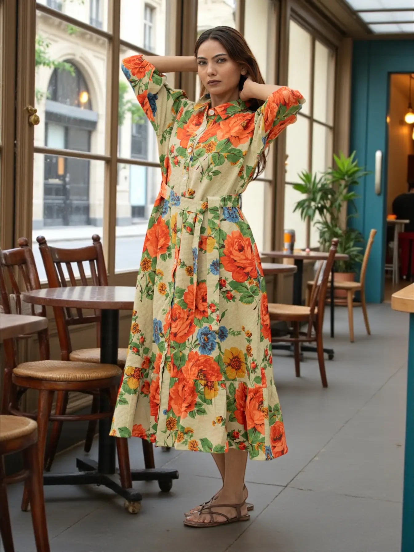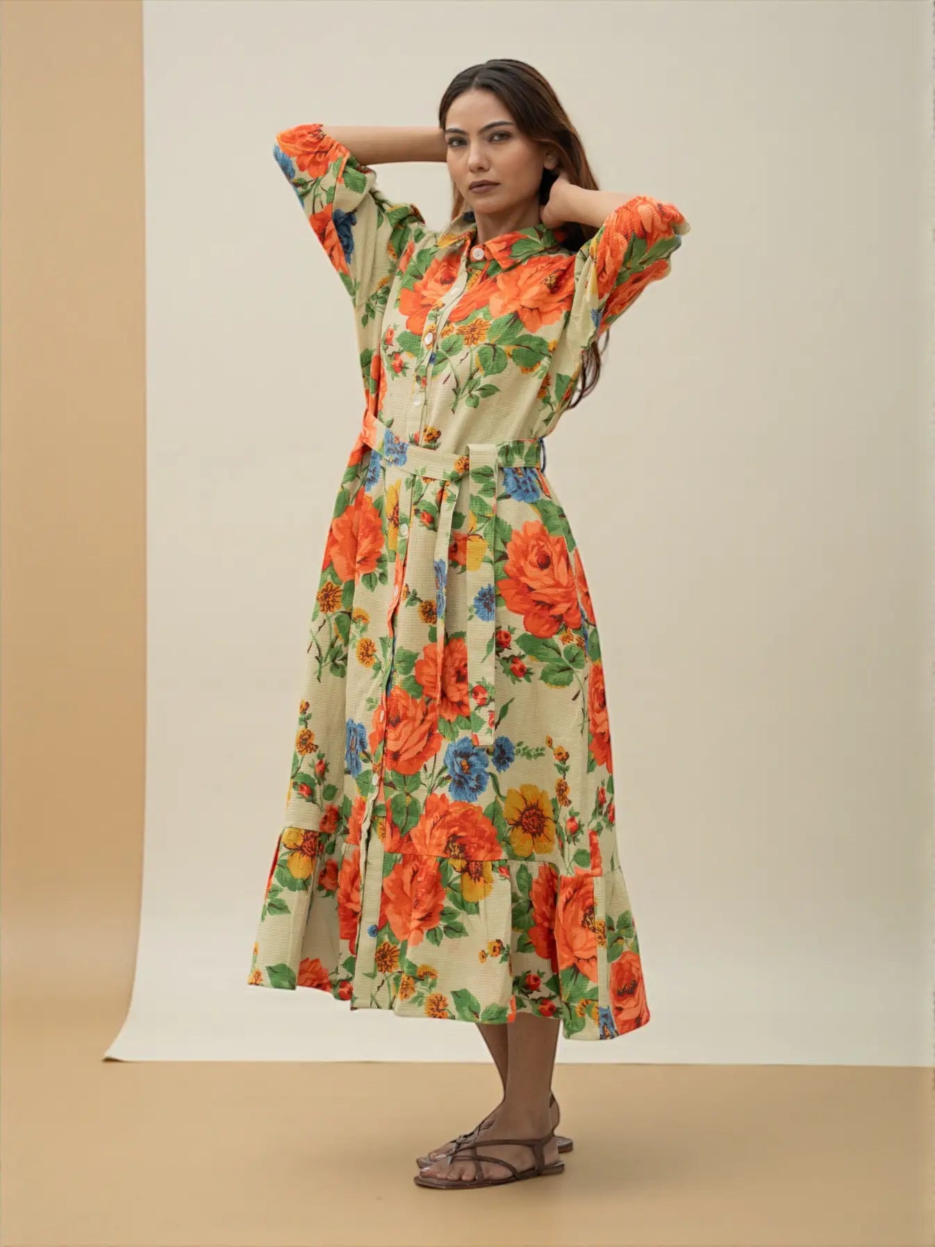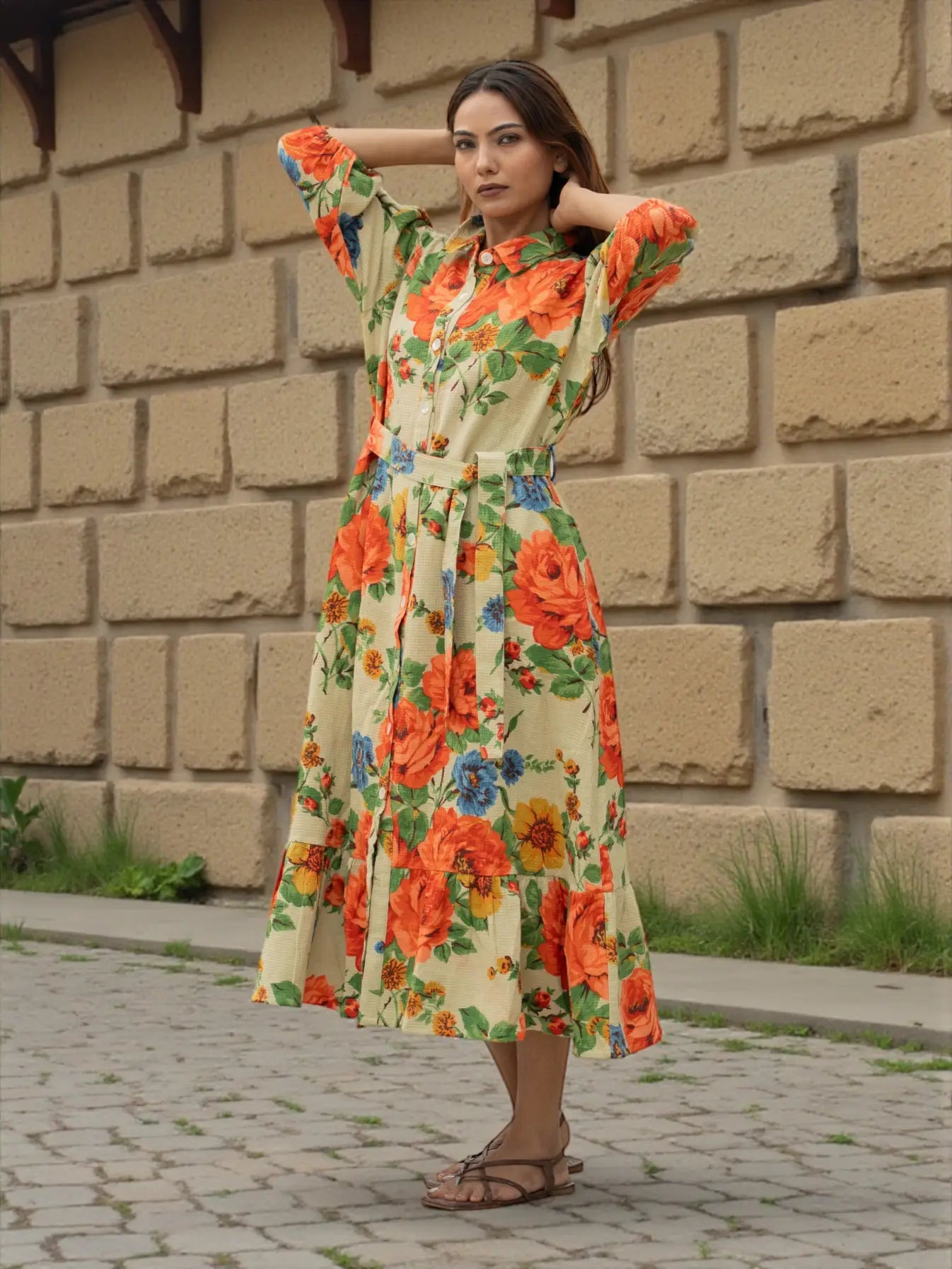 The design works beautifully as a cotton dress, summer dress, midi dress, mini dress, long dress, or relaxed summer tunic. Its soft color palette, earthy and colourful tones, and rose dream floral story give it an elegant yet comfy look suited for daywear, casual outings, and effortless bohemian wardrobes. Button closure detailing and functional side pockets enhance comfort and usability, while the handcrafted process reflects true ethical fashion values using friendly dyed fabric.