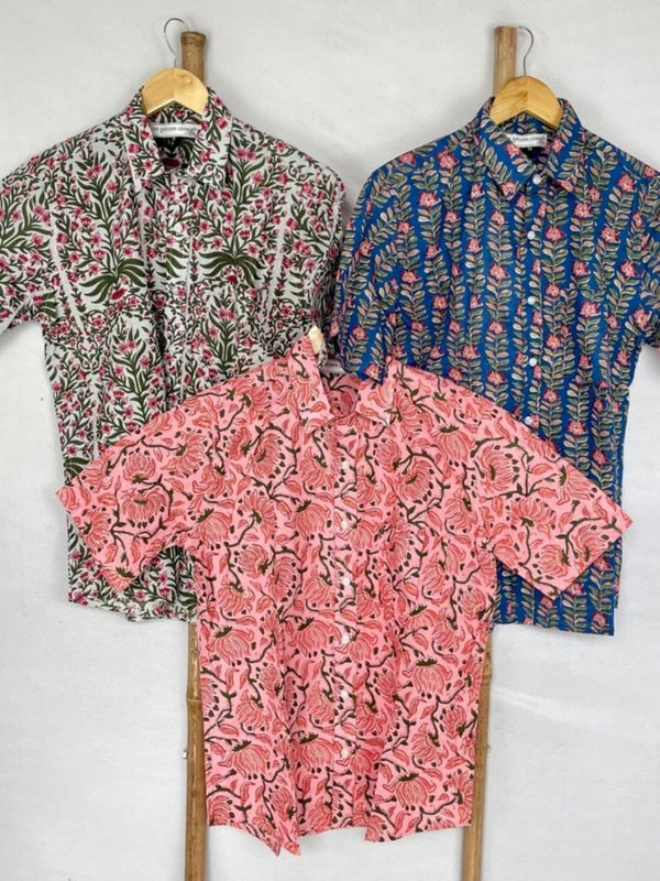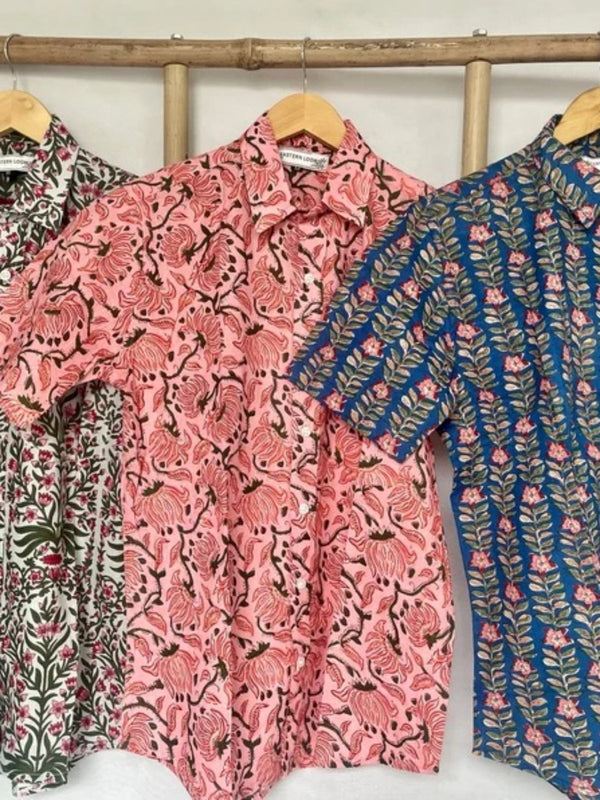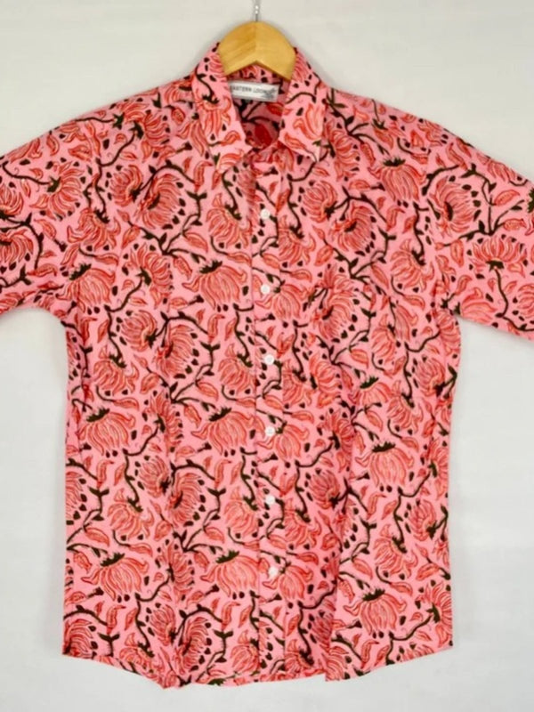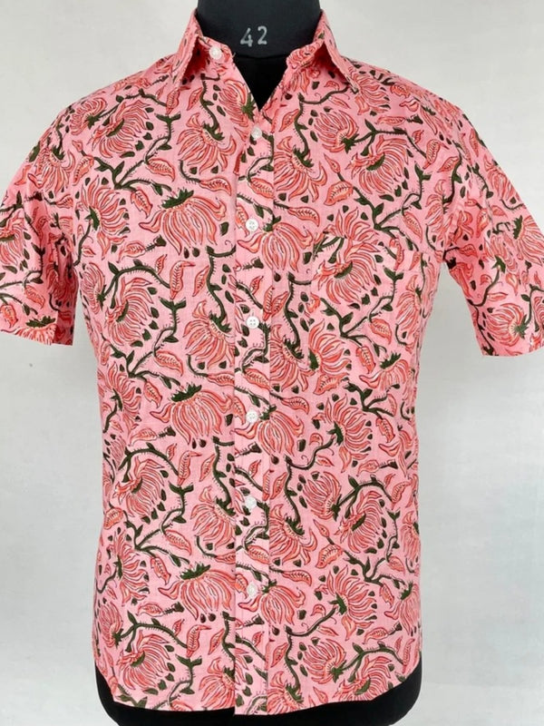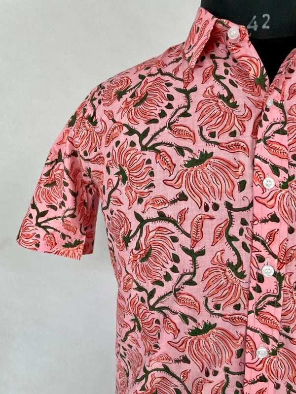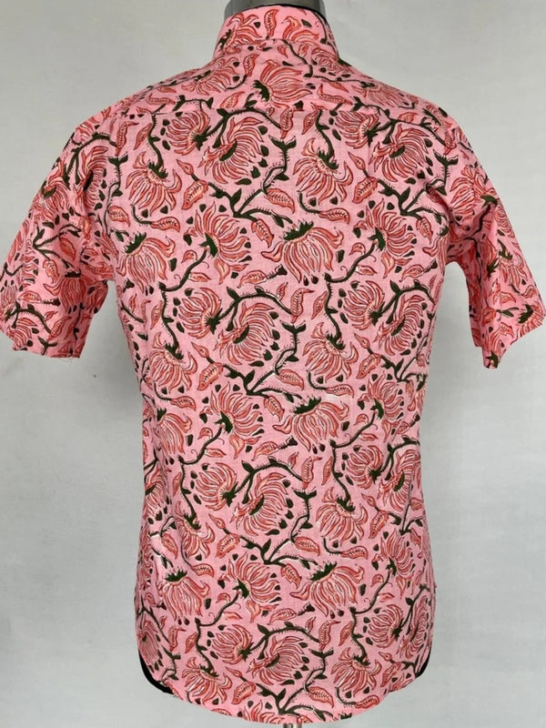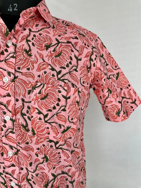Men's Shirt Pure Cotton Handblock Print | Summer Cool Casual Beach Wear, Comfortable Garden Picnic Urban Man Dad Gift | Flamingo Pink Lotus