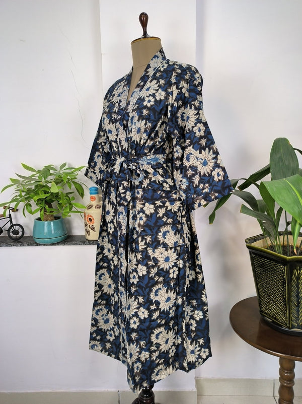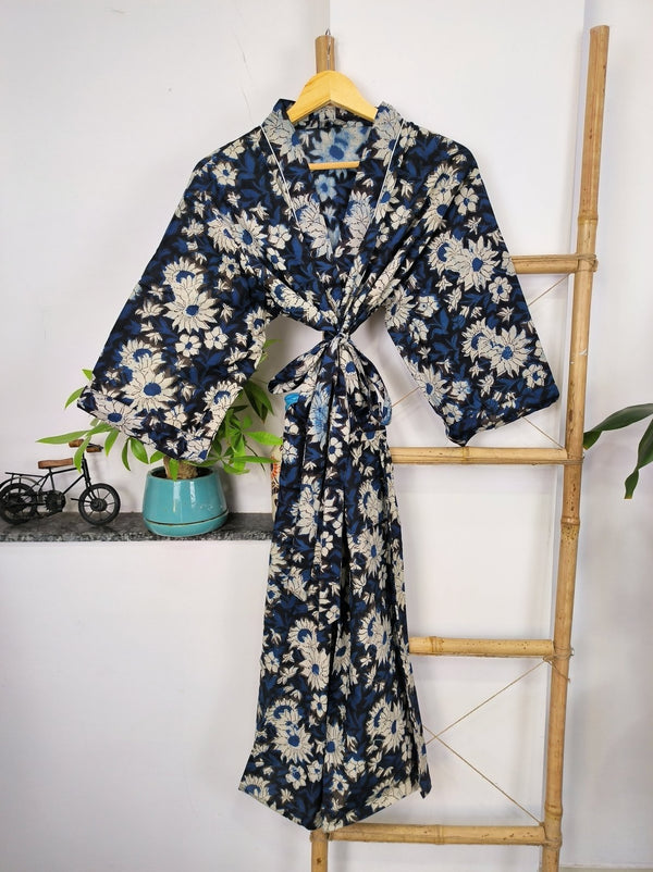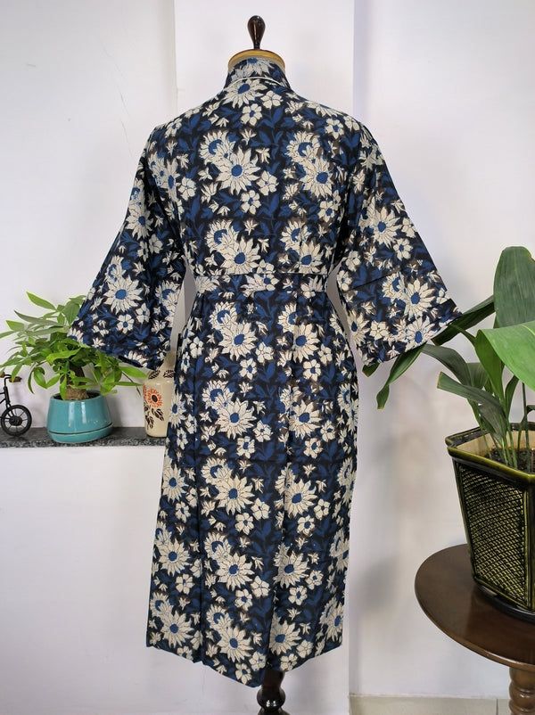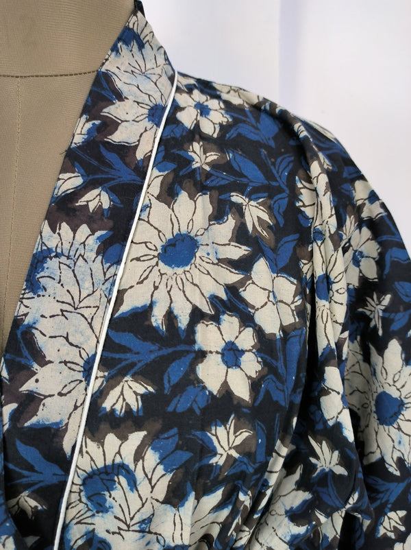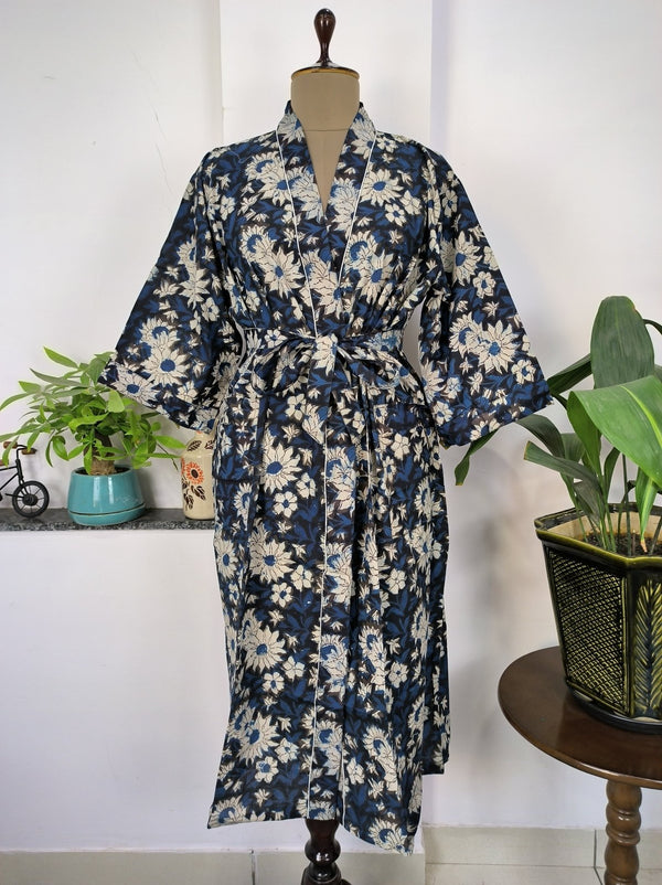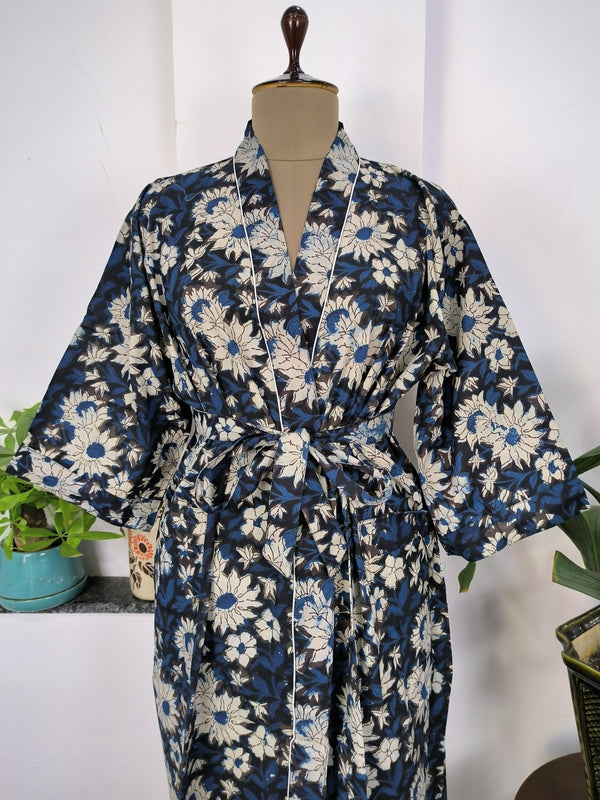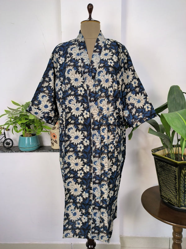 Pure Cotton Kimono Indian Handprinted Boho House Robe Summer Dress | Ivory White Yellow Flower Blossom Luxury Beach Holiday Yacht Cover Up