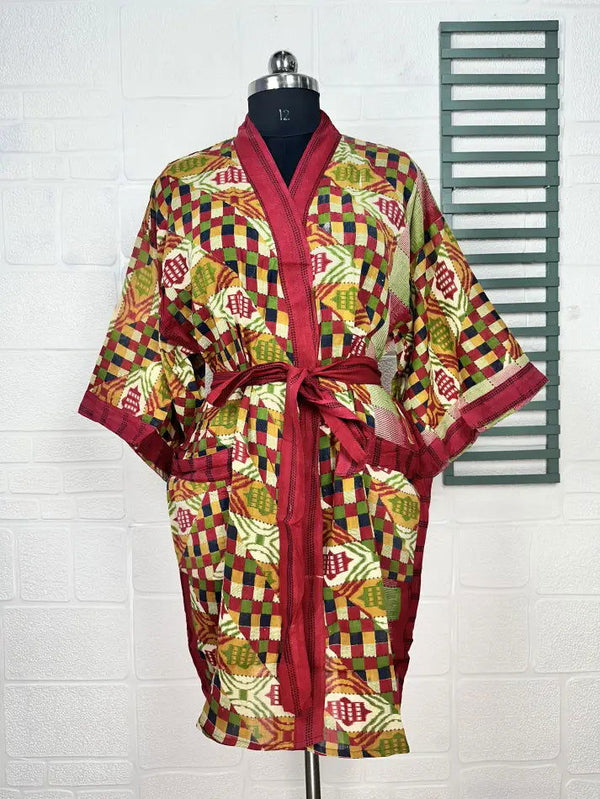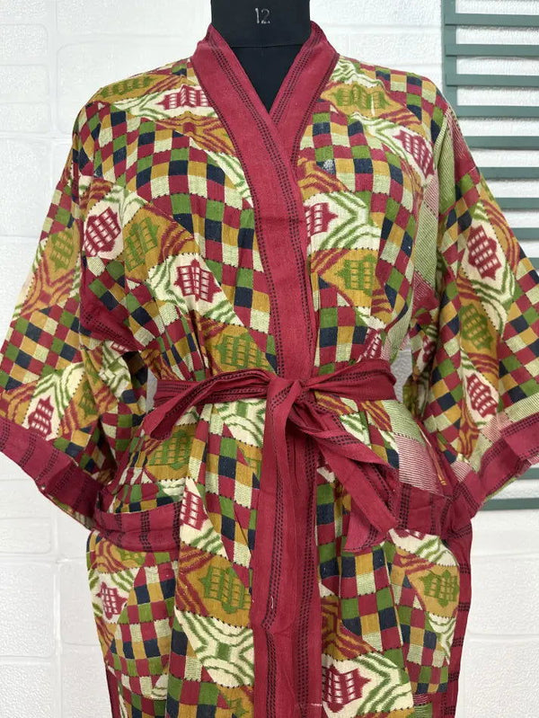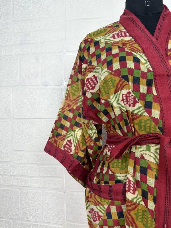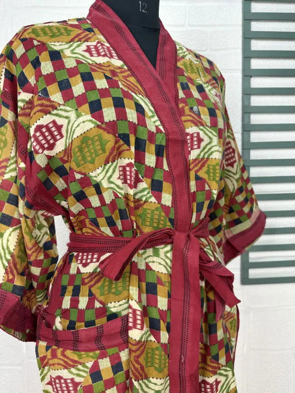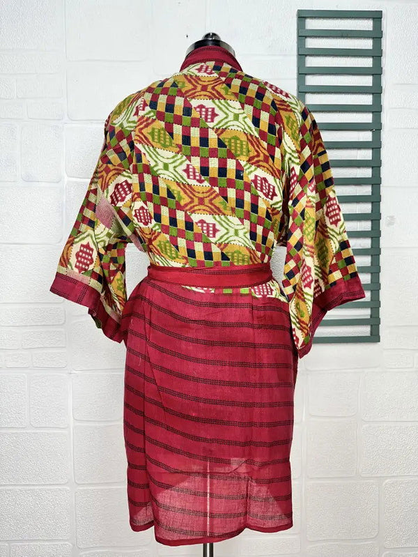 Recycled Pure Cotton Vintage Kimono Open Jacket Boho Summer TieDye House Robe, Beach Coverup | Beige Red Geometric Style Print