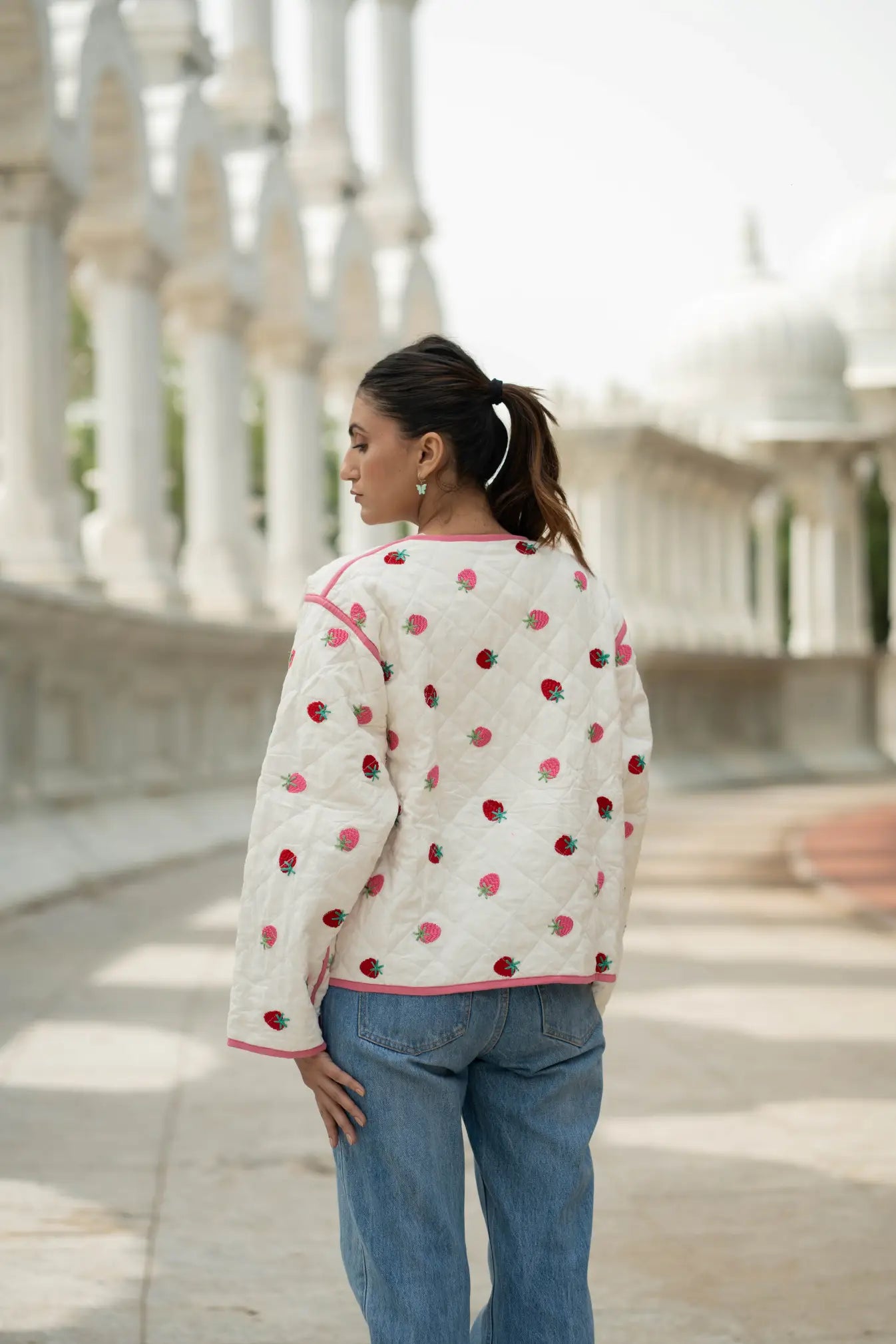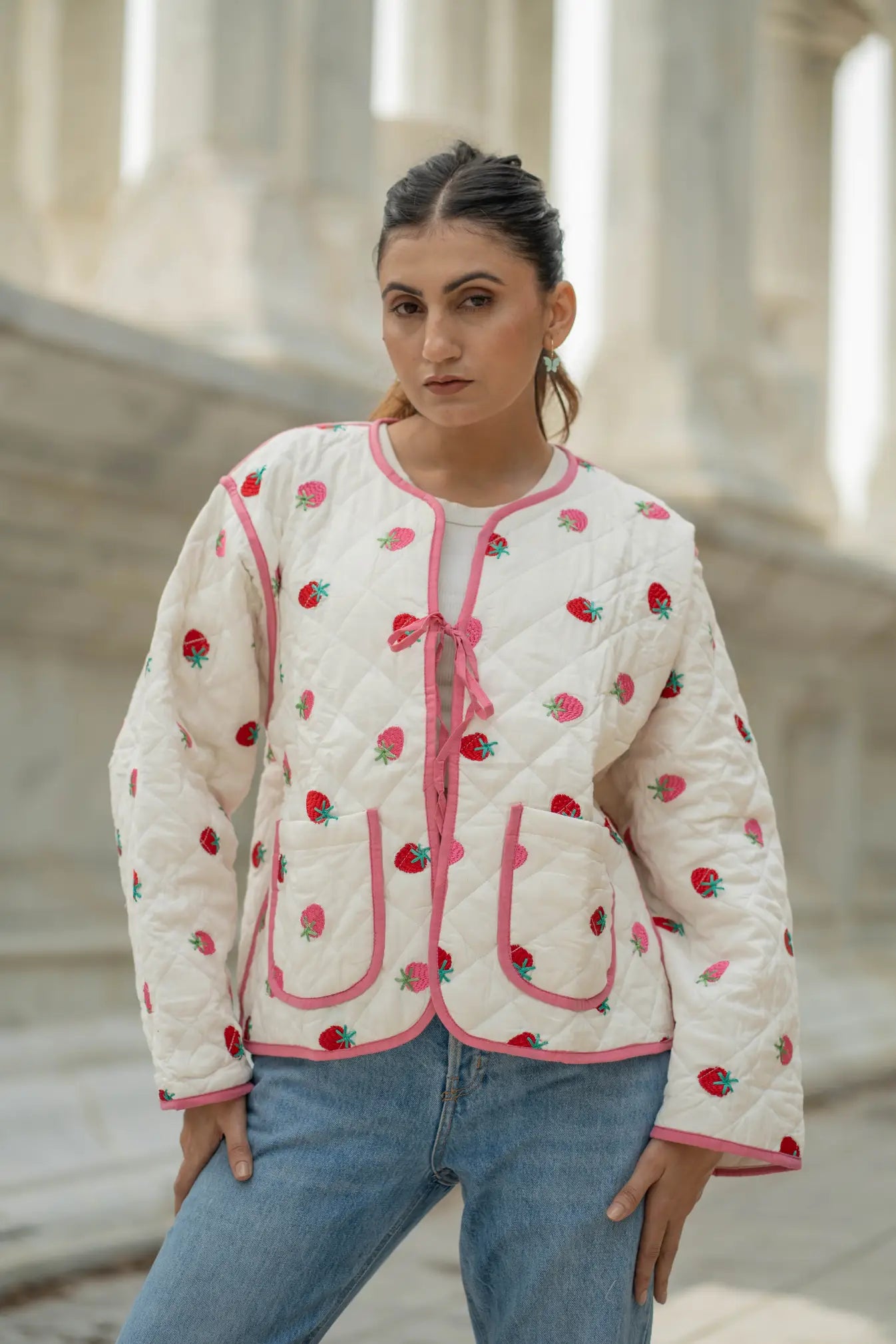 This white cotton quilted Kantha jacket is a celebration of slow fashion, blending traditional hand quilting with a modern boho chic silhouette. Designed as a short kimono-style coat, it features delicate strawberry hand embroidery and a striking pattern on one side, creating a polished yet artistic statement for everyday wear.