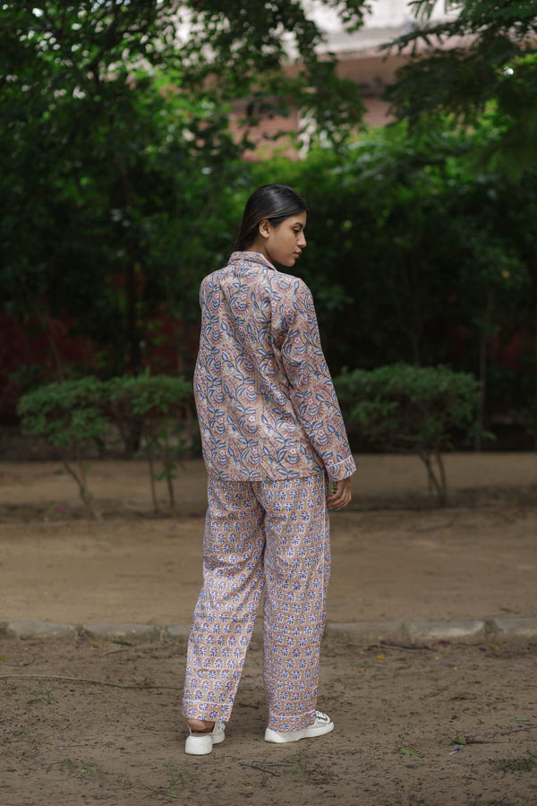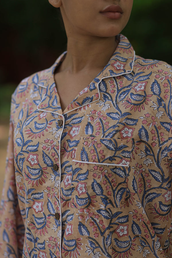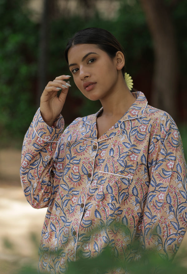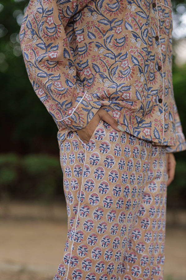 Women’s 100% Cotton Pajama Set, Handblock Artisanal Floral Print Nightwear, Soft Breathable PJs with Pockets, Gardenia Co-Ord Set Loungewear